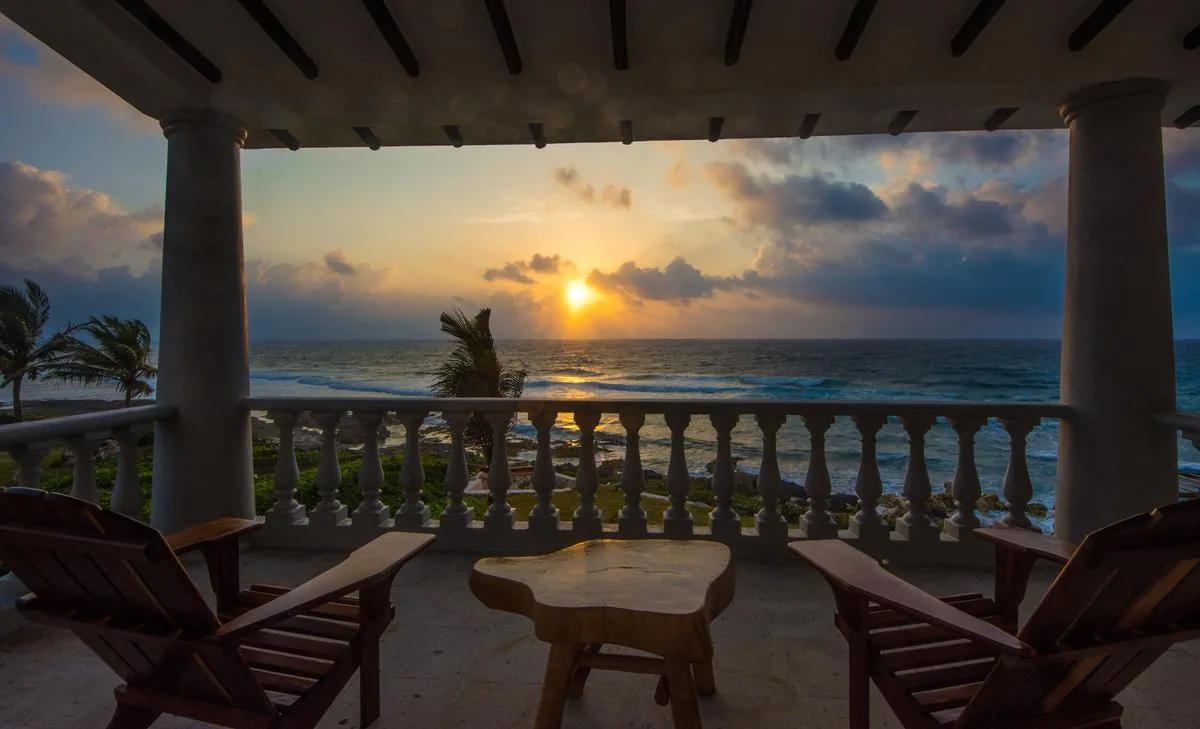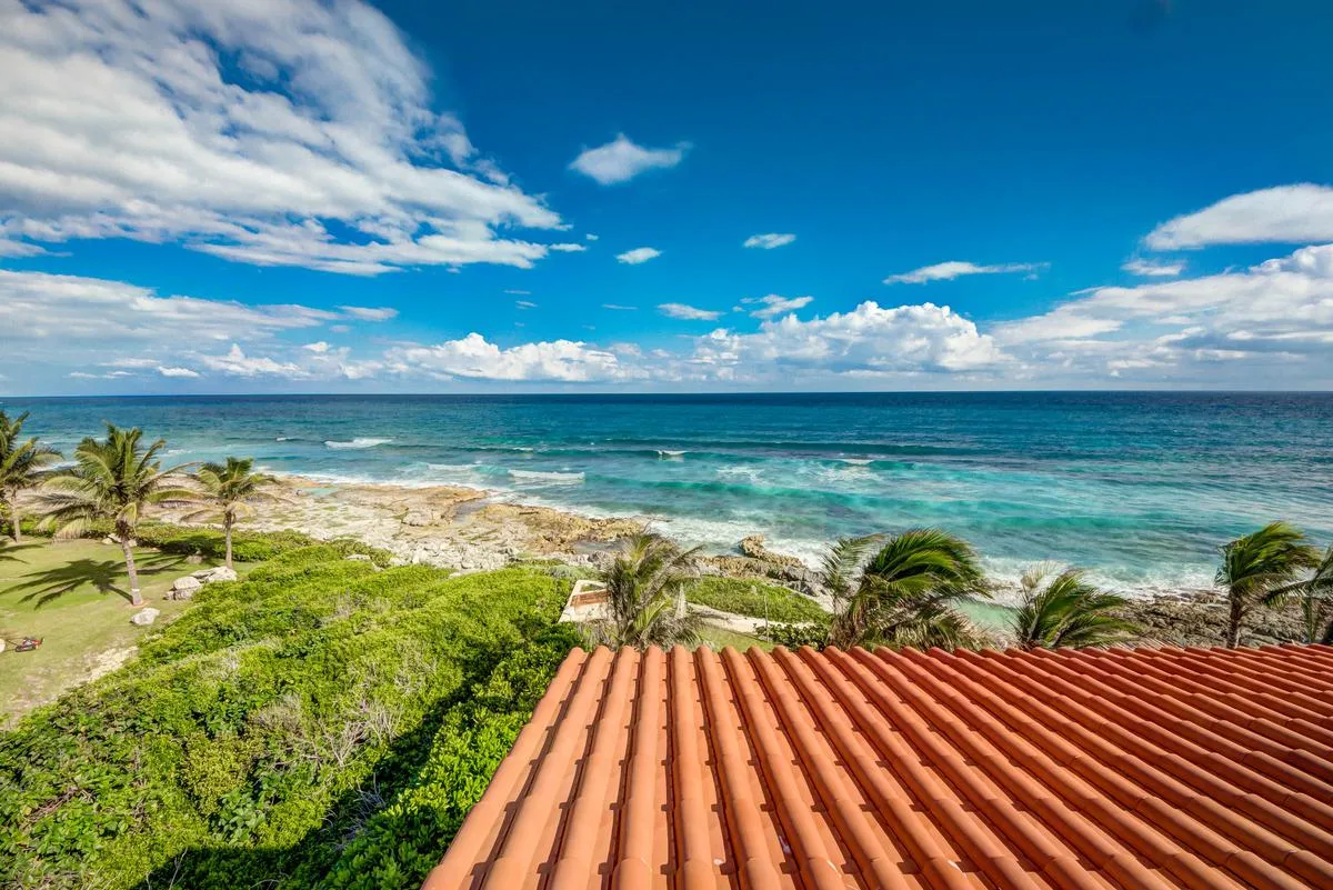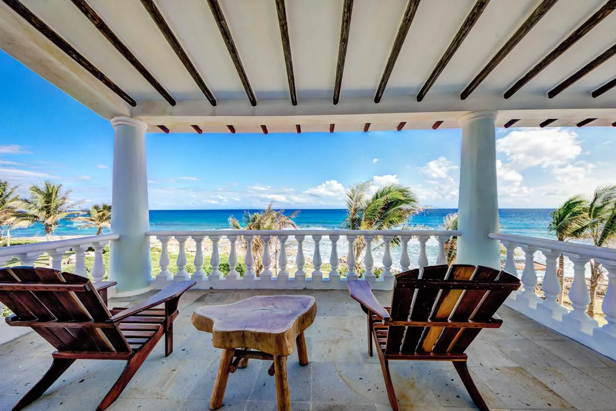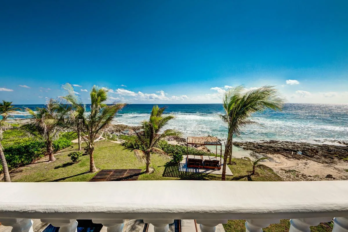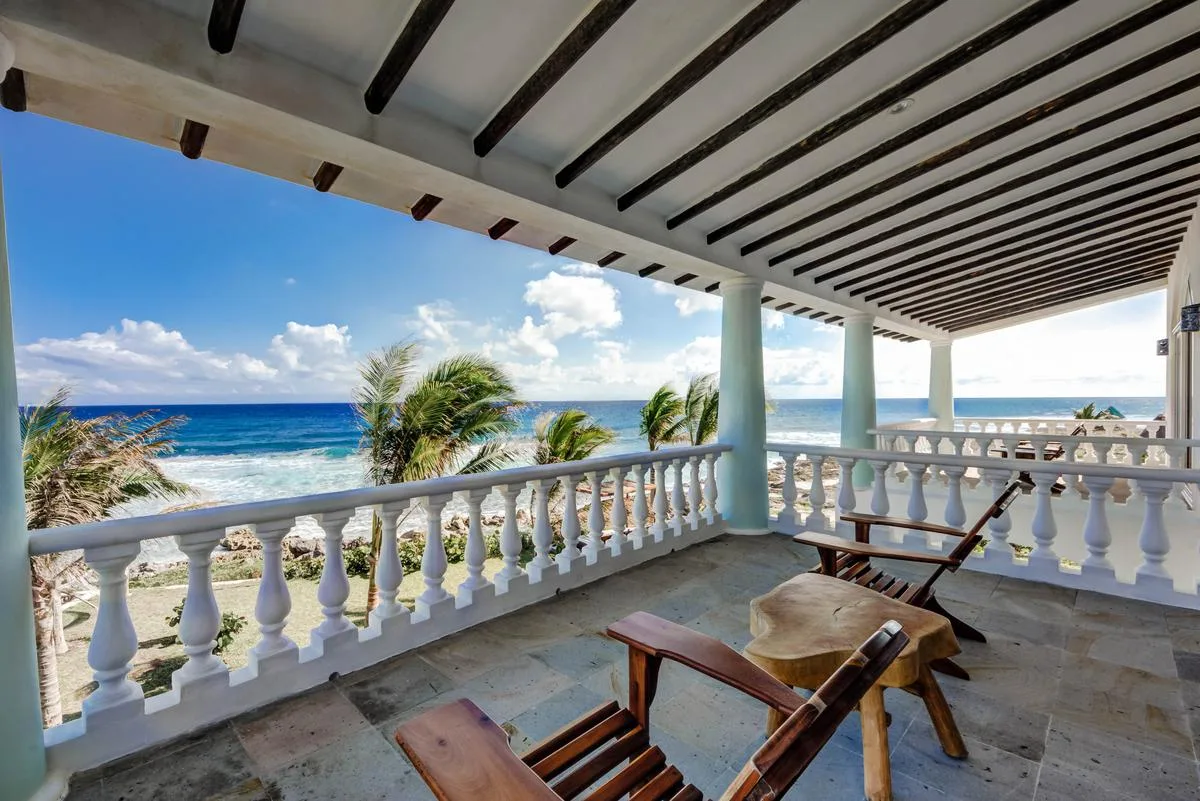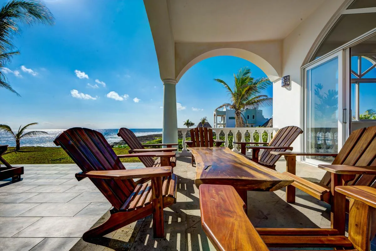 The villa offers a large patio suitable for relaxation and sunbathing, along with five balconies that provide ocean views. The location provides privacy and security, with dense Mayan jungle on one side and the ocean on the other.