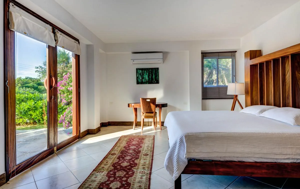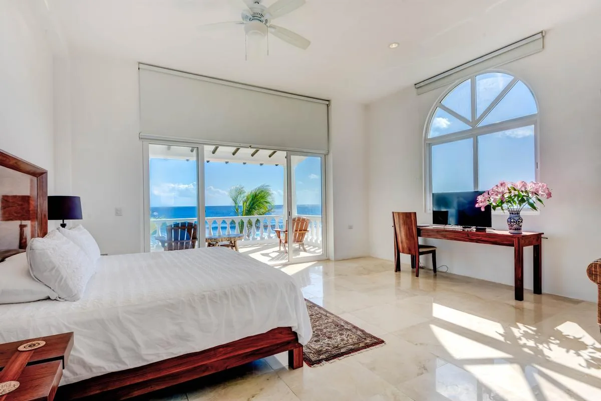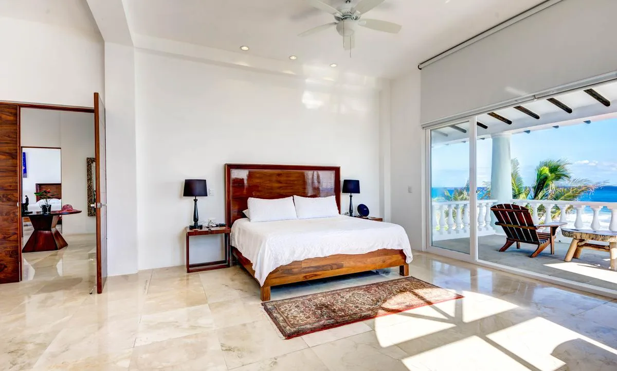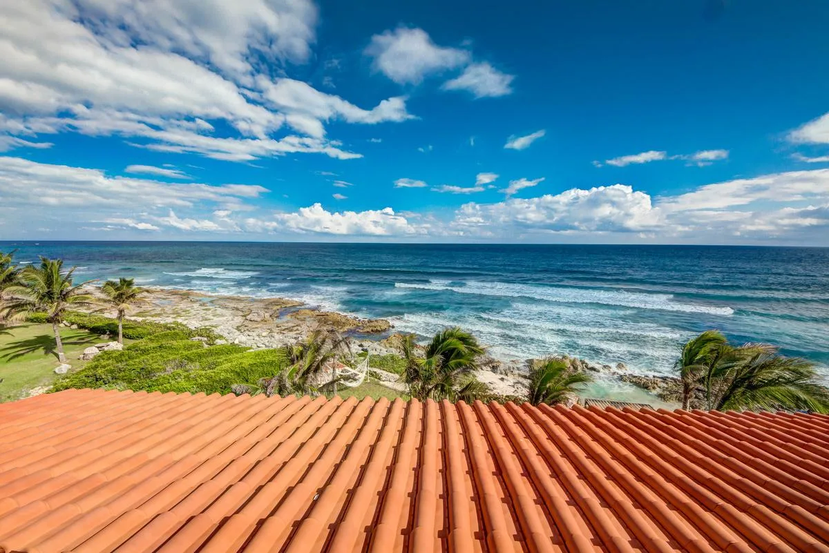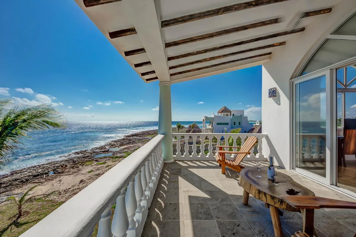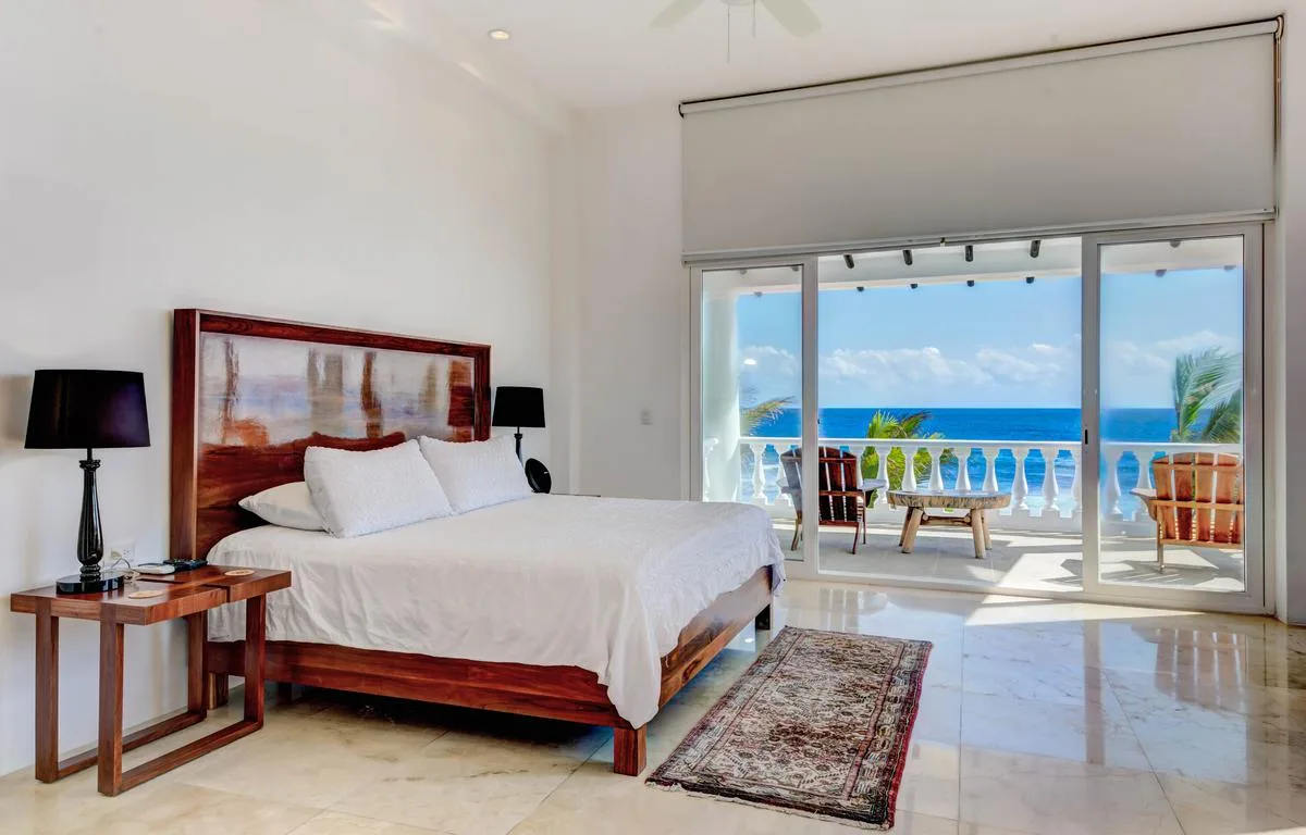 The villa offers a large patio suitable for relaxation and sunbathing, along with five balconies that provide ocean views. The location provides privacy and security, with dense Mayan jungle on one side and the ocean on the other.