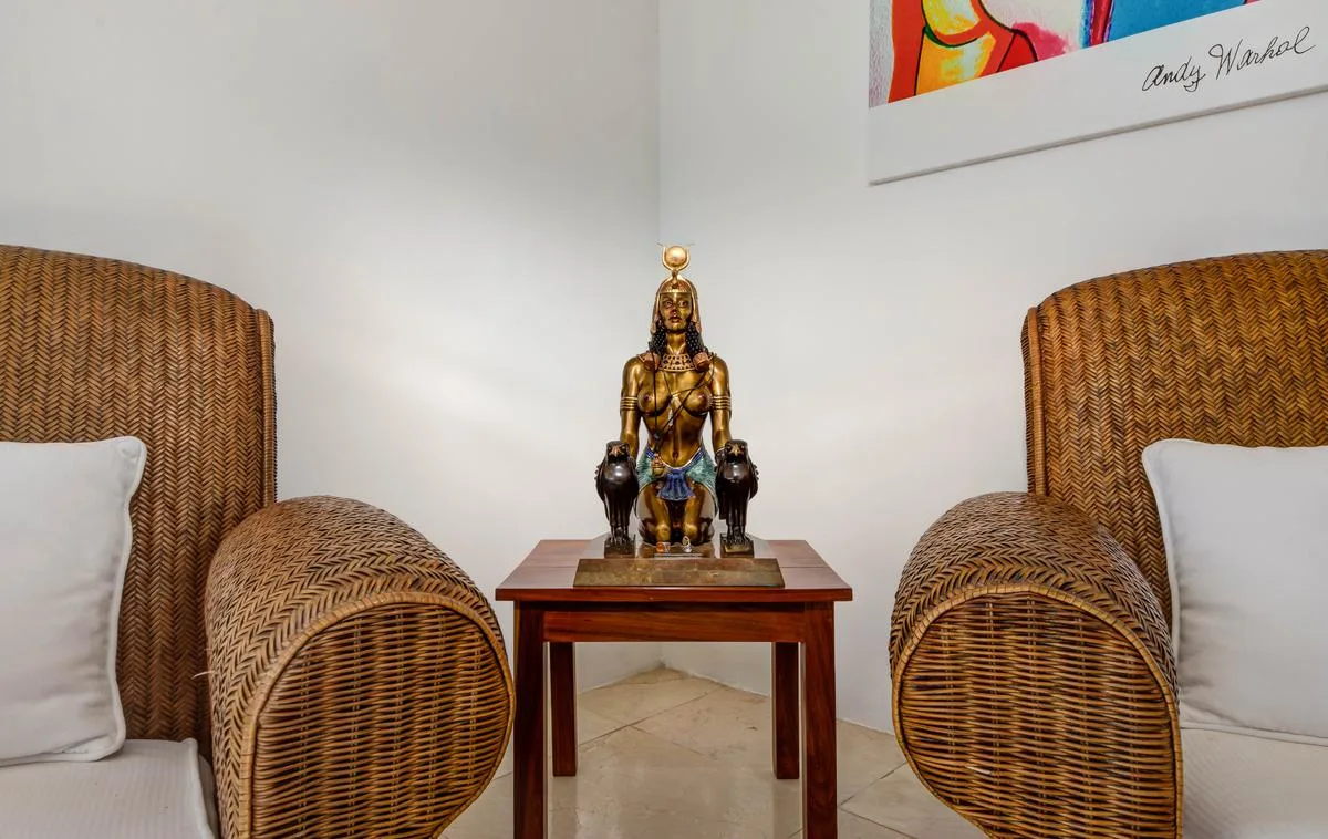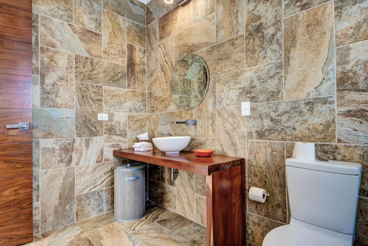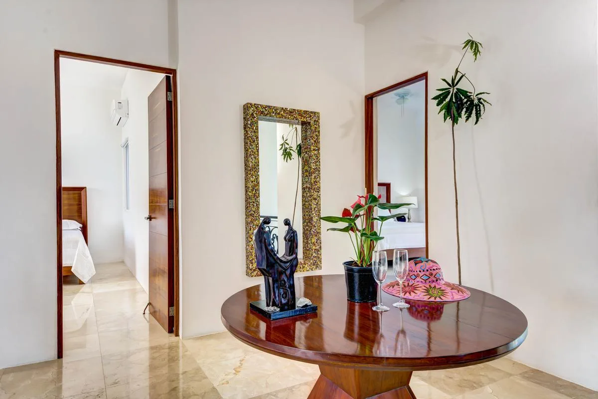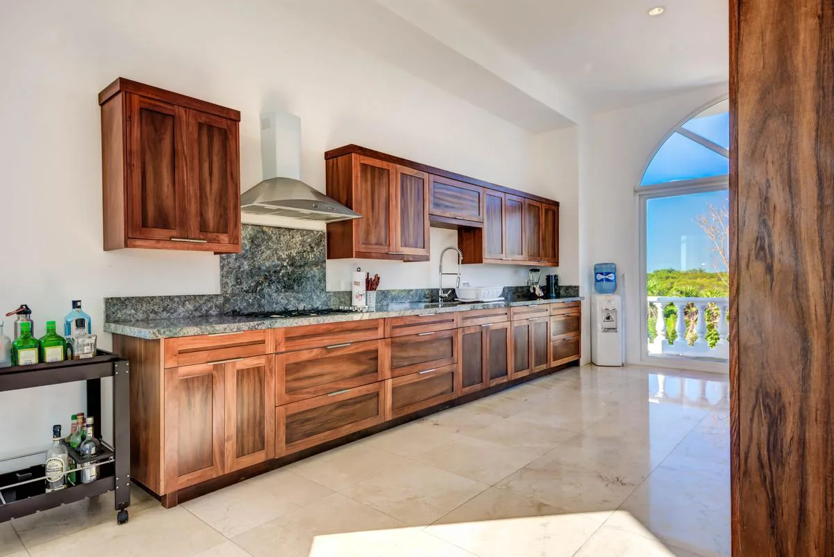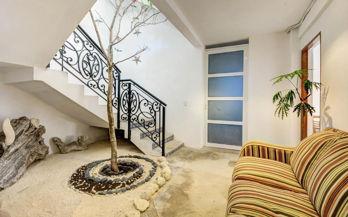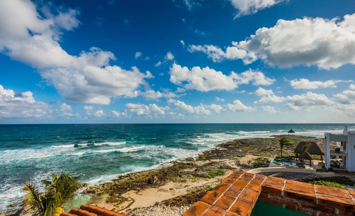 The villa offers a large patio suitable for relaxation and sunbathing, along with five balconies that provide ocean views. The location provides privacy and security, with dense Mayan jungle on one side and the ocean on the other.