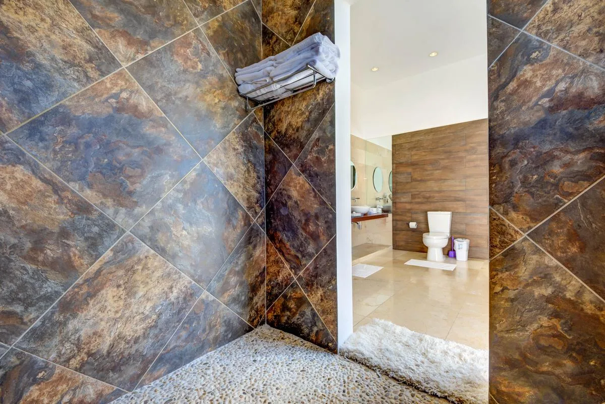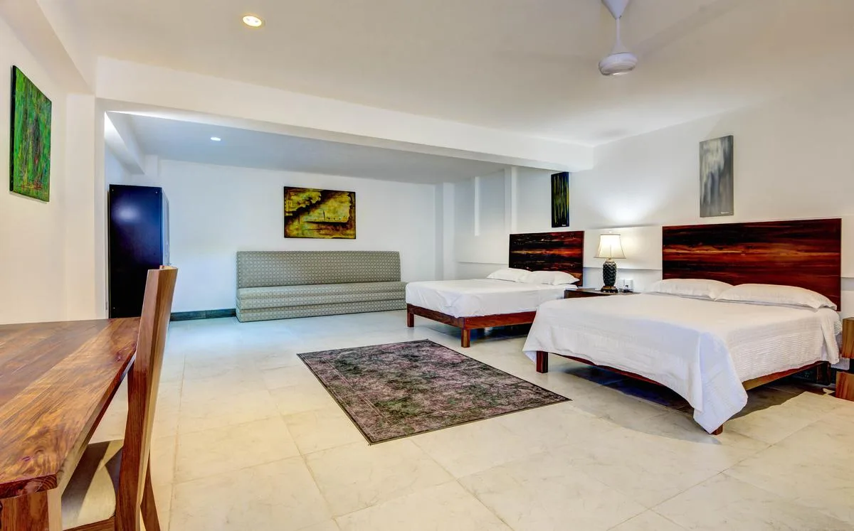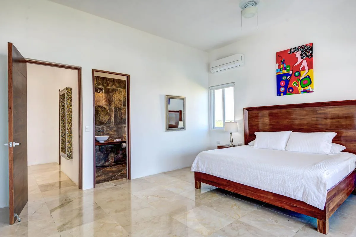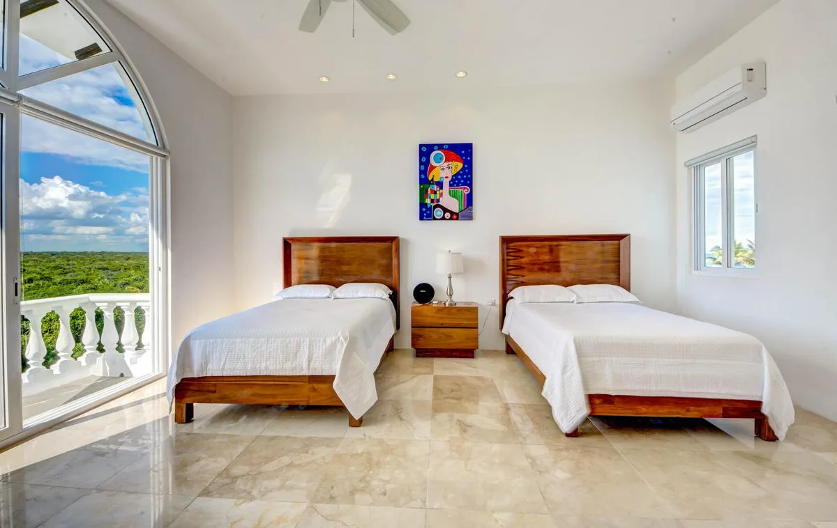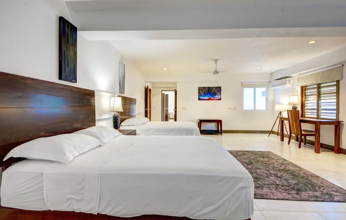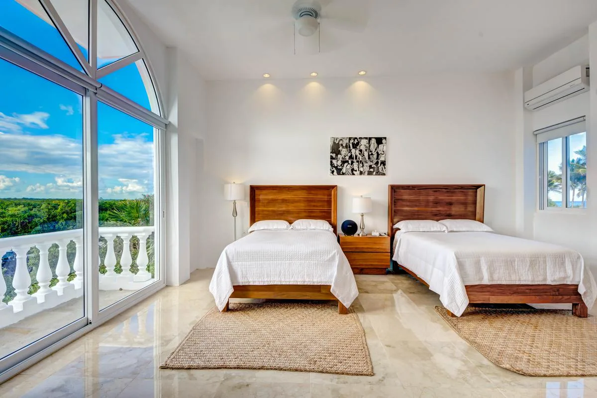 Three primary bedrooms feature ocean views, king-size beds, and spacious balconies with seating. Three additional bedrooms face the jungle and are equipped with two queen-size beds each. One more bedroom includes a single queen-size bed.