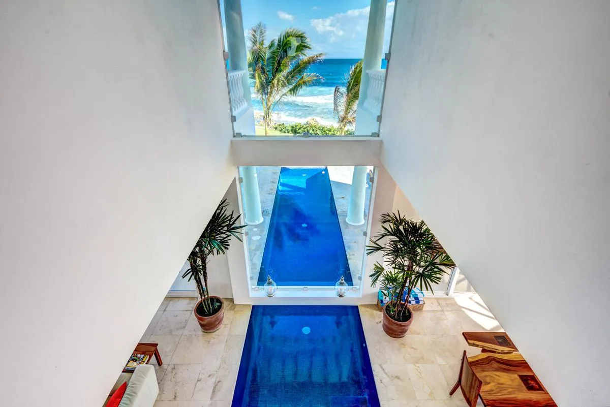 This villa is a contemporary seaside property with seven luxury bedrooms, situated adjacent to the Caribbean Sea. It features an indoor and outdoor pool accessible directly from the living area. The property includes seven and a half bathrooms and generous living space.