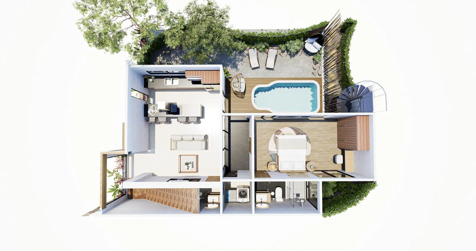 The property features a contemporary design with a balance of elegance and functionality, offering spacious interiors and high-quality finishes. It includes integrated social areas, bright bedrooms, and a private terrace with a garden, providing privacy and comfort in a natural setting.