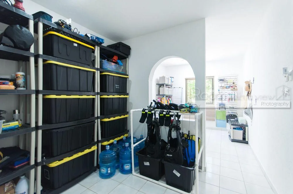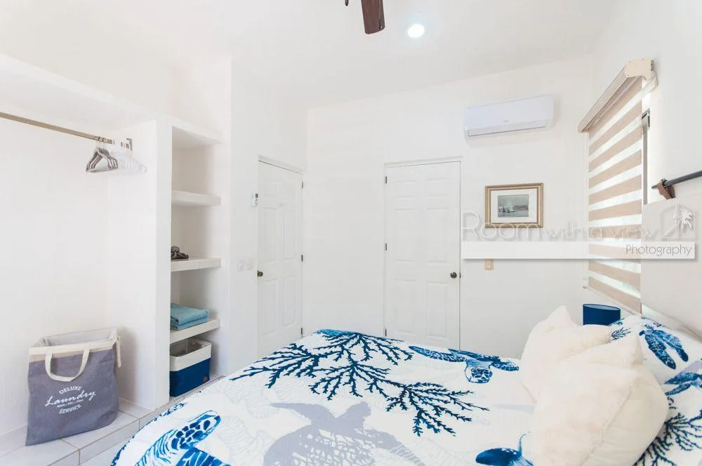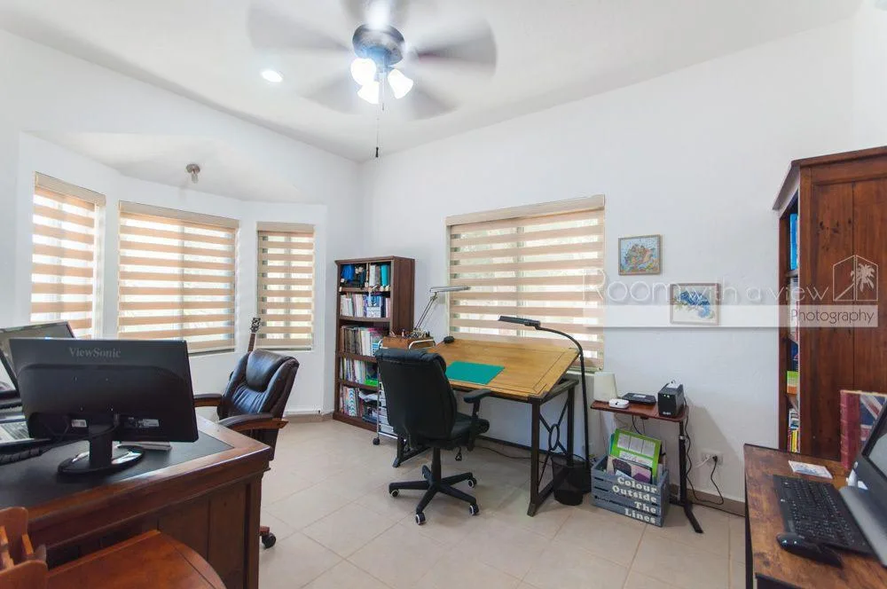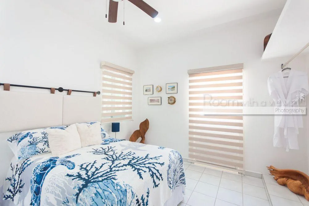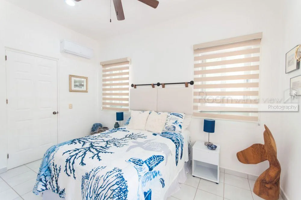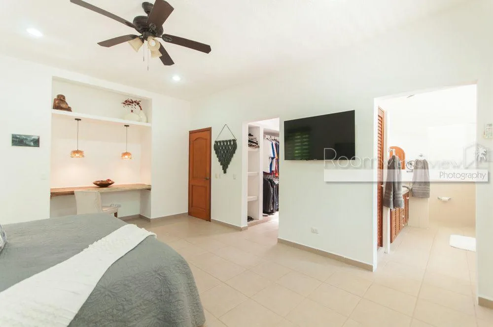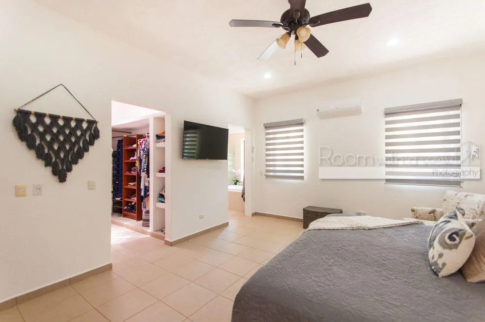 The primary bedroom features a large walk-in closet and an en suite bathroom with a walk-in shower and a jacuzzi. The home has plentiful storage throughout, tile floors, and high-quality finishes. It is fully furnished and includes three TVs with Sonos speaker systems, ceiling fans in all rooms, eight air conditioning units, storm shutters, a backup generator, and solar panels.