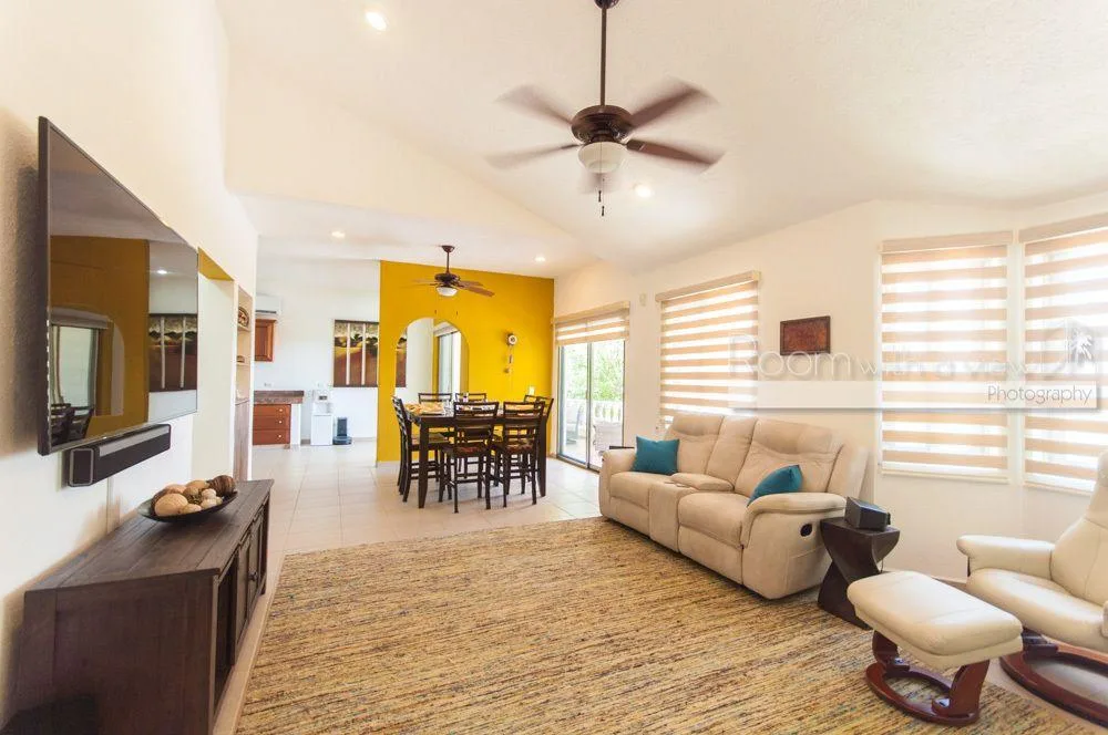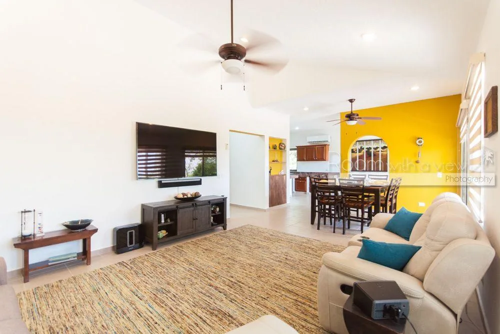 The updated villa contains four bedrooms and three bathrooms, with spectacular ocean and jungle views available from the upper-level patio. The interior includes a fully equipped kitchen with an island, a spacious open-concept living and dining area, a laundry room with ample storage, and a game room with a wet bar and a wine or beer refrigerator. The main living area opens to a large covered terrace.