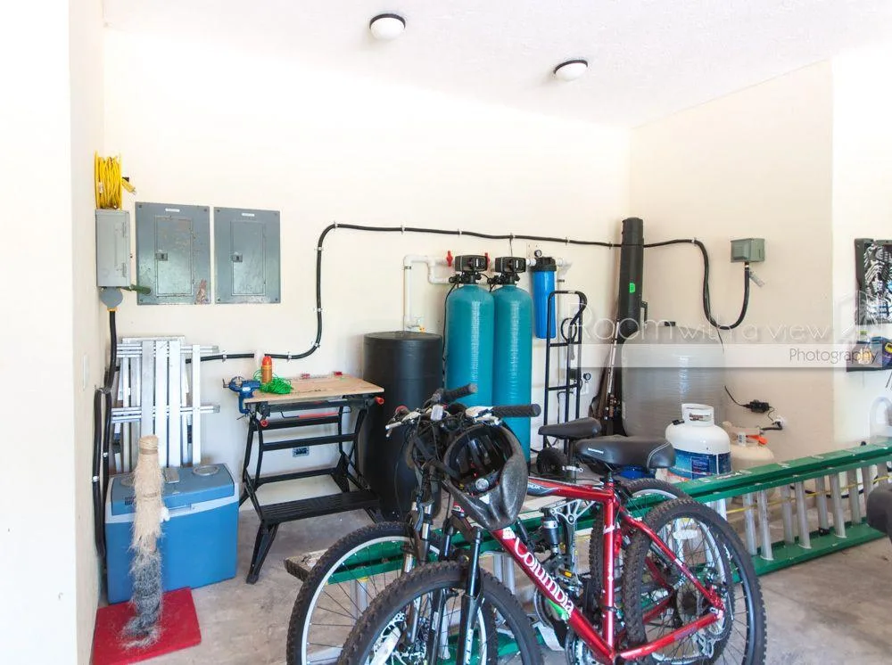 The exterior features a finished back patio with a heated and cooled pool, the pumps of which have Wi-Fi control. There is a sundeck with a hammock and loungers, and a landscaped garden area with palm trees and tropical plants. A covered patio space includes an outdoor grill. The property is fully walled-in and includes a double garage and an alarm system with cameras.