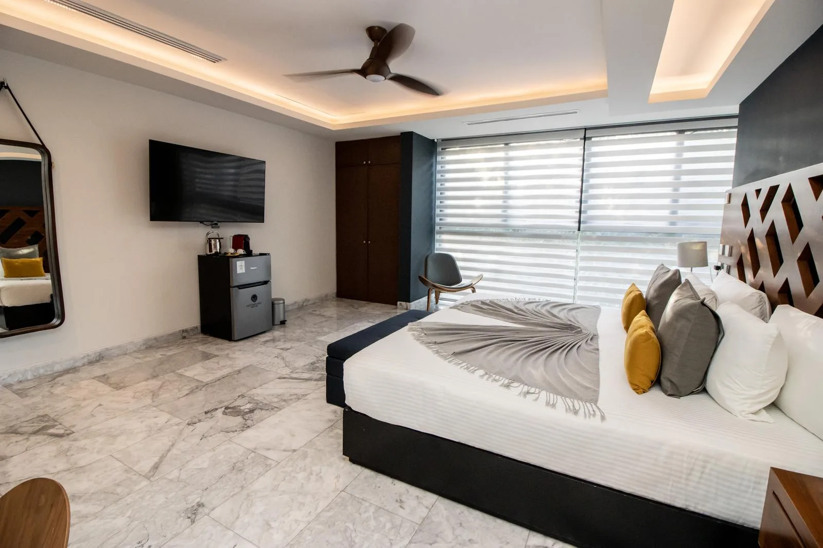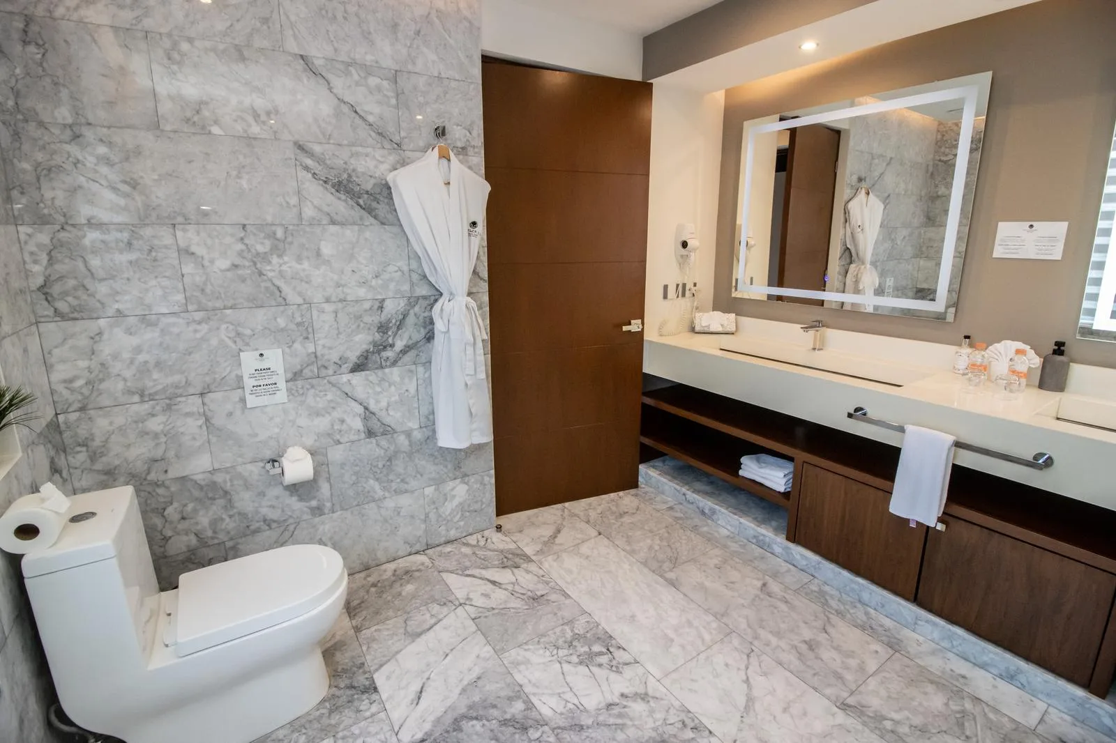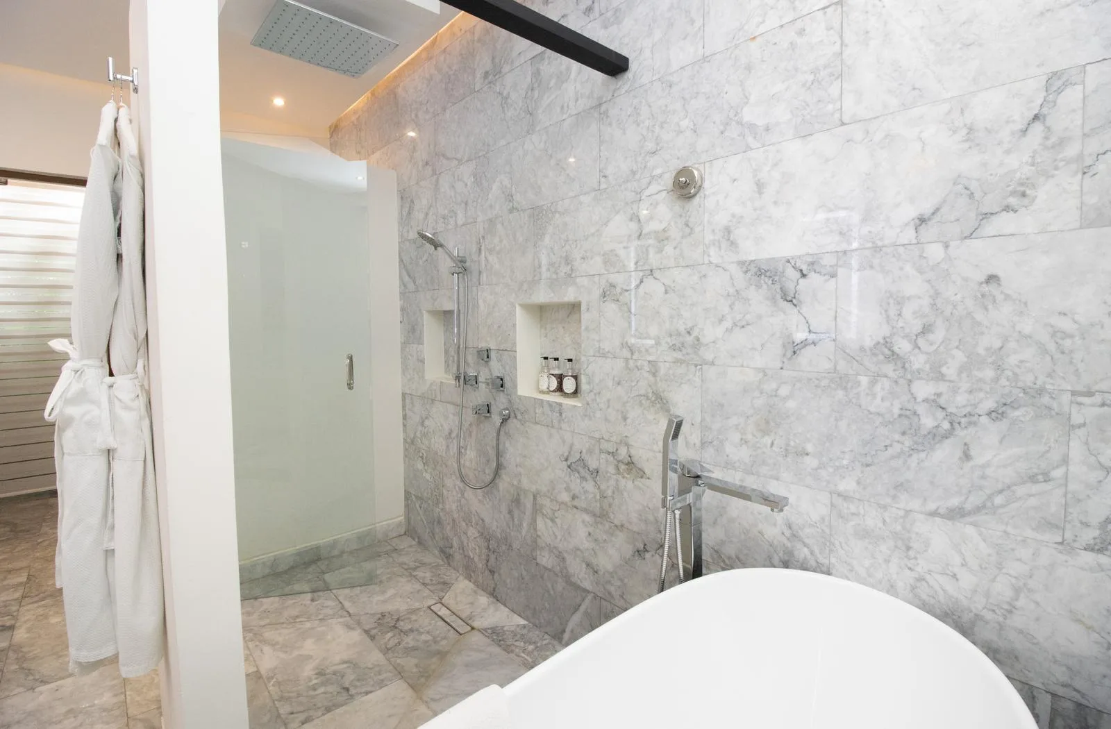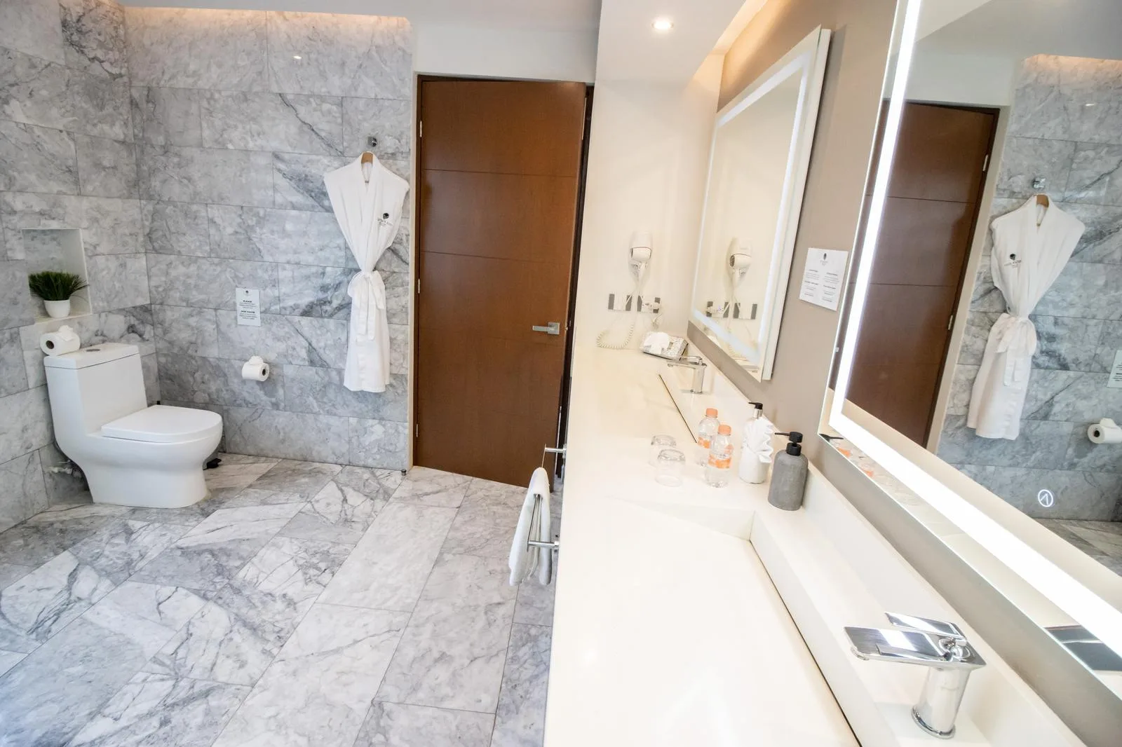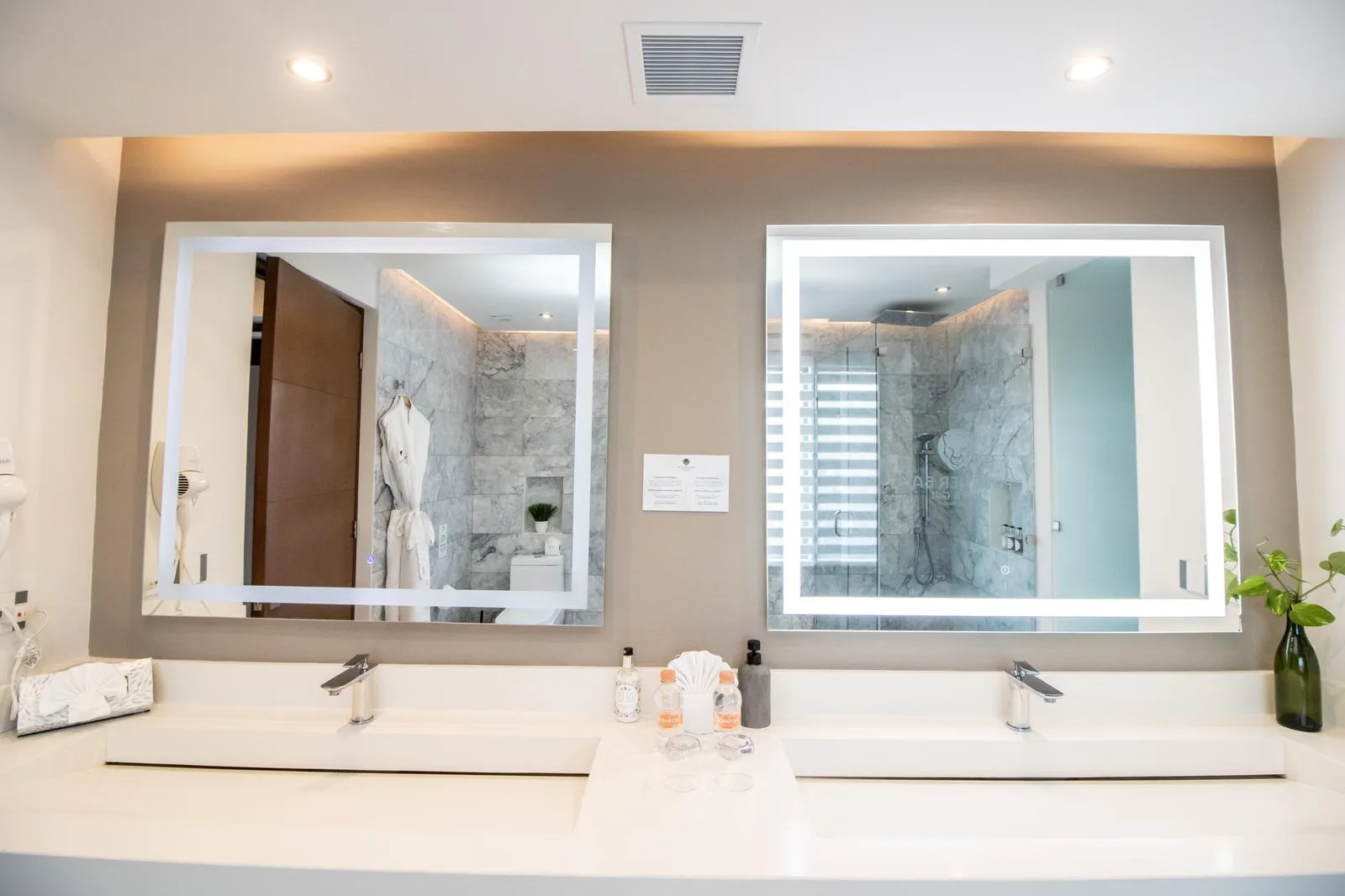 Each apartment provides ample space with its own living area, a minibar, and direct access to various terraces. The bathrooms feature high-quality finishes, including double sinks and bathtubs.
