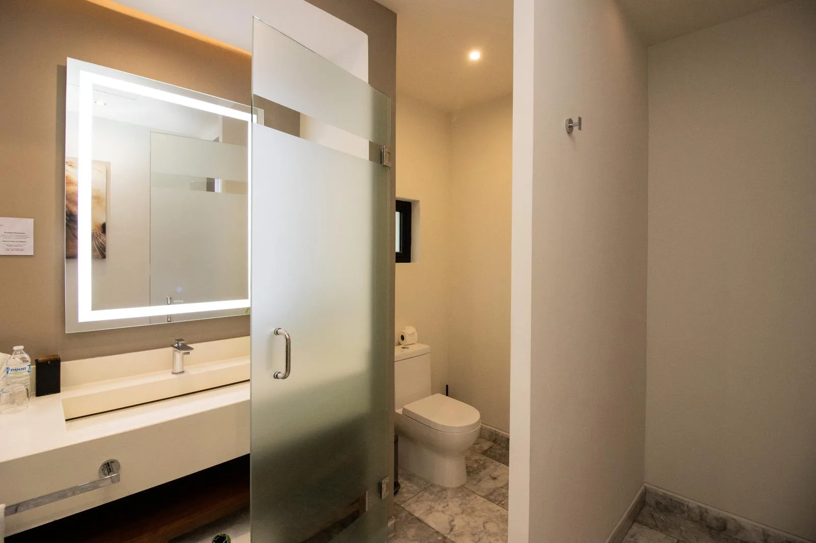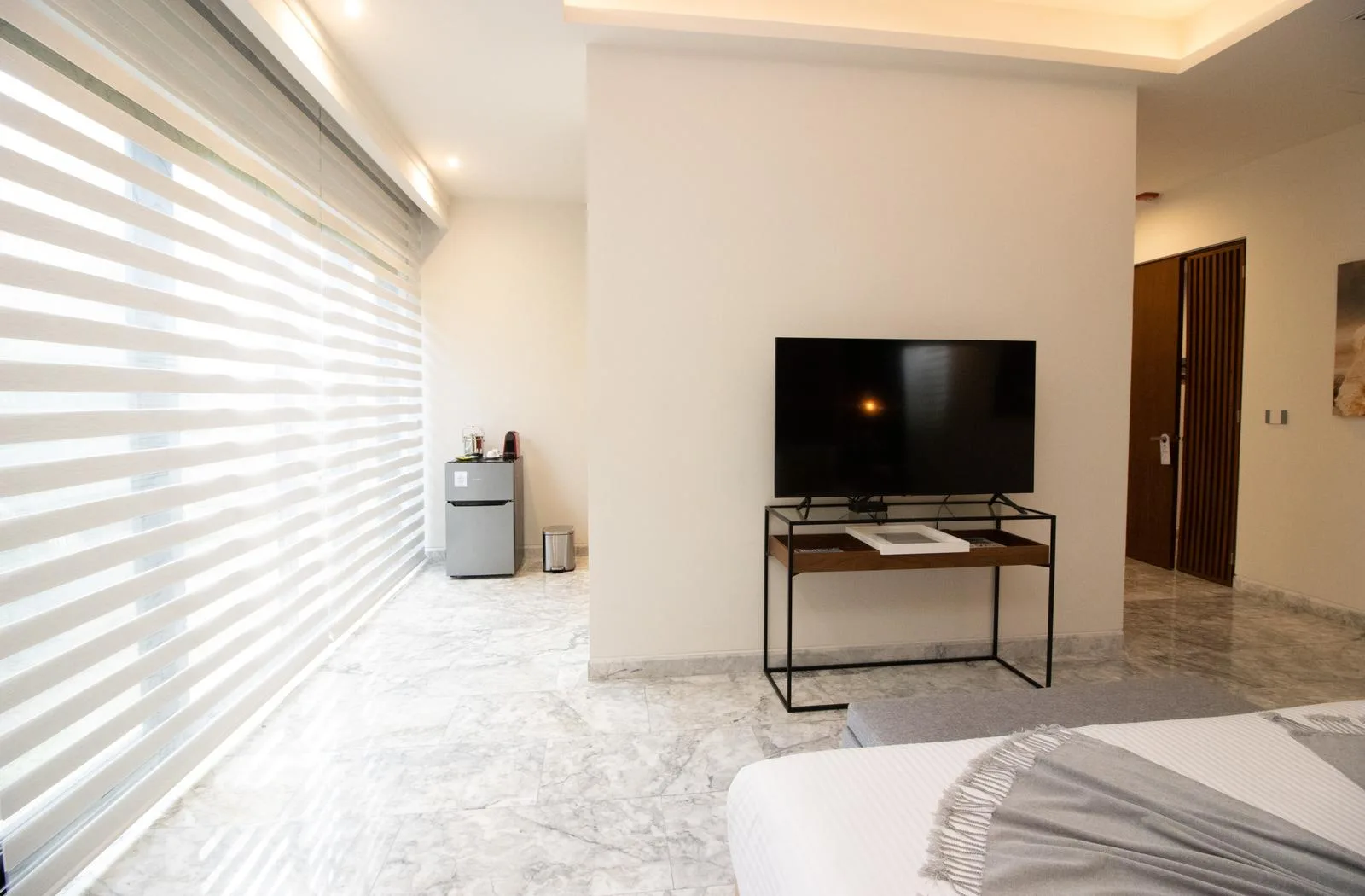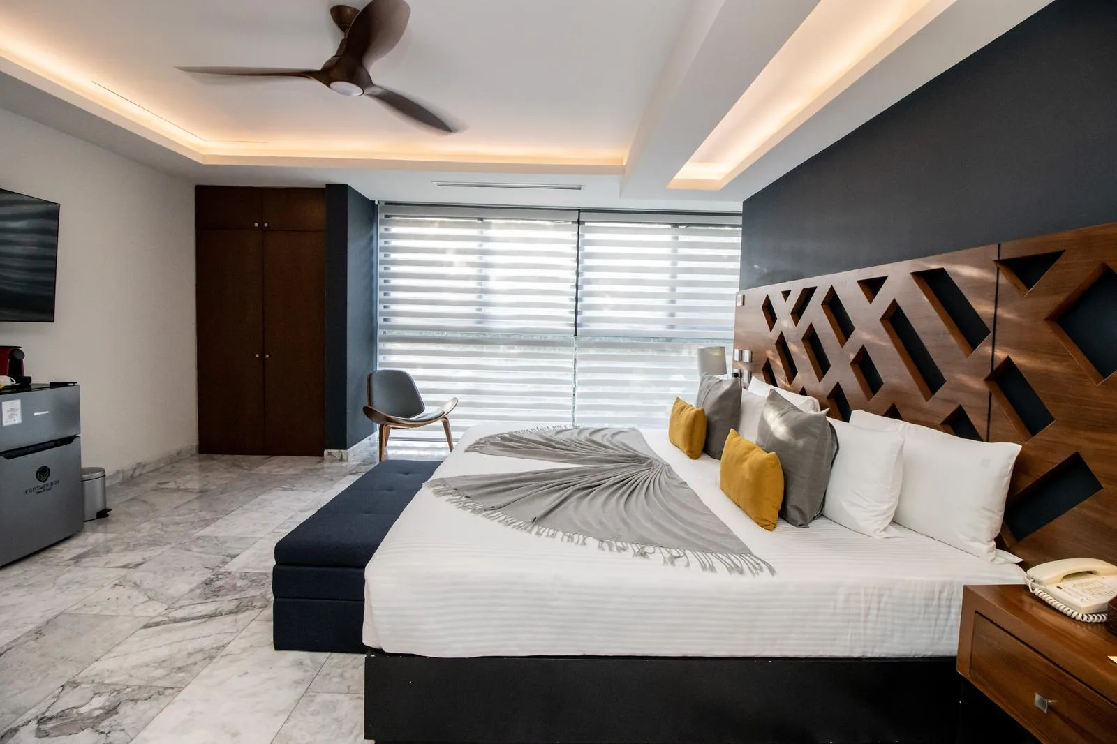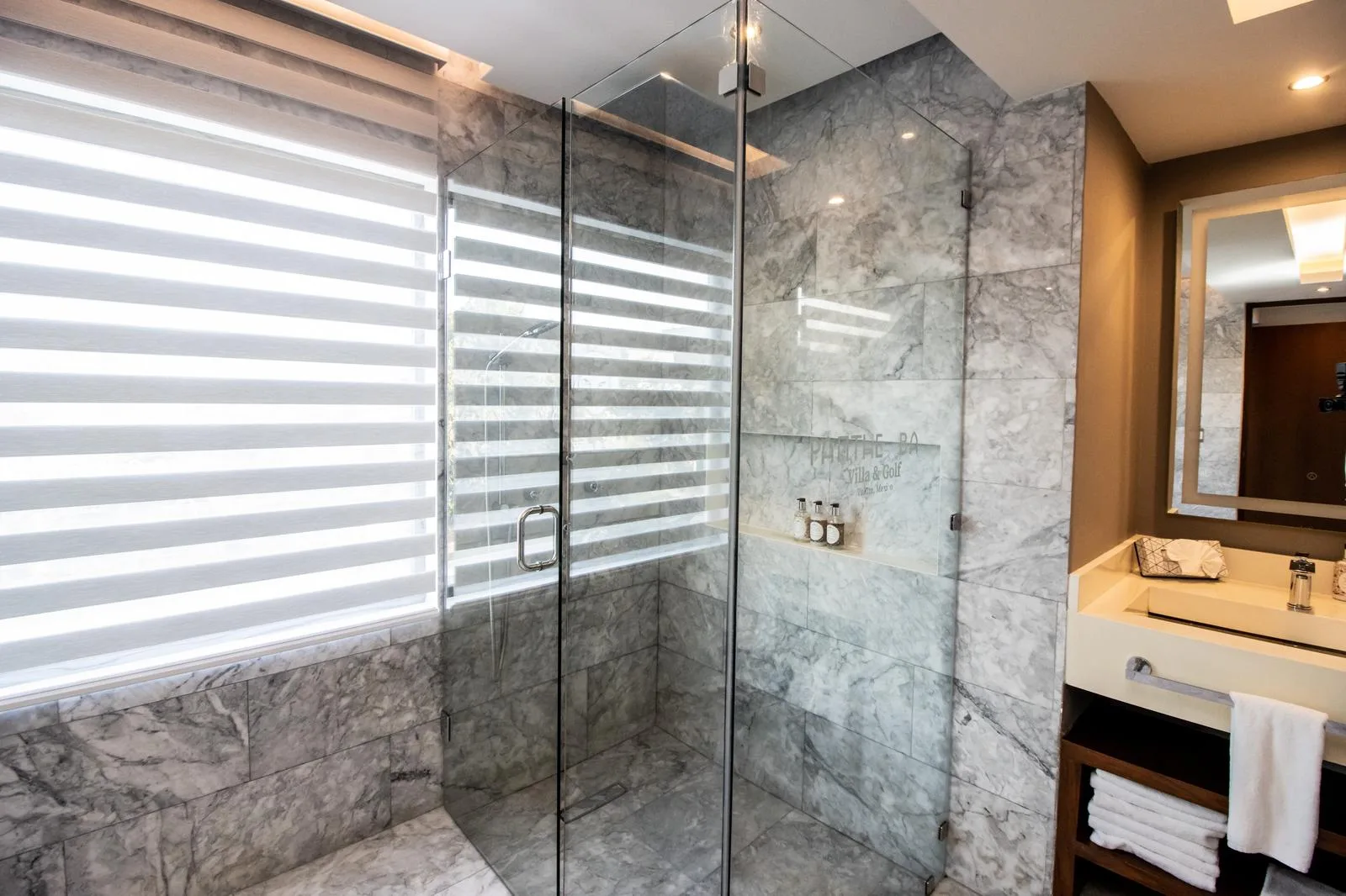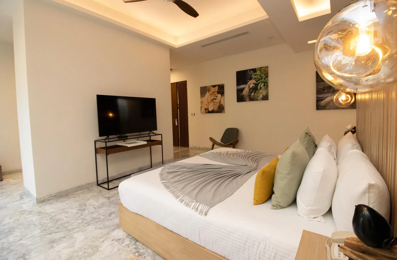 Each apartment provides ample space with its own living area, a minibar, and direct access to various terraces. The bathrooms feature high-quality finishes, including double sinks and bathtubs.