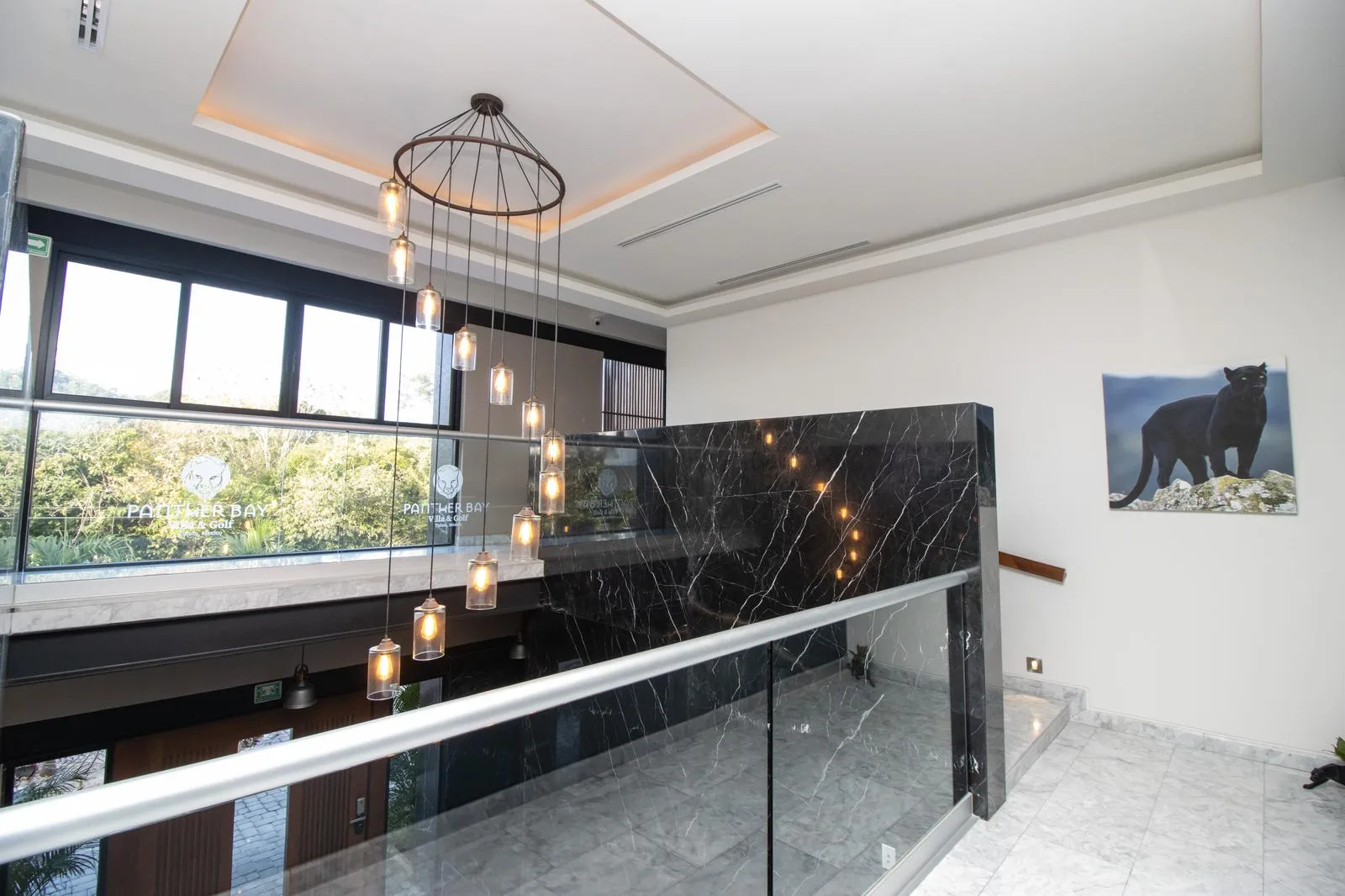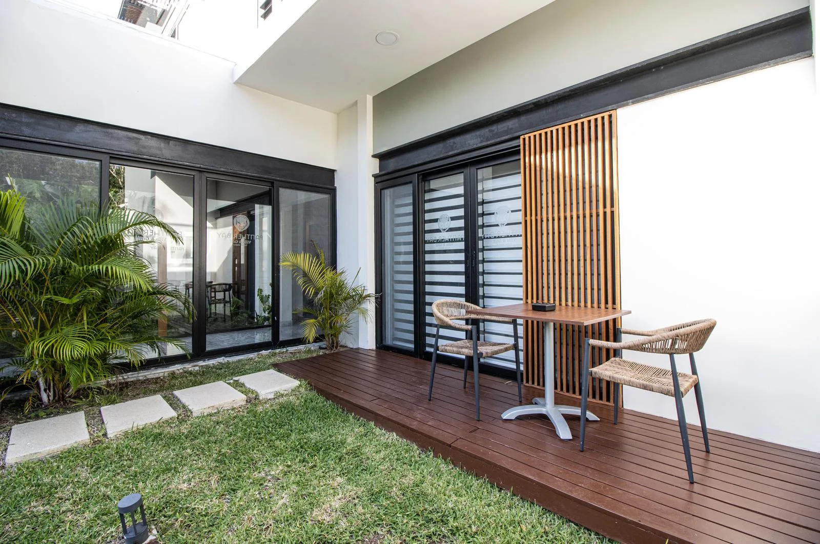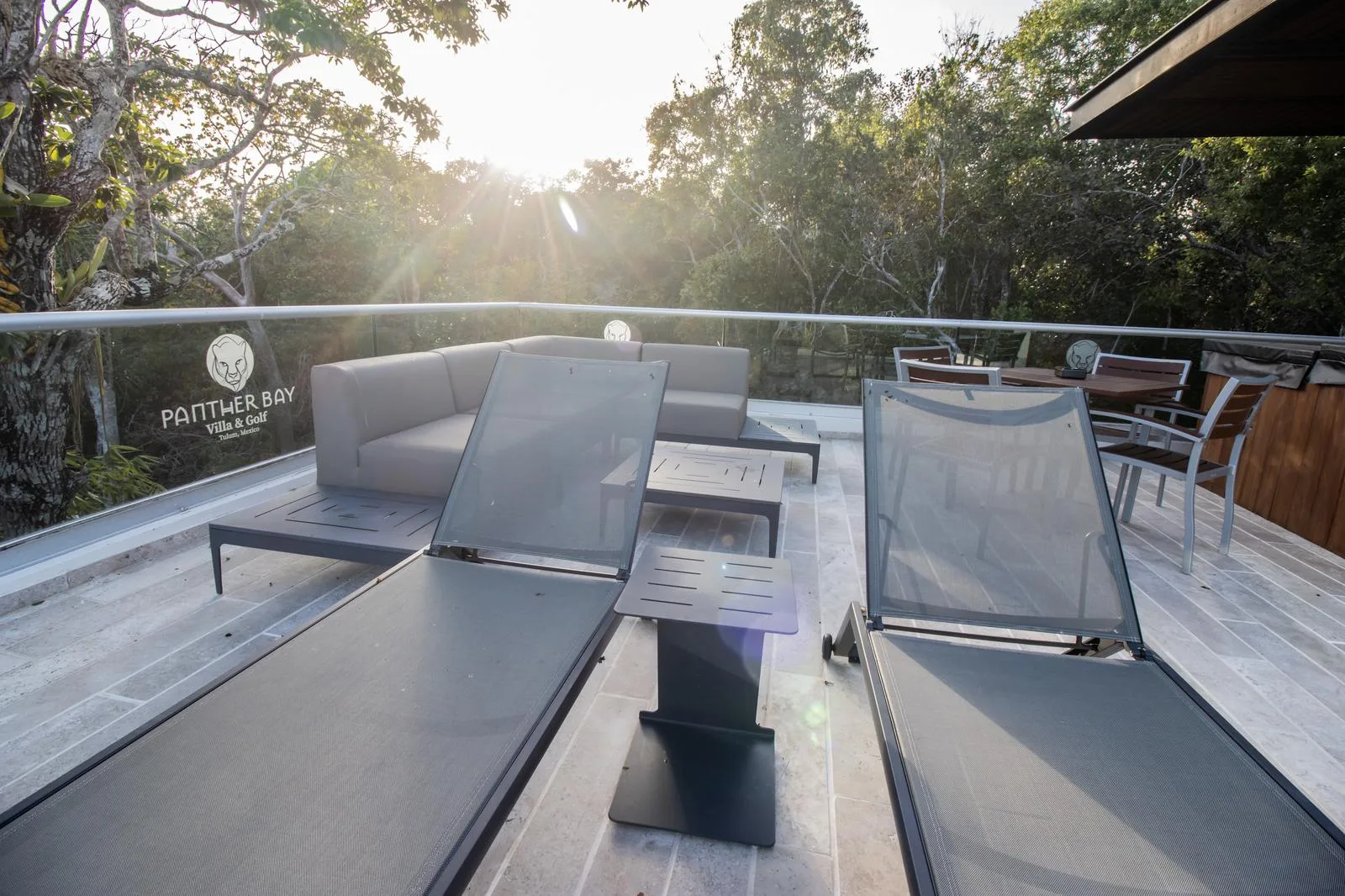 The upper floor contains four additional apartments, each with a bathroom, and two include bathtubs and terrace access. This level also features a terrace with a wooden deck, an outdoor room, and a hydromassage jacuzzi, providing views of the Mayan jungle and the golf course.