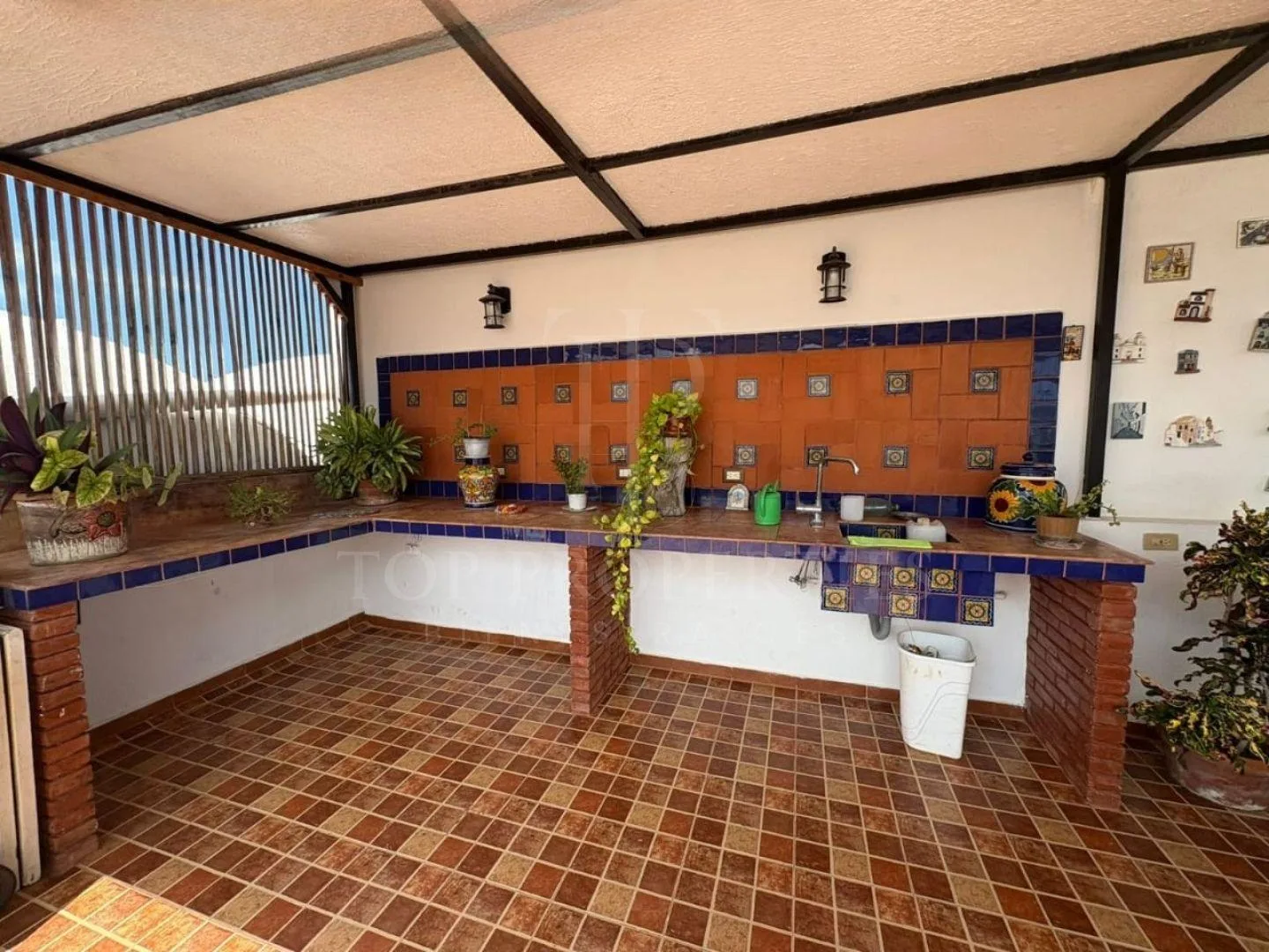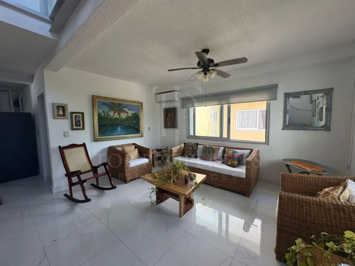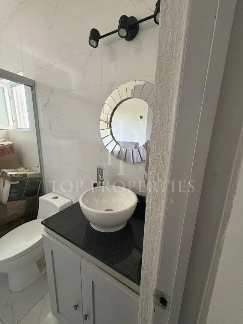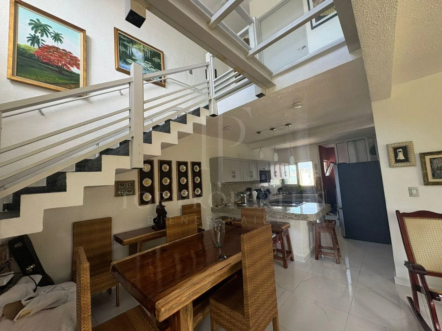 This penthouse features double height and a sea view from the roof. It includes three bedrooms, with the primary bedroom having a full bathroom finished in porcelain tile. There is an additional full bathroom also with porcelain tile.