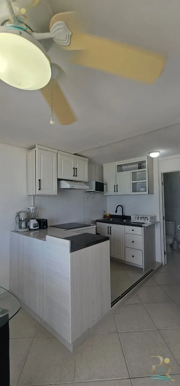 The ground floor unit features one bedroom, one full bathroom, and a fully equipped kitchen. It includes a terrace with direct beach access, situated approximately five meters from the sand.