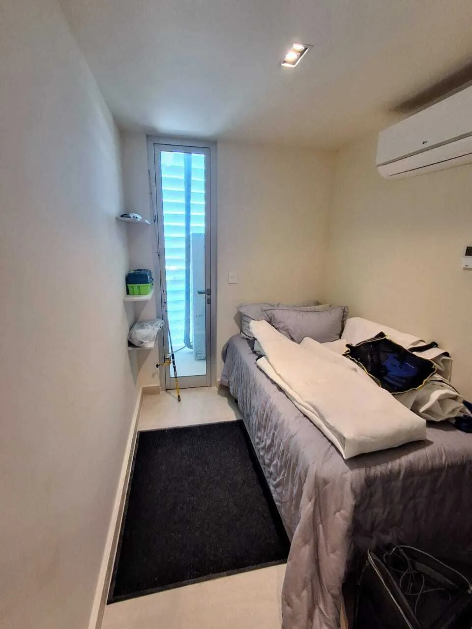 The primary bedroom features a complete bathroom, a walk-in closet, and a sea view. There are two secondary bedrooms, each with a view of the marina and a private bathroom. A modern, open-concept kitchen is equipped with white lacquer cabinetry. A service quarters room includes a full bathroom and air conditioning. A separate laundry area and a private storage room are also provided.
