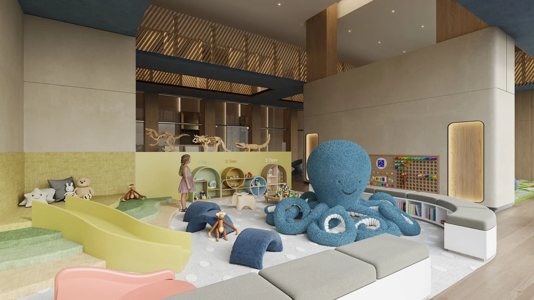 There are kids and family pools, an aqua park, game rooms, a paddle court, a tennis court, and a climbing wall. The property also features a cinema lounge, co-working spaces, a café, a piano bar, and a designated pet zone. Services include 24-hour security, concierge, and facilitated airport access.