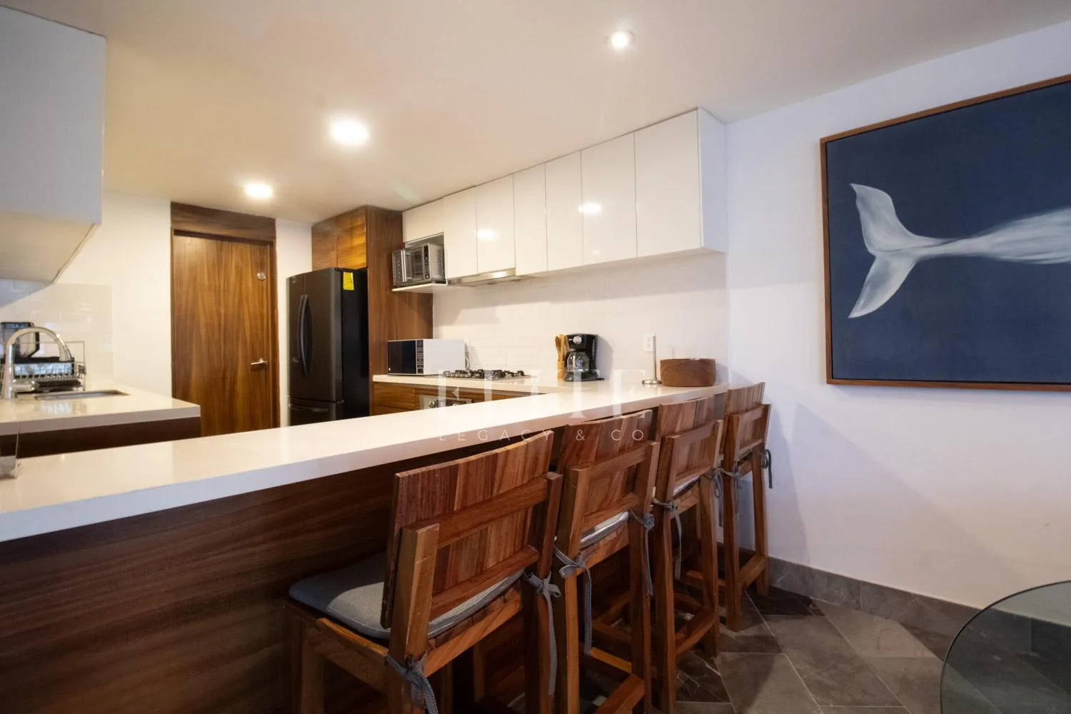 The property includes a total of 4. 5 bathrooms, a modern, fully equipped kitchen, and spacious living and dining rooms. A private terrace with an ocean view is also provided. The home comes furnished and includes a washer, dryer, window coverings, and one assigned parking space plus additional space in the front.