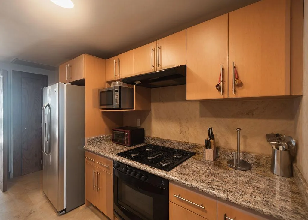 The kitchen is fully equipped. The unit includes hurricane-resistant curtains and is delivered furnished.