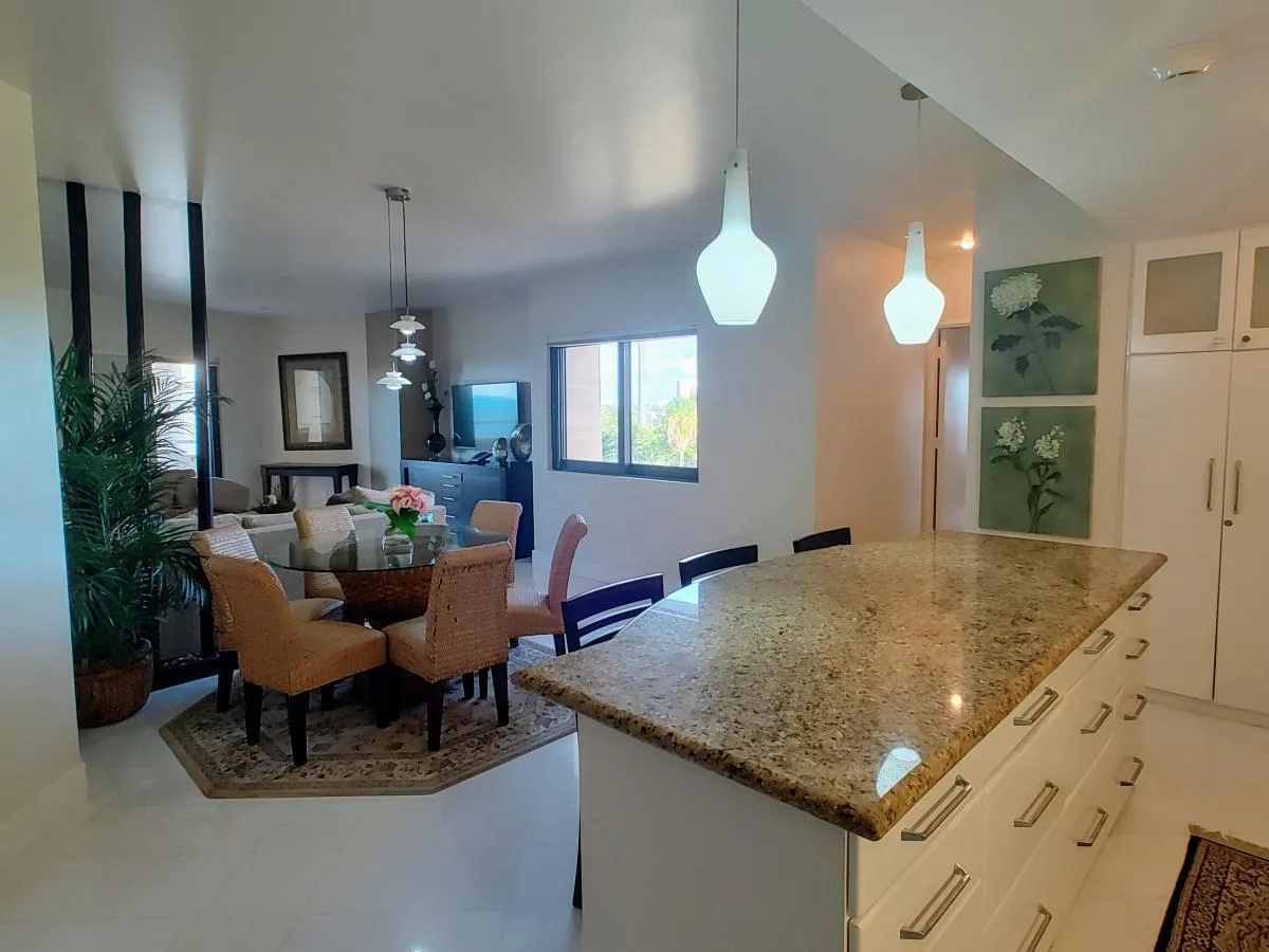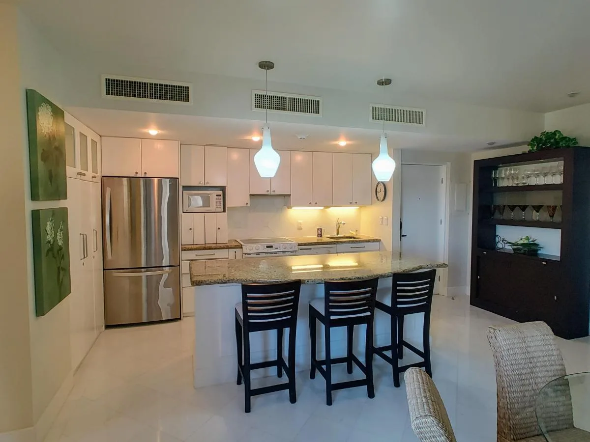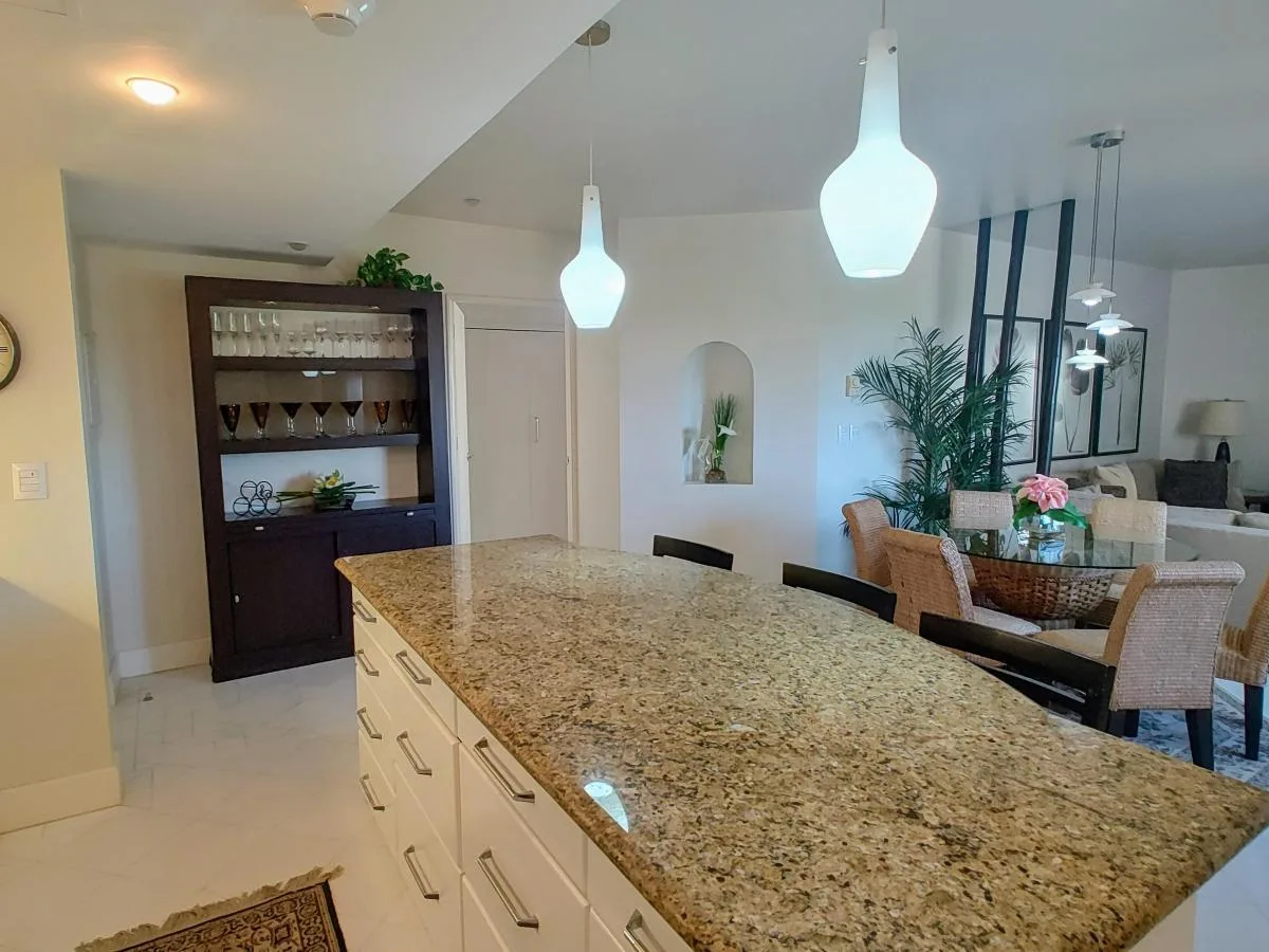 The layout includes a combined living and dining area. The open-plan kitchen is equipped with a granite countertop and appliances. A terrace accessible from the living area offers views of the ocean and the resort pool.