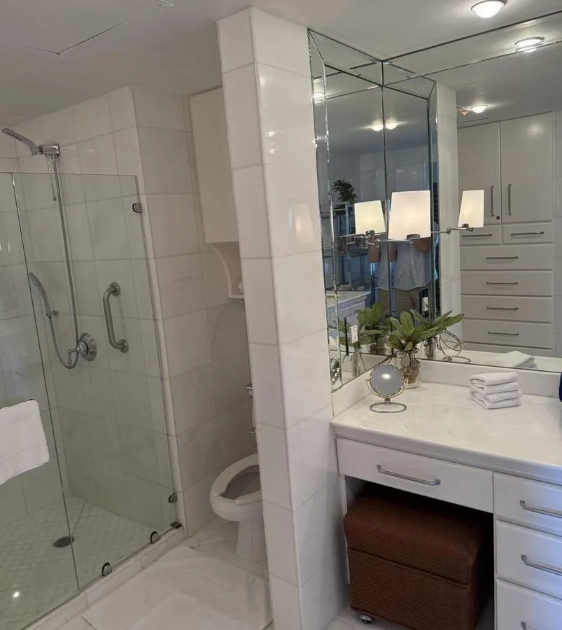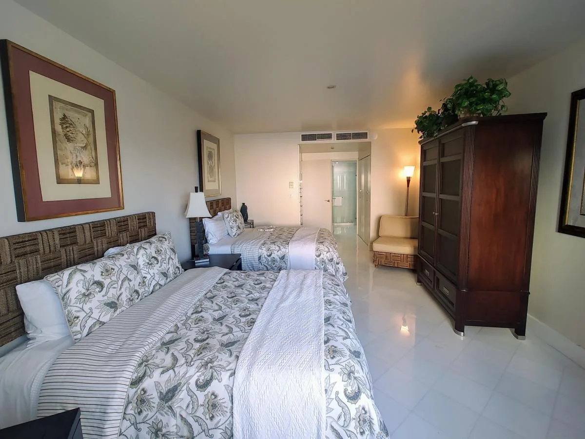 The master bedroom features a king-size bed, a full bathroom, and a large terrace with views of the lagoon. The secondary bedroom is equipped with two double beds, includes a full bathroom, and provides views of the ocean and pool. The residence includes two unassigned parking spaces.