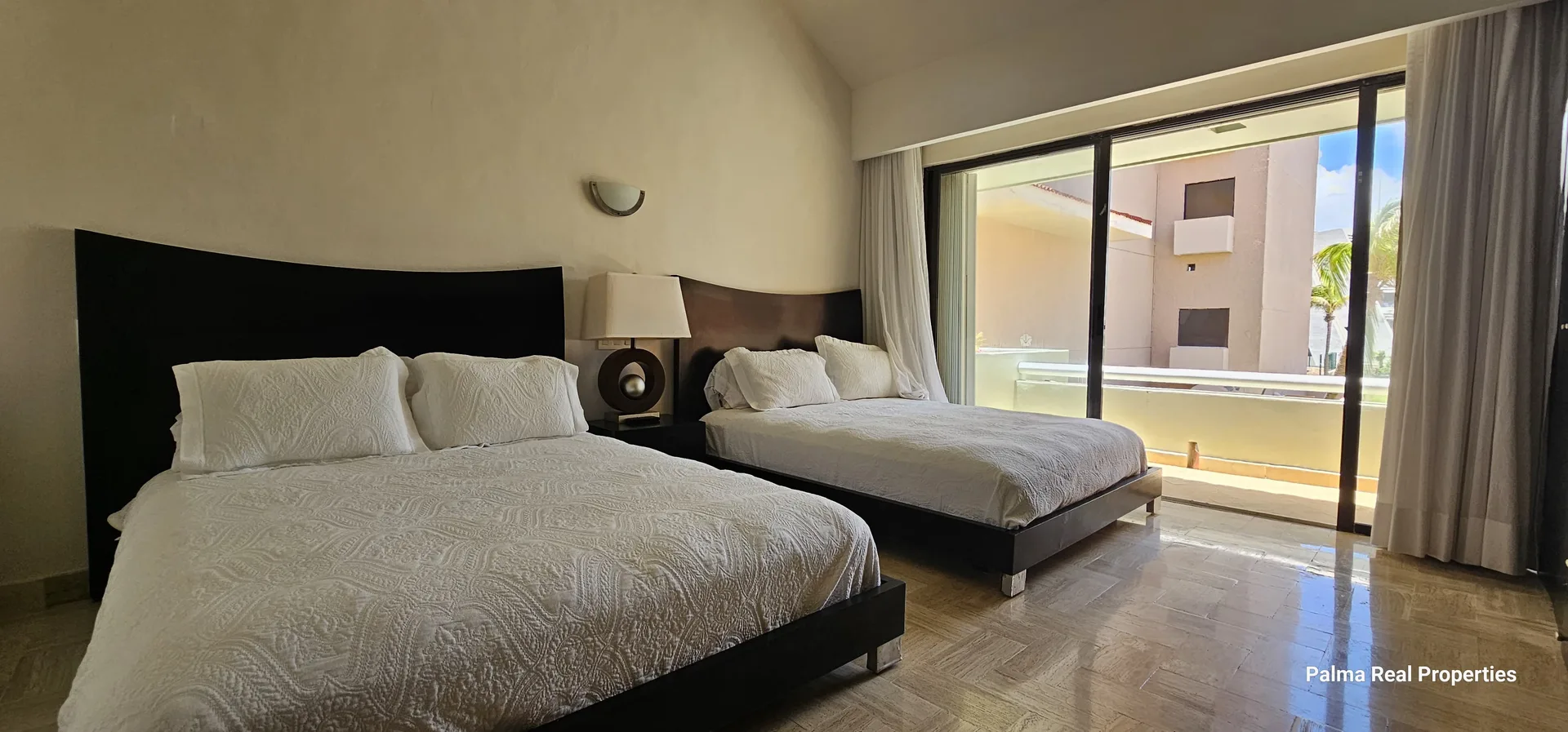 A spacious living room and a terrace provide views of the ocean and the swimming pool. There are two additional large terraces extending from the bedrooms, each with ample space for a table and chairs.