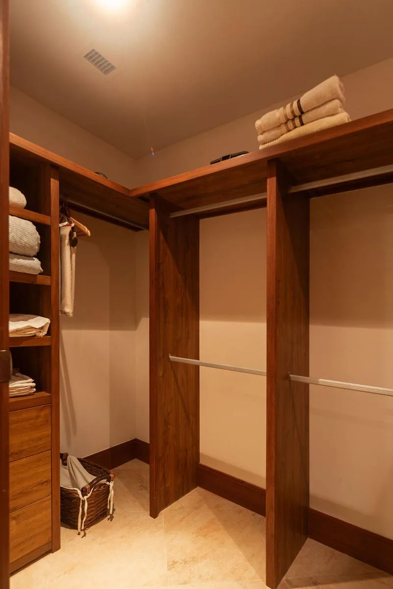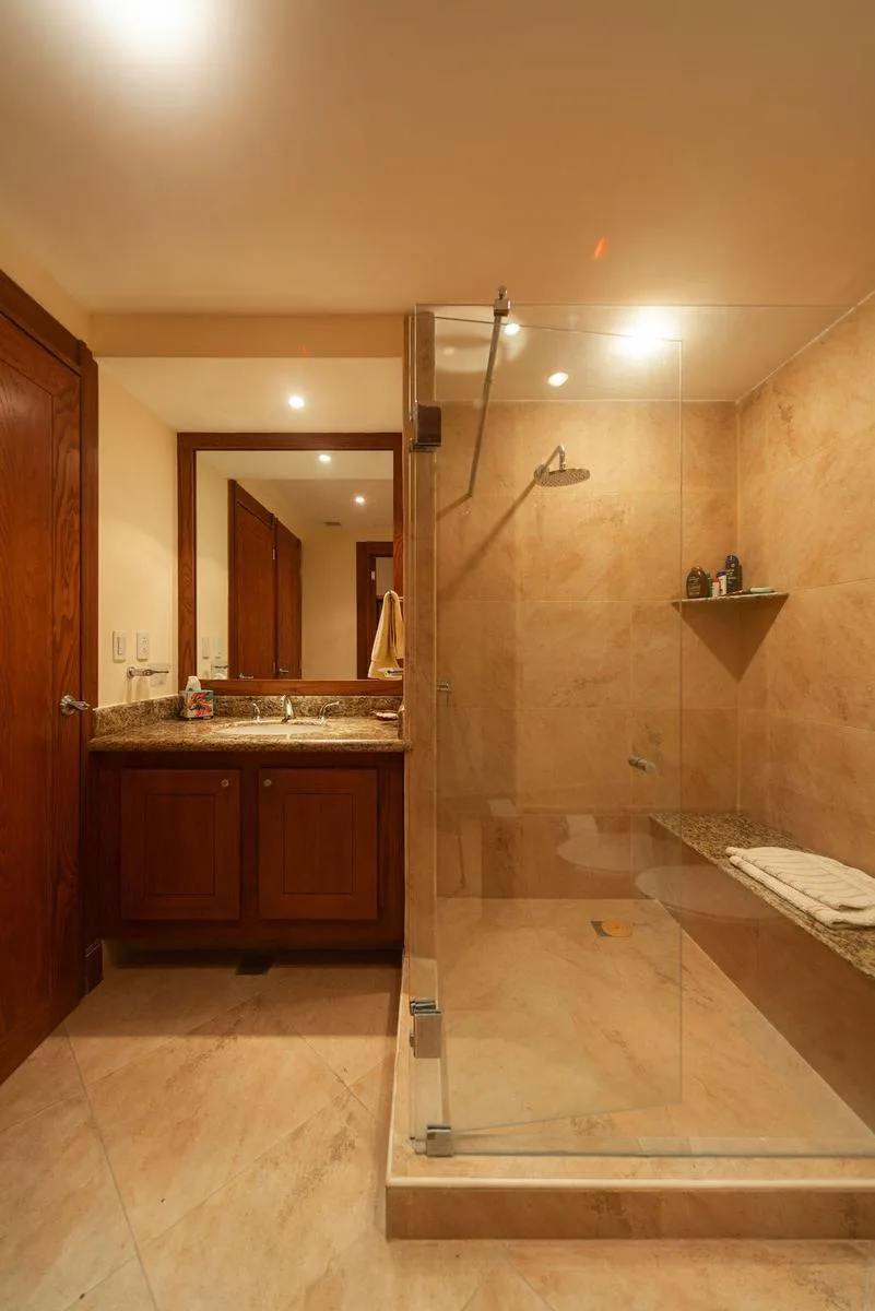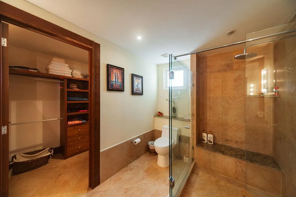 The layout includes three bedrooms, each with a full bathroom and a walk-in closet. There is an additional full bathroom in the service room. The residence also comprises a TV room and a fully equipped kitchen. The apartment is fitted with anti-cyclone curtains.