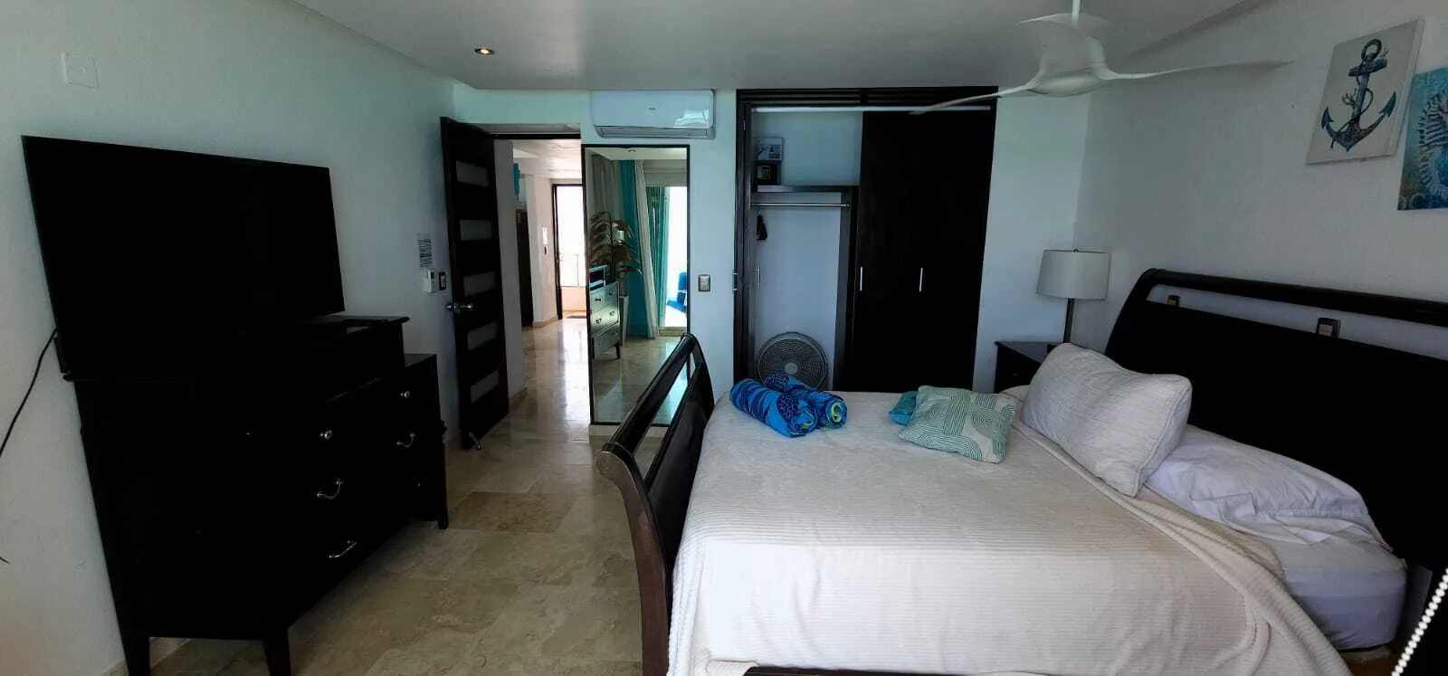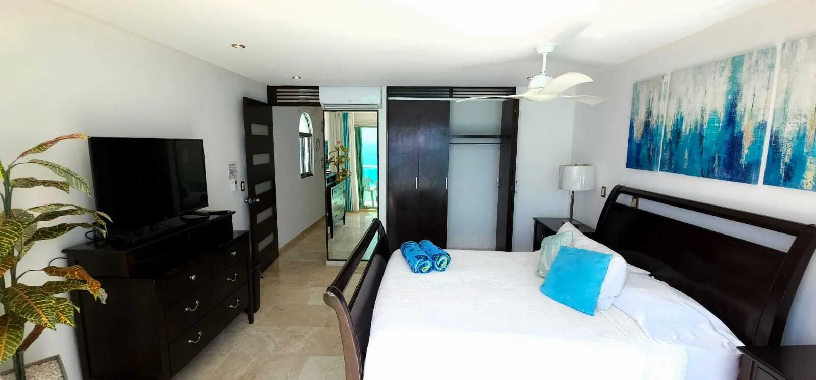 Each bedroom is equipped with air conditioning, drawers, closets, screens, and ceiling fans for comfort. The ocean views from the bedrooms and living room are impressive.