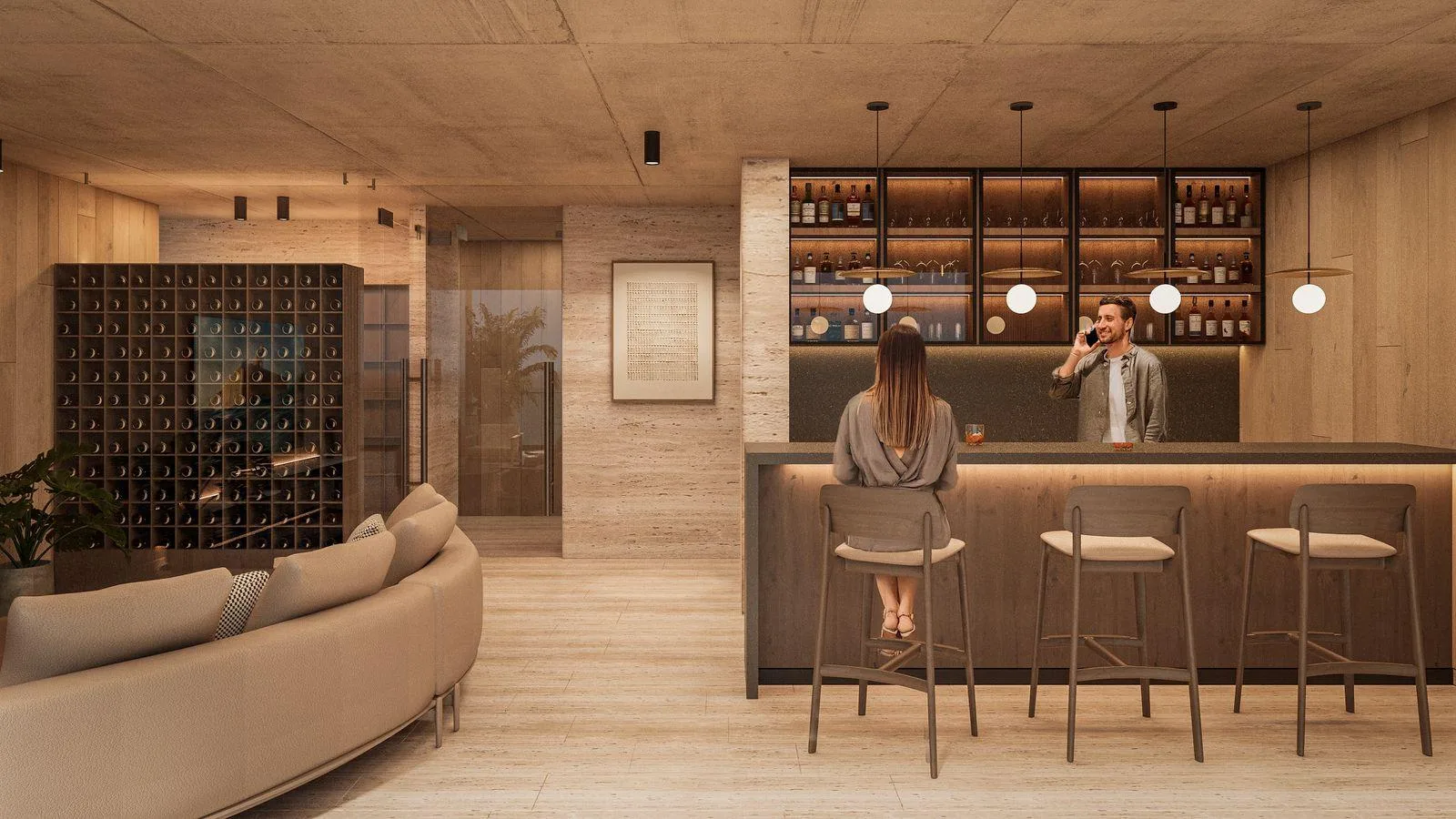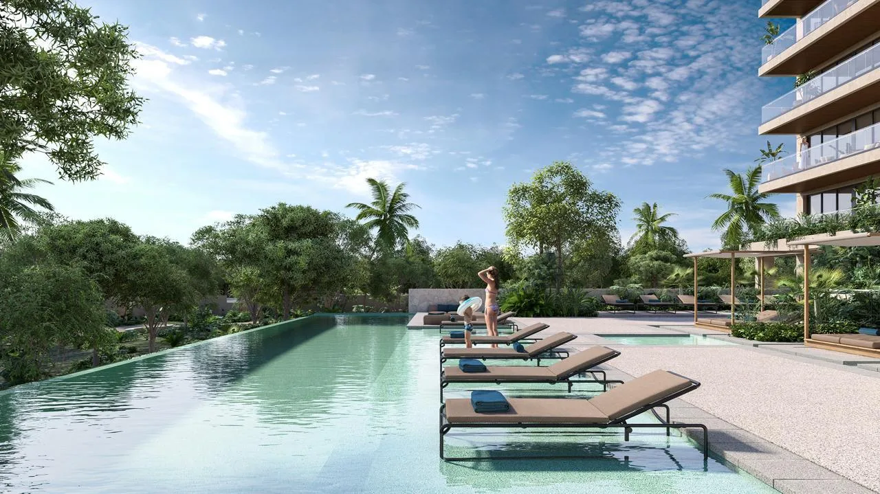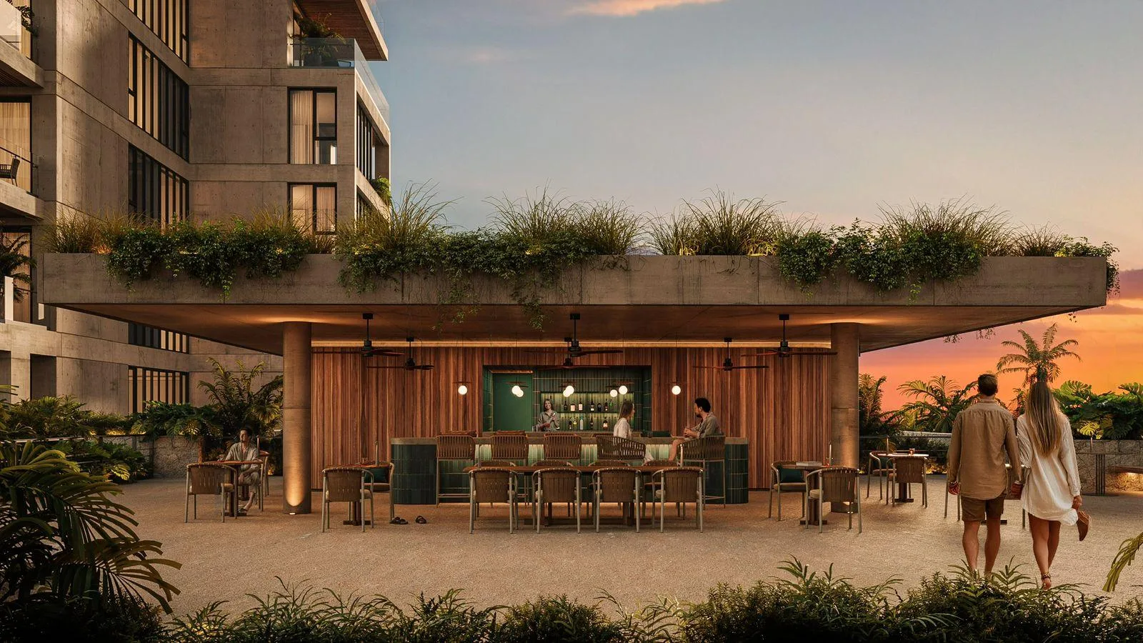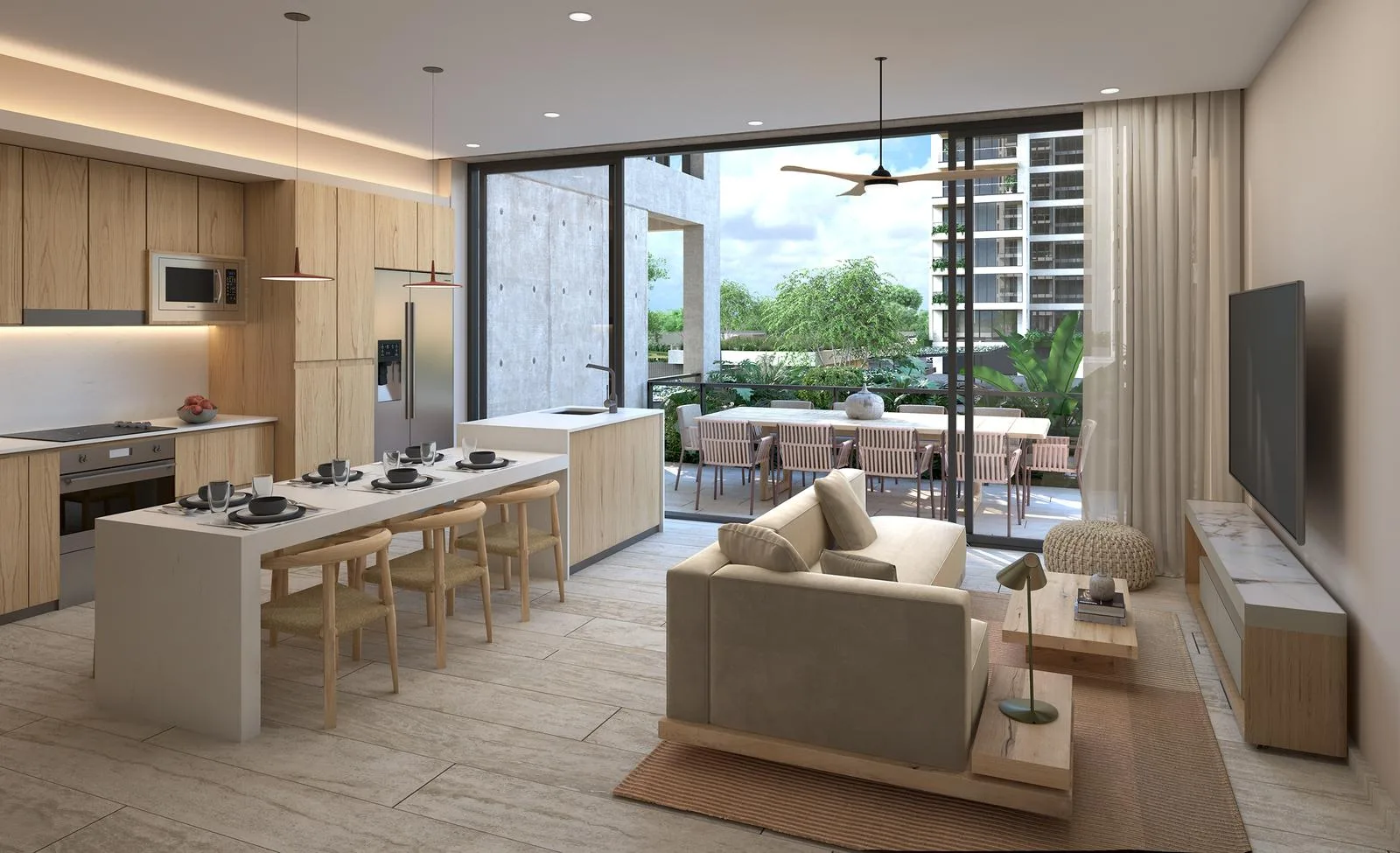 The unit features one bedroom with a functional layout and a private terrace, designed to maximize natural light and provide views of the Laguna Nichupté or sunset, depending on the floor. It includes one bedroom, one full bathroom, a living room, dining room, kitchen, laundry room, terrace, and one parking space. Sizes range from approximately 47 to 64 square meters, depending on the unit type.