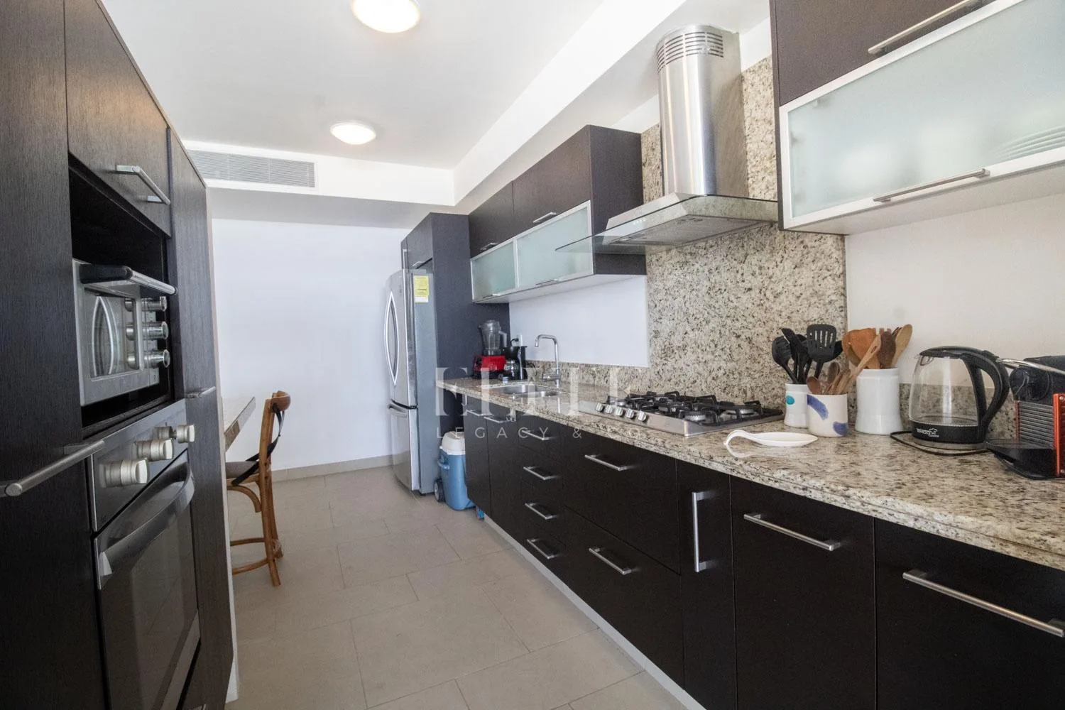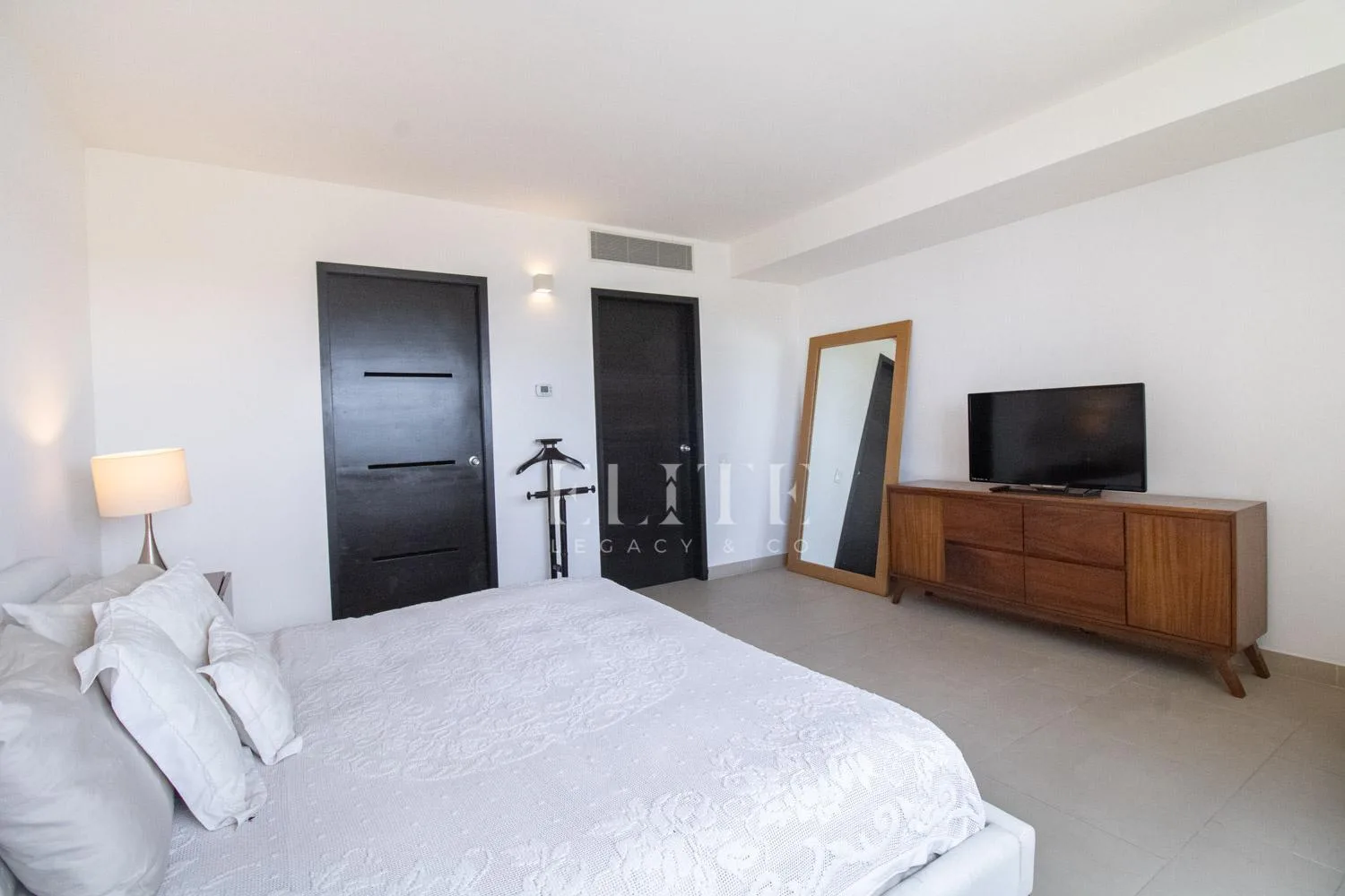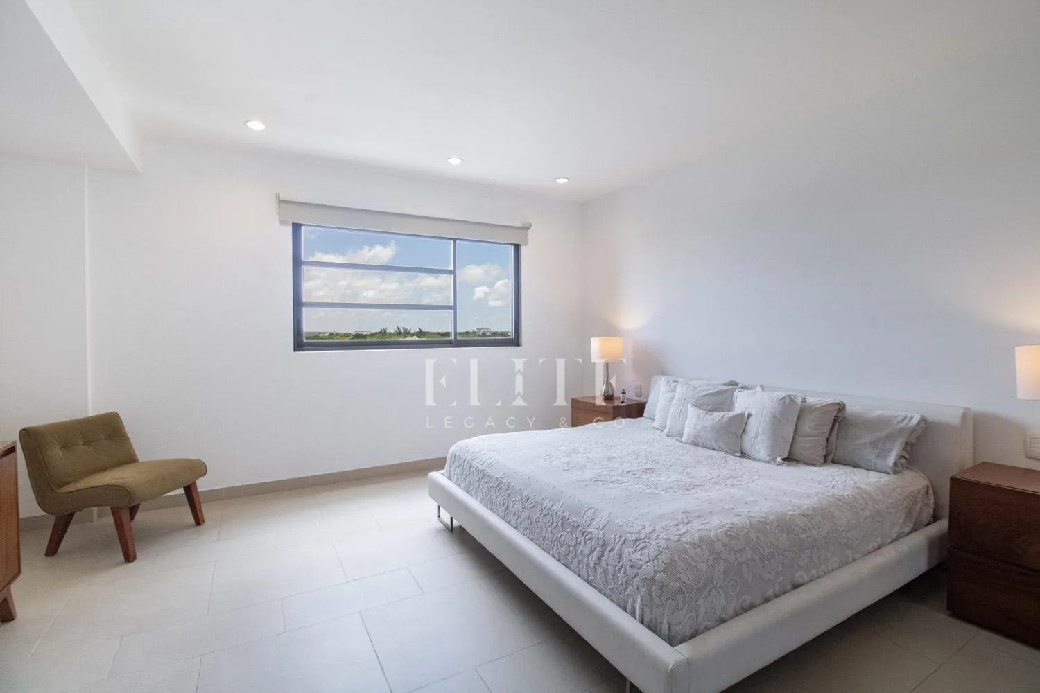 The first level of the property includes a living and dining room, a fully equipped integral kitchen, and a spacious terrace with views of the sea, golf course, and Puerto Cancún. It has one bathroom, a laundry room, a service exit at the back, and a fully equipped primary bedroom.
