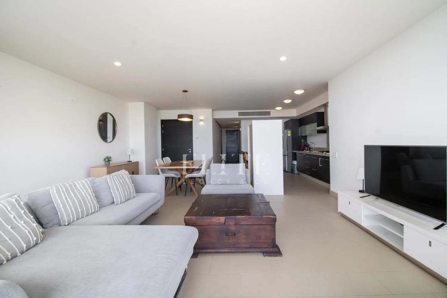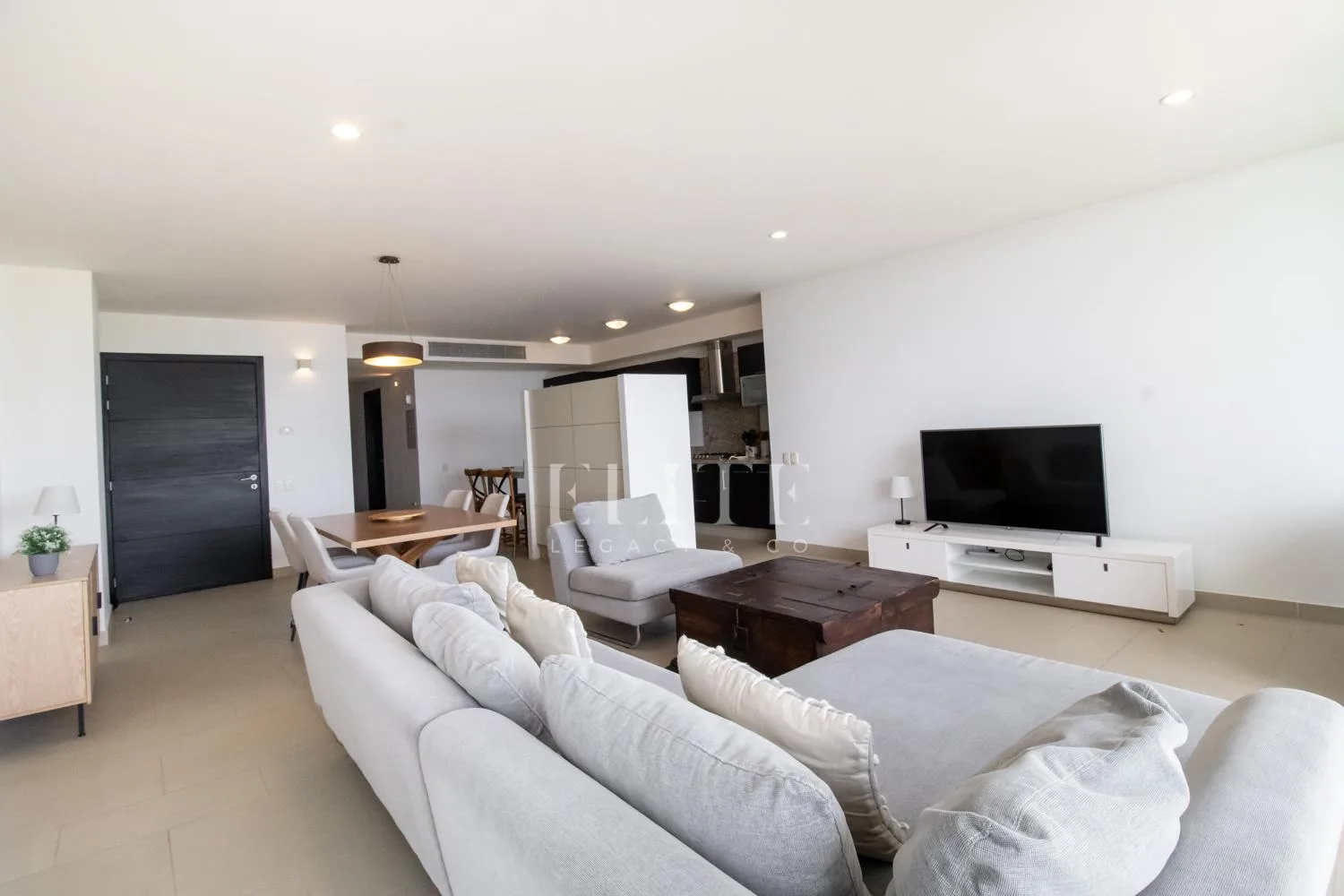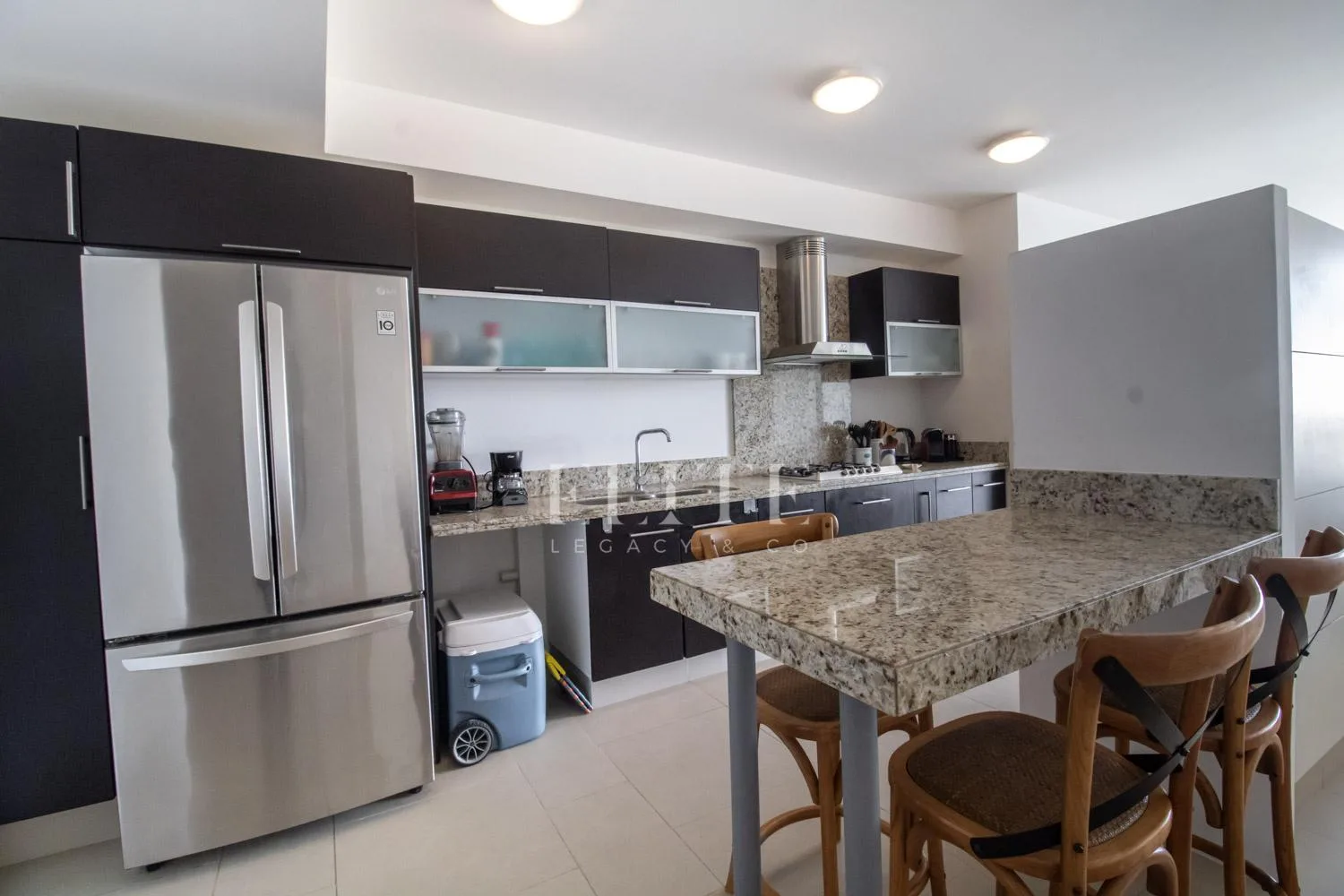 The first level of the property includes a living and dining room, a fully equipped integral kitchen, and a spacious terrace with views of the sea, golf course, and Puerto Cancún. It has one bathroom, a laundry room, a service exit at the back, and a fully equipped primary bedroom.