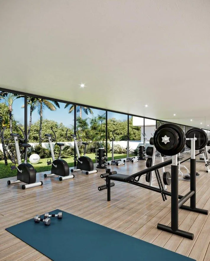 The building provides resort-style swimming pools and a rooftop social area with open views. Additional amenities include a paddle court and dedicated spaces for relaxation and socializing, supporting an active lifestyle.