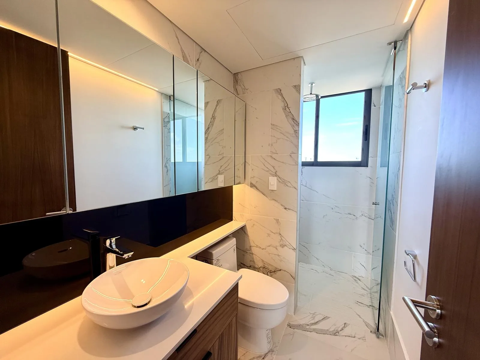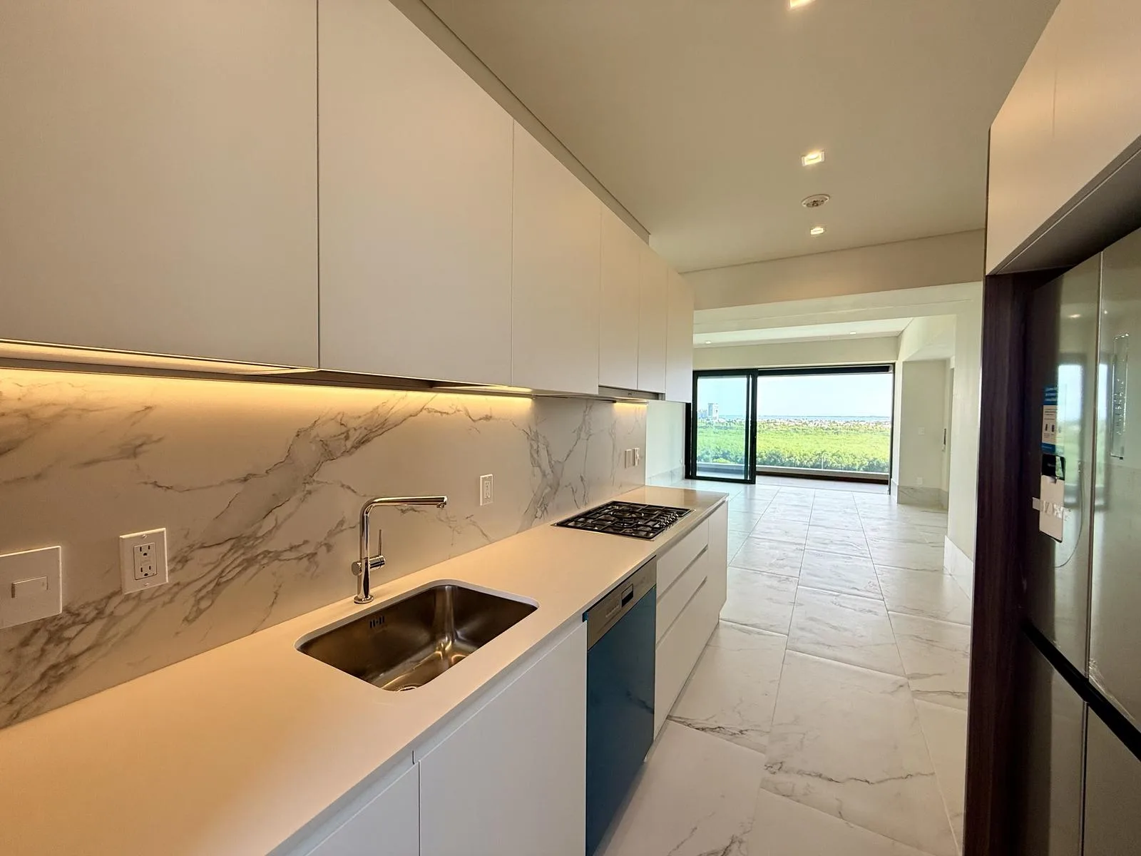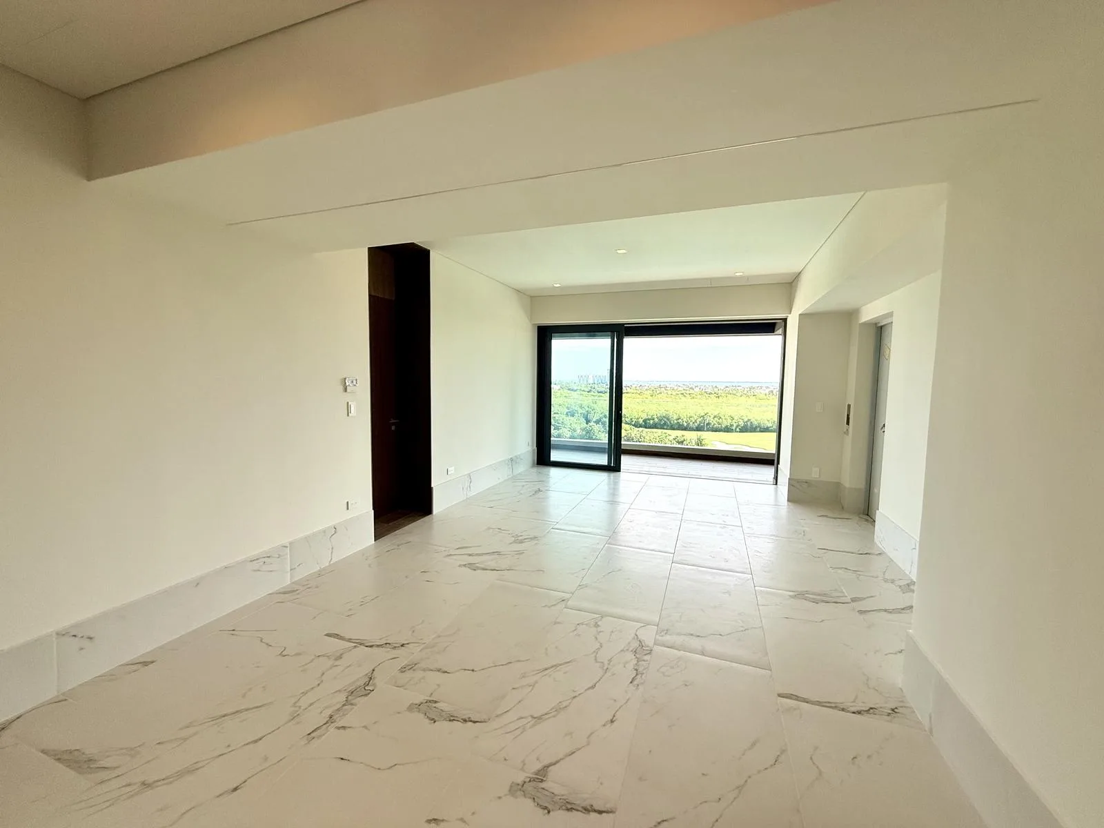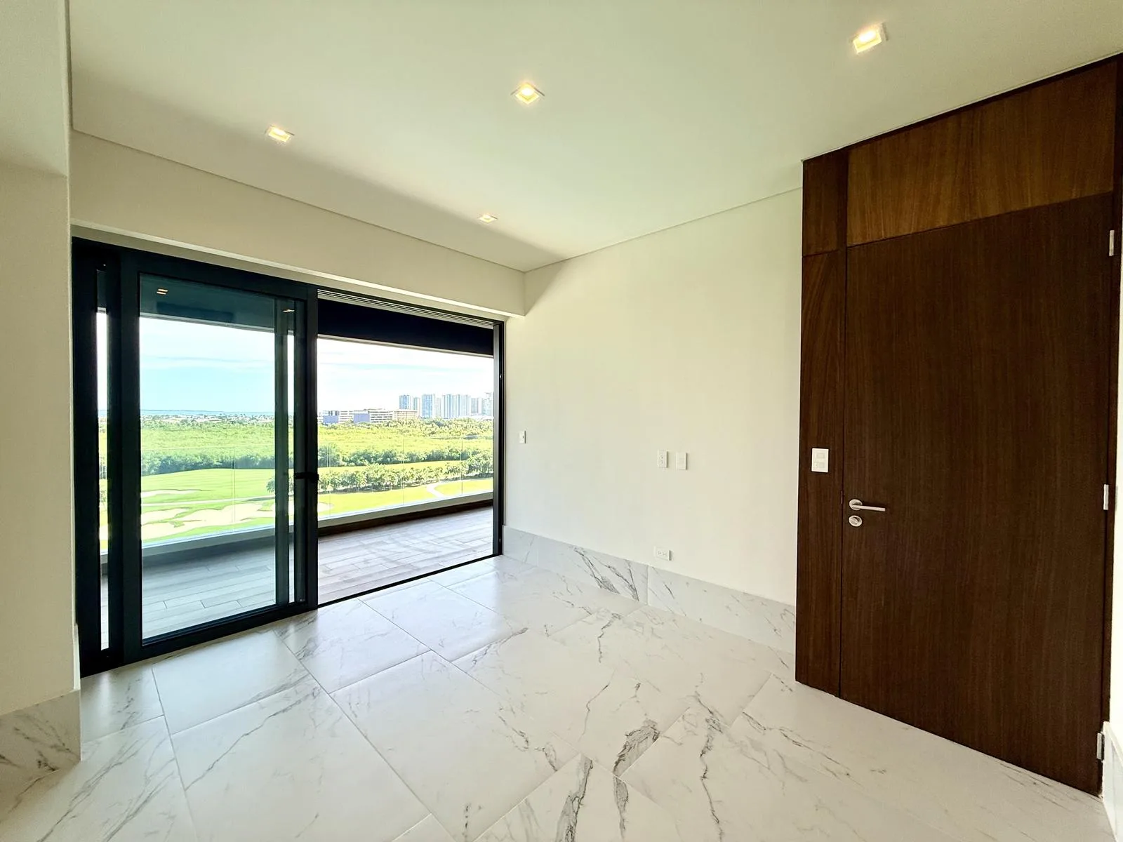 The apartment is unfurnished and includes high-end finishes. It has a white Italian kitchen equipped with a stove, extractor, refrigerator, oven, and microwave, along with a washer-dryer. A very spacious terrace offers front and open views of the golf course and the Caribbean Sea, accessible from both the living room and the master bedroom. The secondary bedroom includes a balcony with a city view.