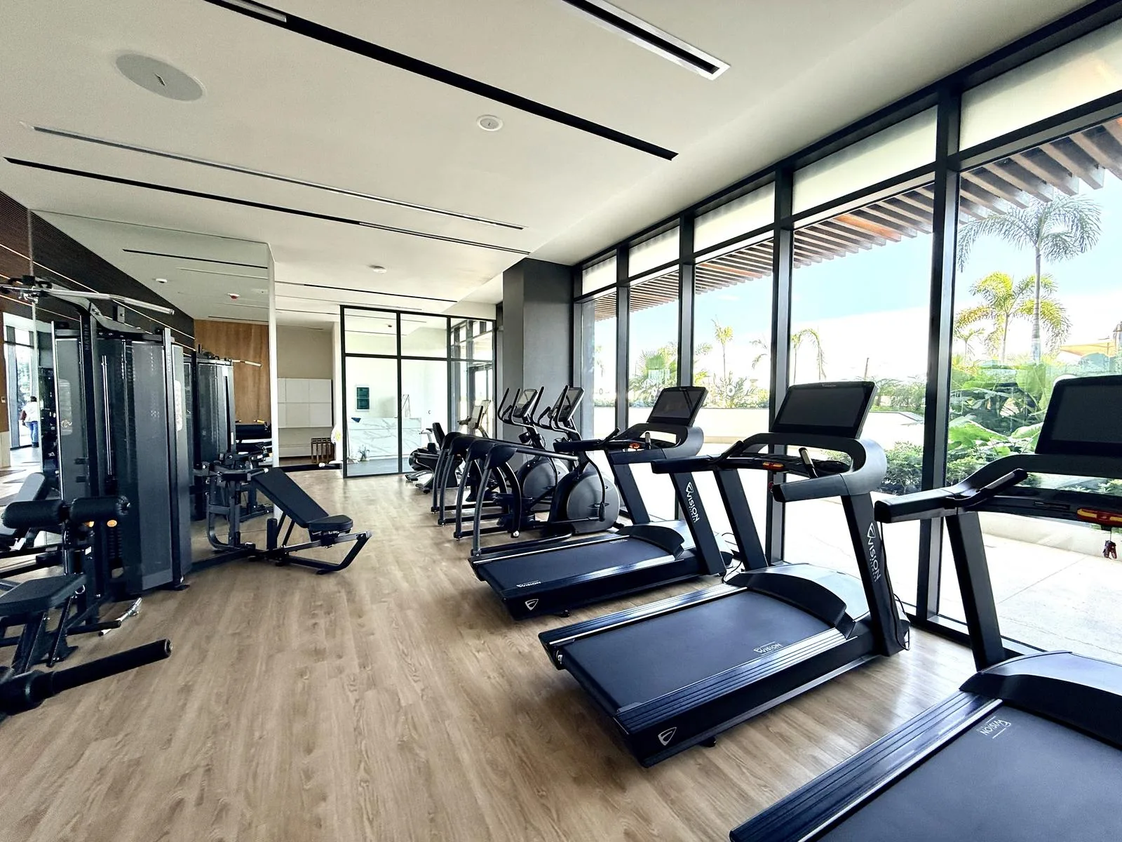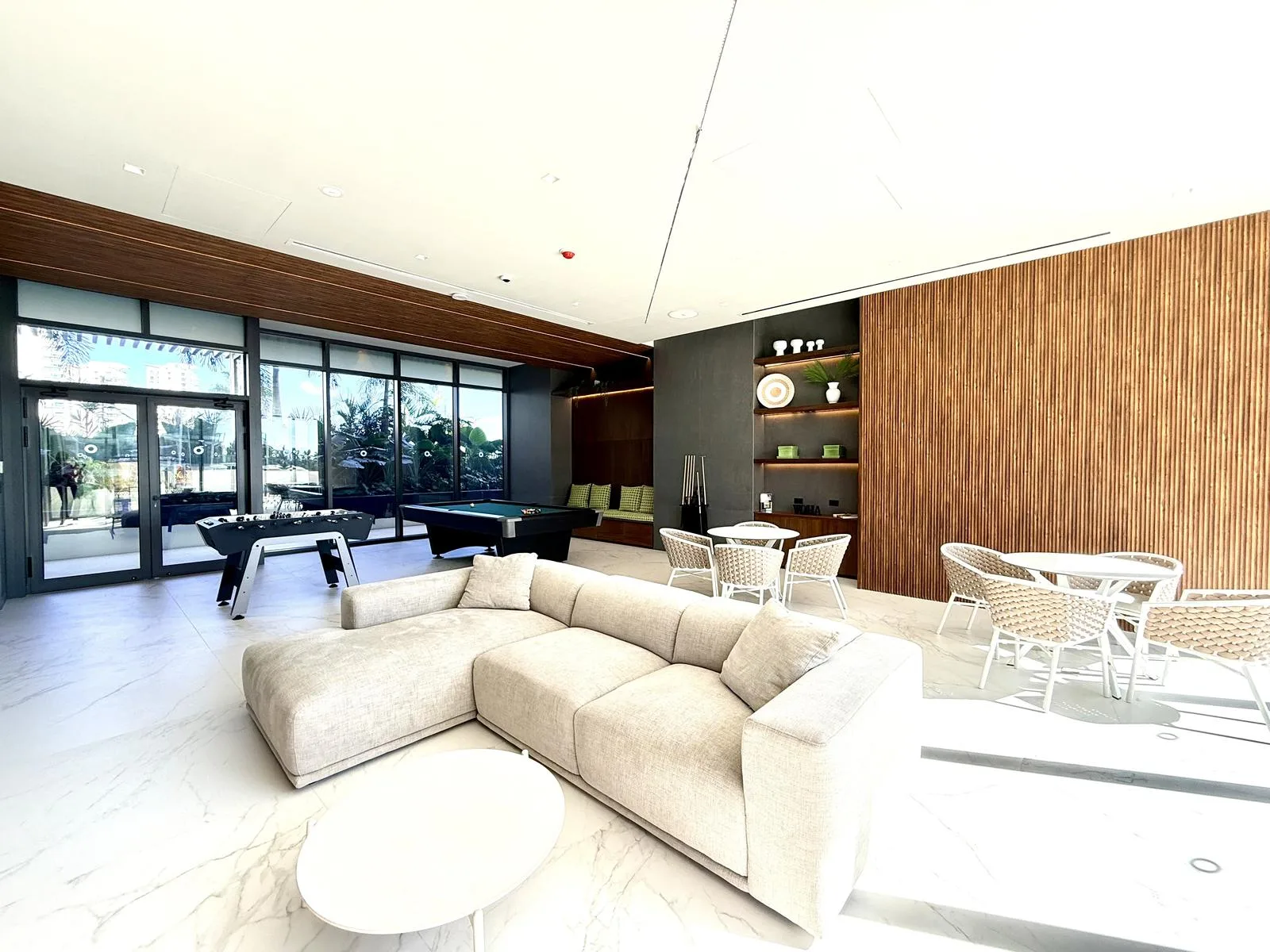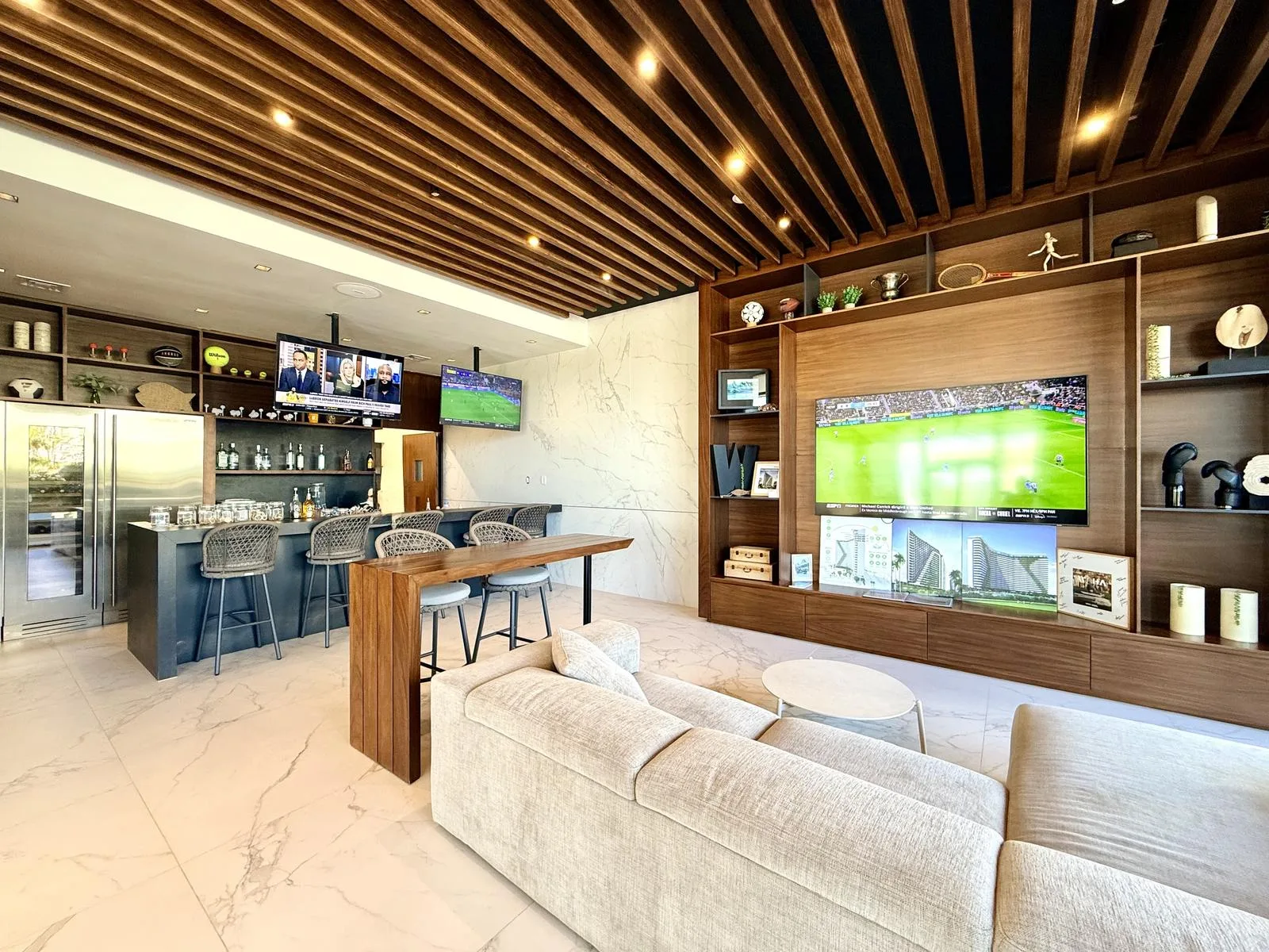 Building amenities include 24-hour security, an infinity pool, jacuzzis, a spa, an equipped gym, a sports bar, coworking spaces, a game room, a multi-purpose room, and terraces with views.