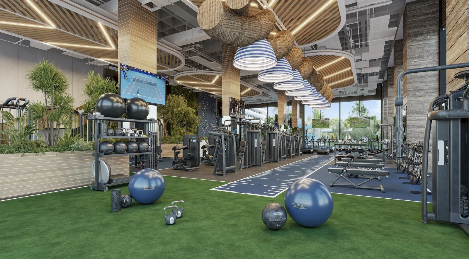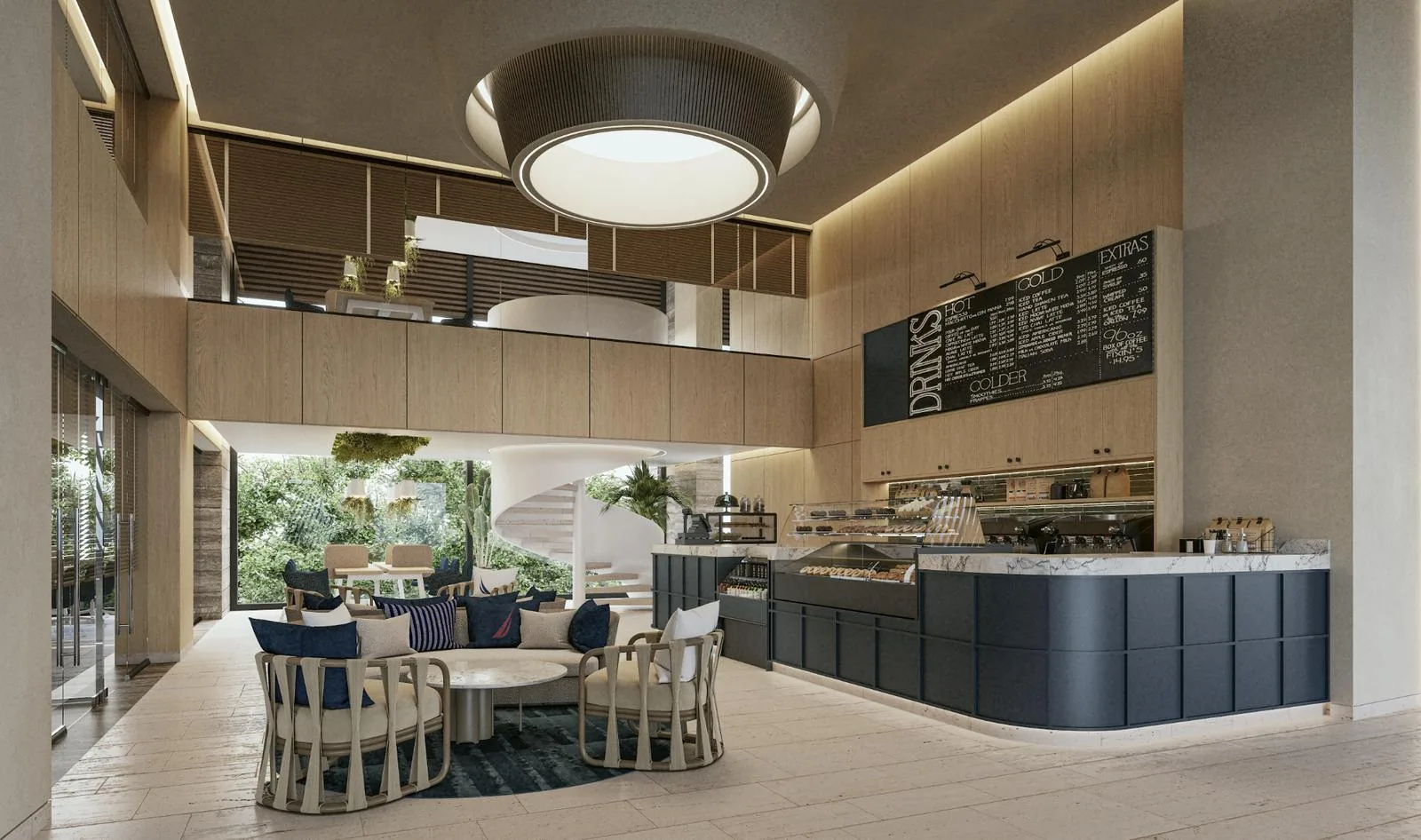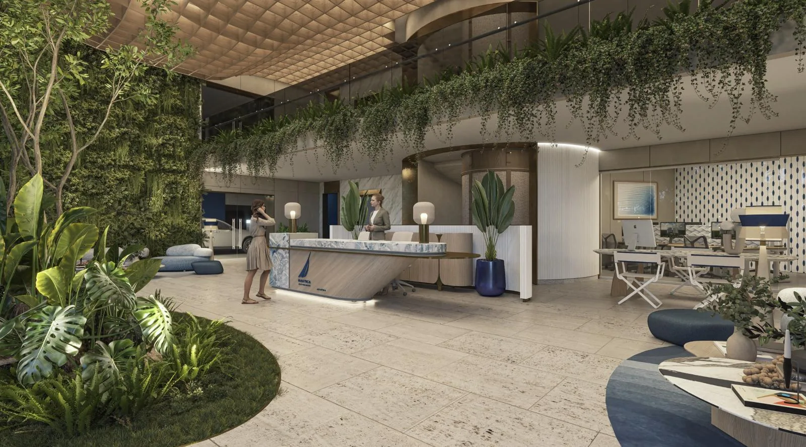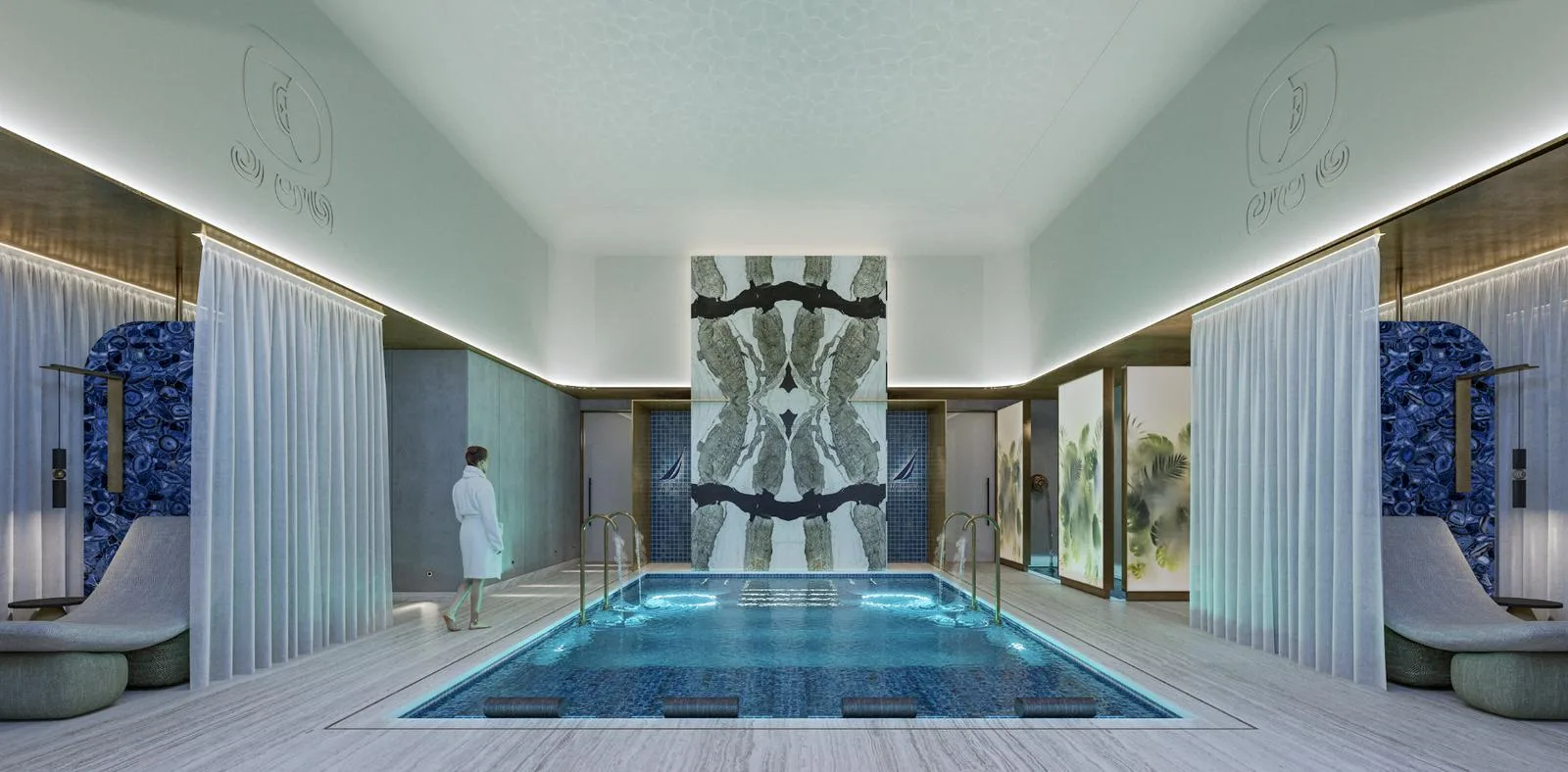 Amenities include a wellness center, sports area, private beach club in Costa Mujeres with transportation services, family pool, kids pool, splash zone, aqua slide, hammock bay, spa, beauty salon, barber shop, pet zone, sports bar, sport center, padel court, tennis court, activity hub, mini golf, indoor oasis, playground, piano bar, bistro, marina ballroom, marina deck, cinema lounge, rock climbing wall, arcade, teens club, compass market, coffee corner, co-working space, music hall, media room, kids club, zen studio, fitness center, rooftop lounges, and an infinity pool with bar.