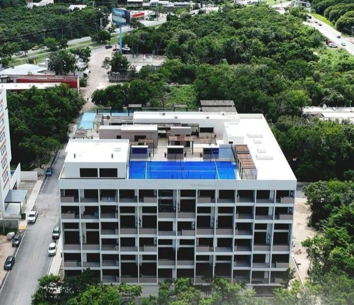 The development offers a swimming pool, a fully equipped gym, a paddle tennis court, a multi-purpose room, a coworking area, a children's playroom, covered parking, a security booth, and a private walkway.