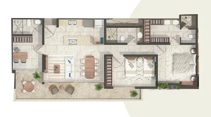 The layout features two spacious bedrooms with excellent natural light and two full bathrooms with contemporary finishes. It includes a service room, an open-design living room, and a dining room that connects to a private terrace. The property also has a modern integrated kitchen, a laundry area, air conditioning, and two parking spaces.