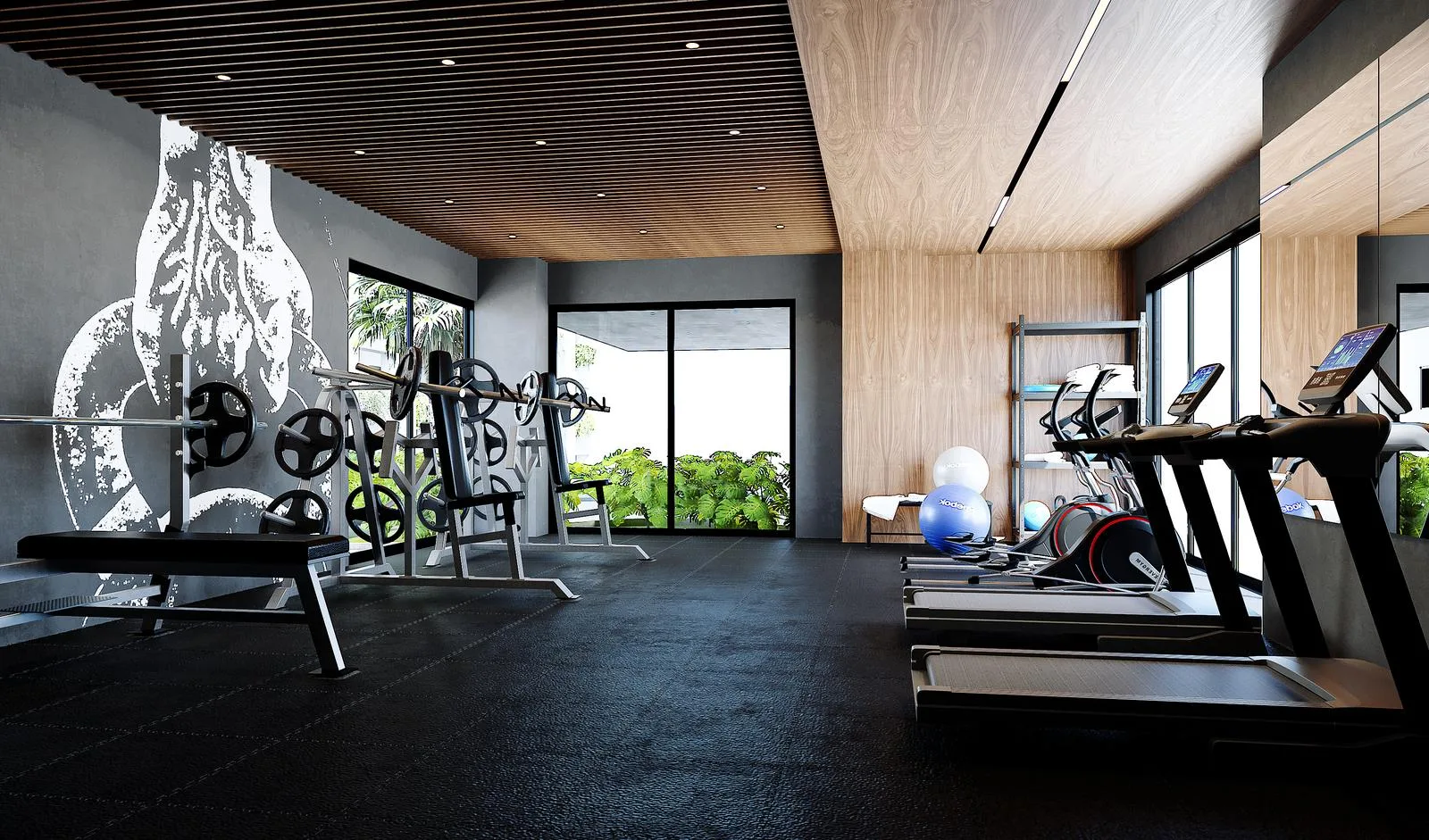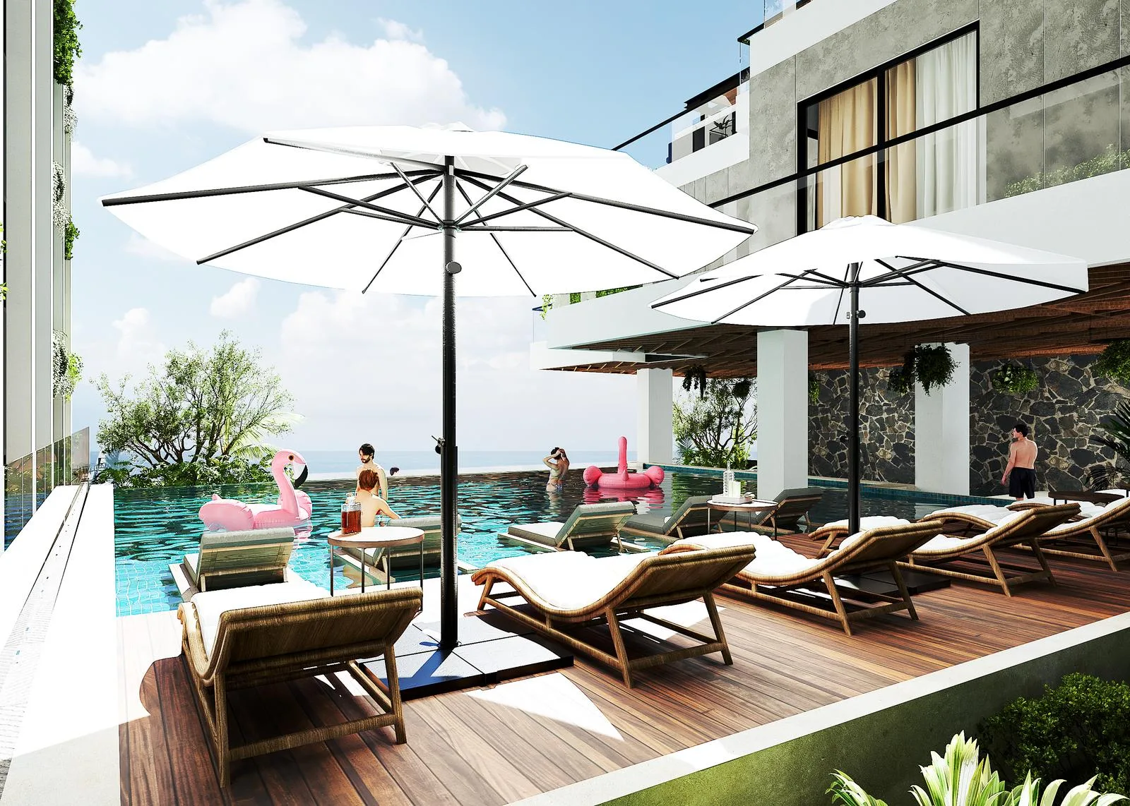 Amenities include a lobby, pool, sun decks, a gym, sun loungers, a bar, a jacuzzi area, fire pits, and a social area.