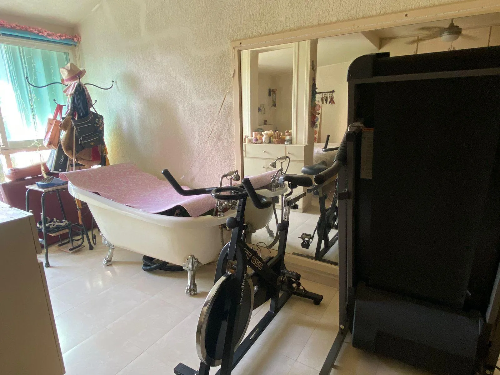 The property includes a fully equipped kitchen and a living-dining room with air conditioning and ceiling fans. It is fitted with anti-cyclone curtains and has a laundry area. The unit has been remodeled for improved functionality and can be sold furnished or unfurnished. It includes two parking spaces.