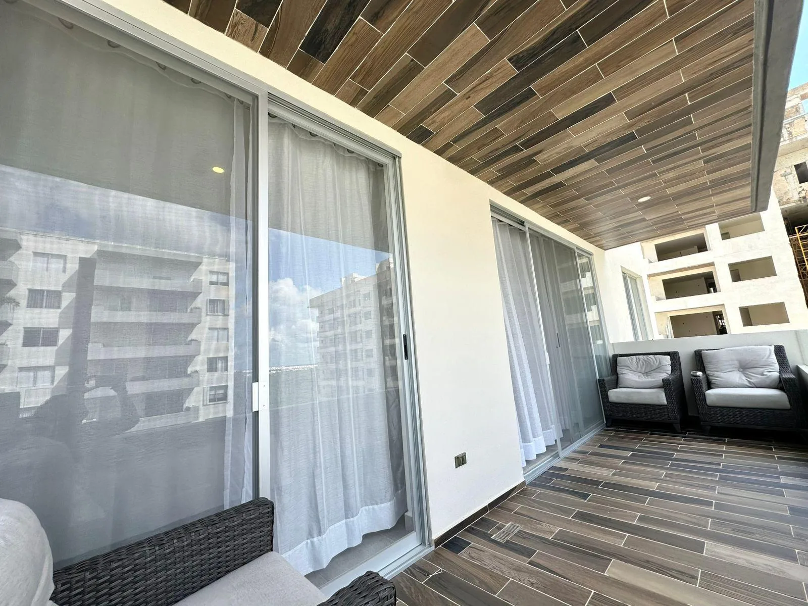 The unit features three bedrooms, each equipped with air conditioning and closets. There are two and a half full bathrooms. The spacious living and dining room area includes air conditioning. The kitchen has a granite island and an open-concept design. The property also includes a laundry area, a linen closet, and a large terrace with views of the building amenities. It comes with two parking spaces and a storage unit.