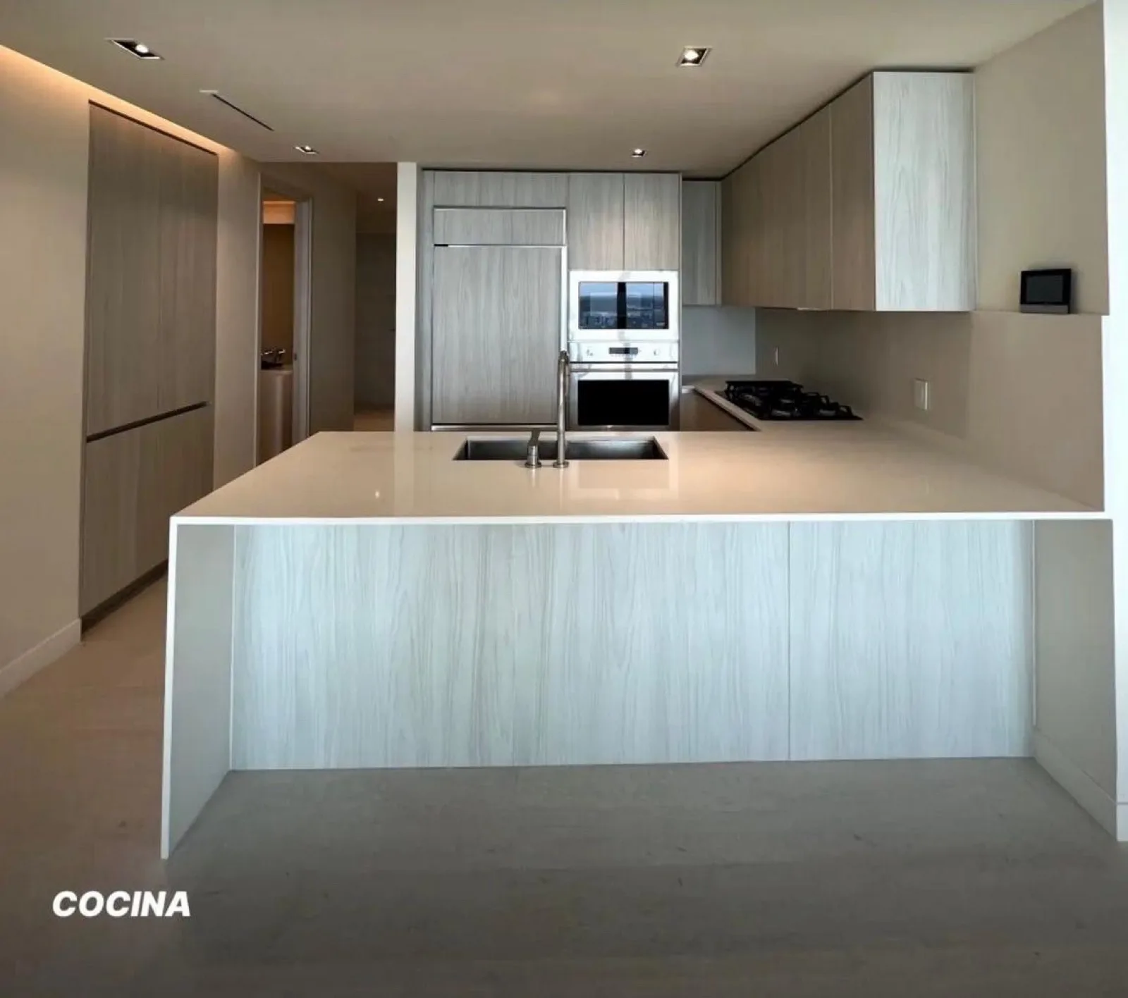 Two covered parking spaces are included. The building features a comprehensive suite of amenities including a spa, a gym, and an infinity pool. Additional facilities consist of a kids' workshop, a pool lounge, and a padel court.