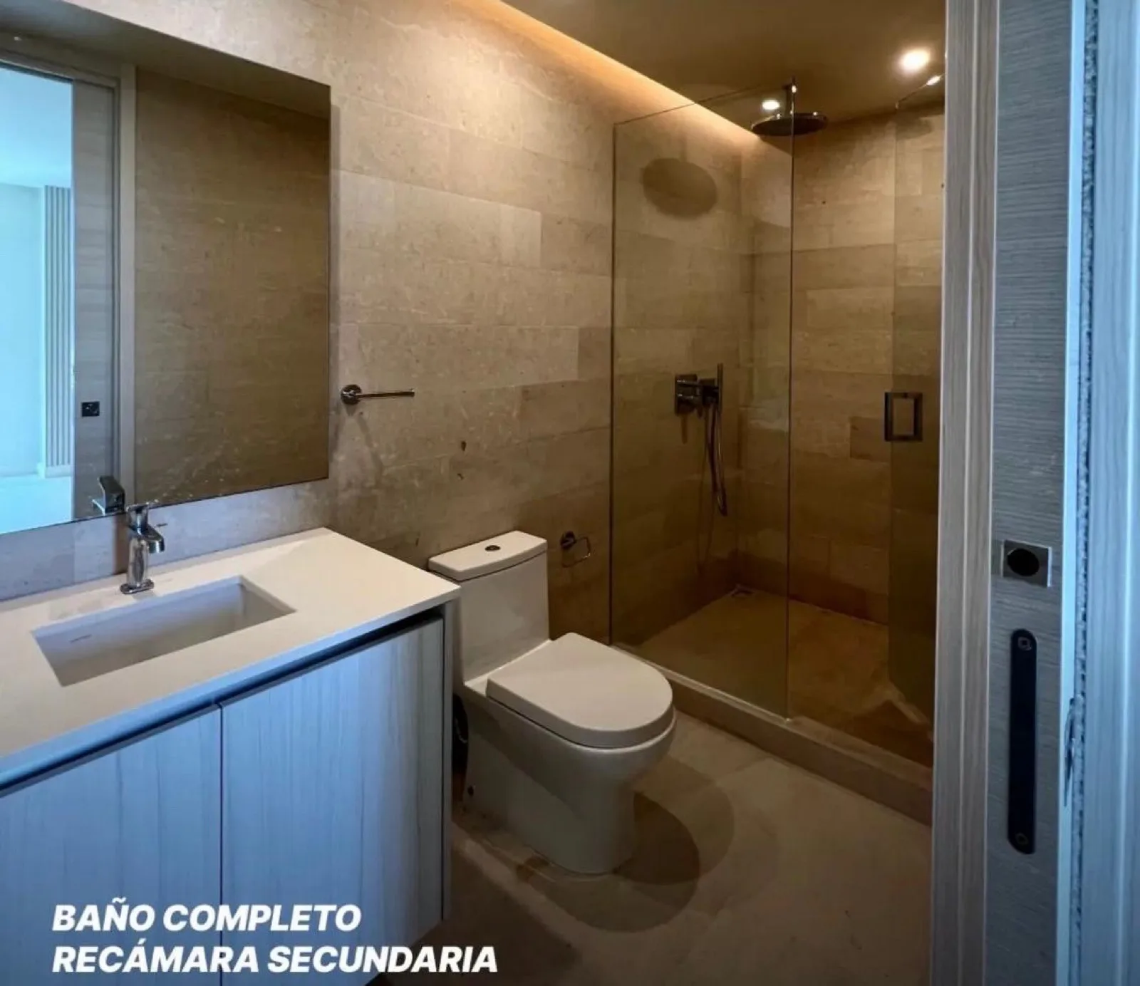 A terrace provides views of the sea. There are three bedrooms, each with a private bathroom. A guest half-bathroom is also present. The unit includes a laundry room and a separate service room with a full bathroom.