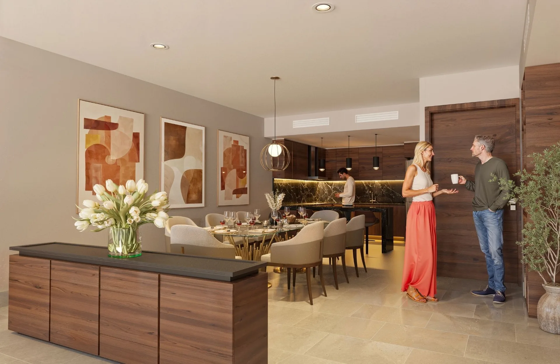 The apartment includes an integrated kitchen with a bar and luxury finishes. It offers smart storage space, bright bedrooms, contemporary bathrooms, and an efficient layout.