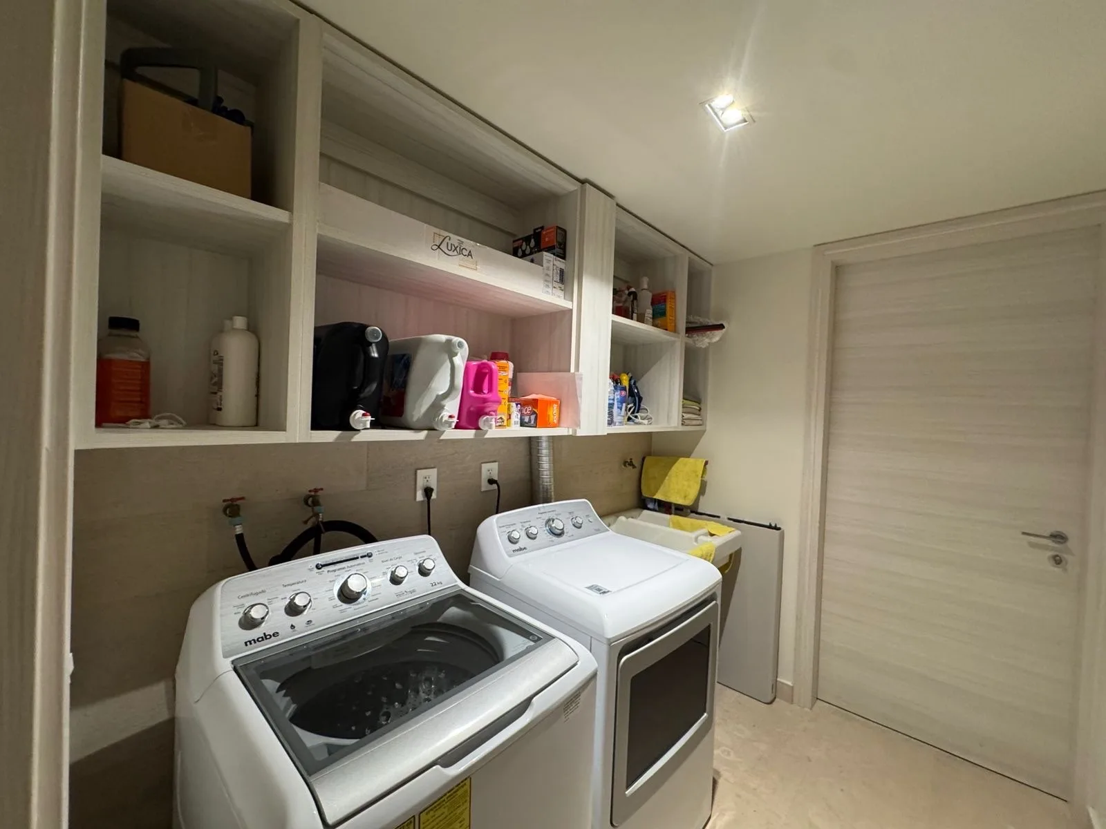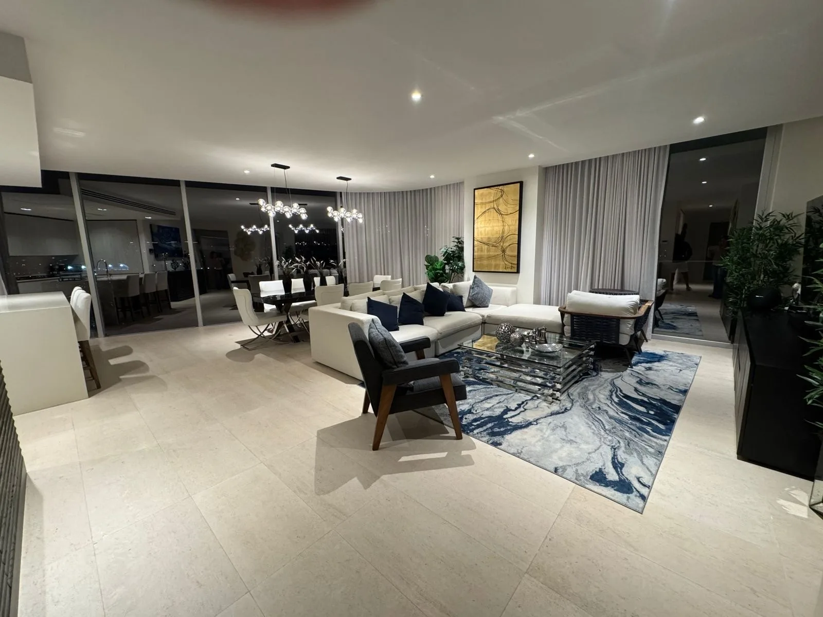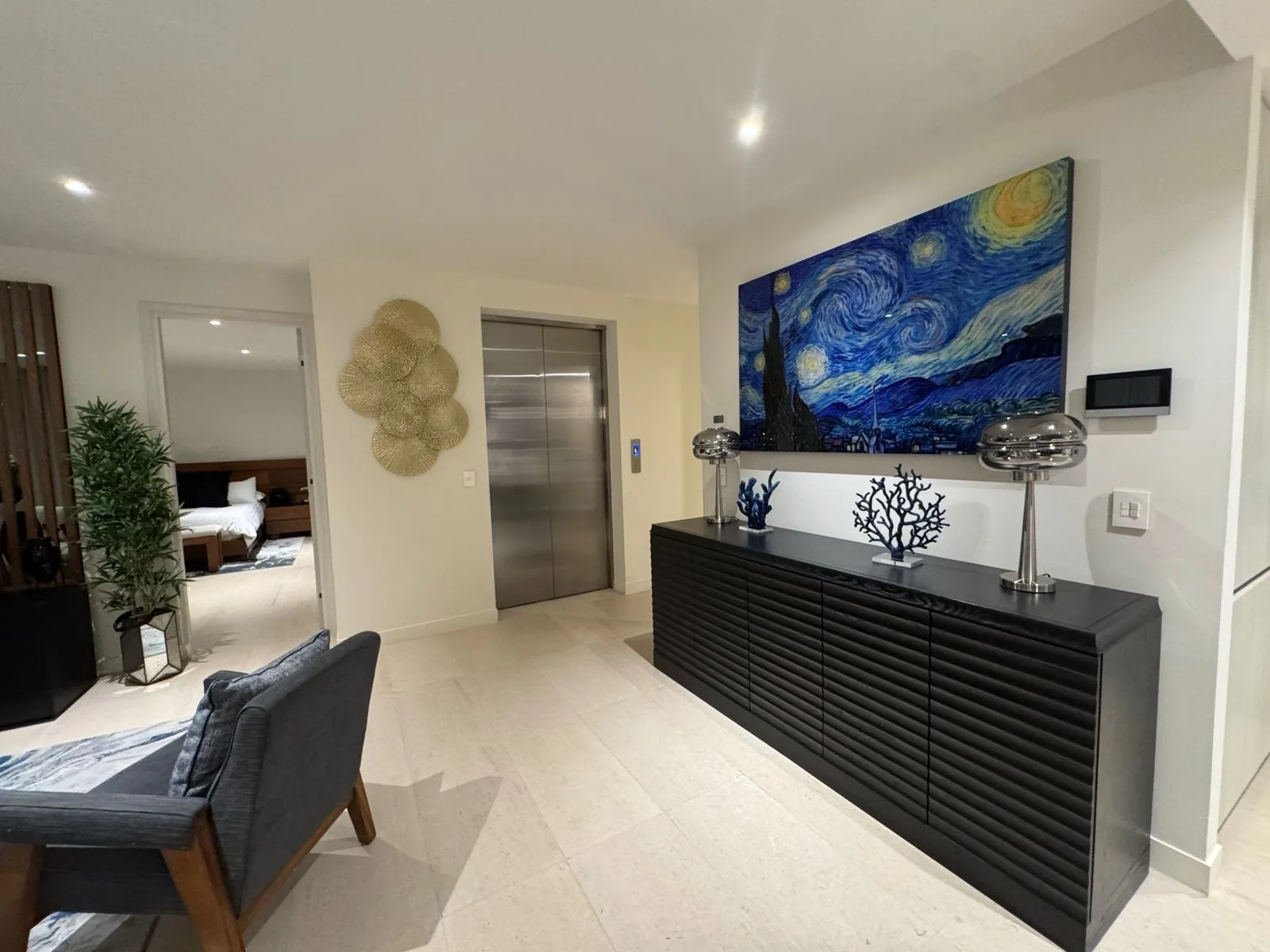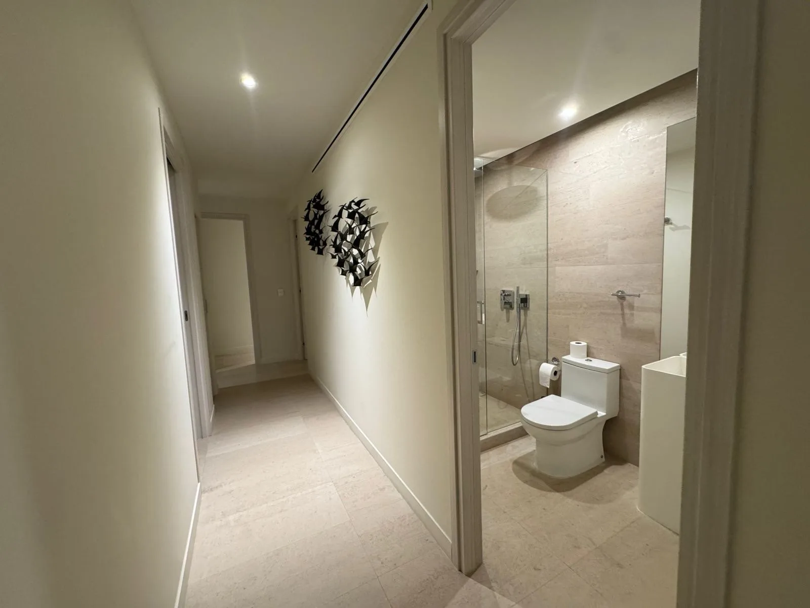 A terrace offers panoramic sea views. The residence features three bedrooms, each with an ensuite bathroom, and a half guest bathroom.