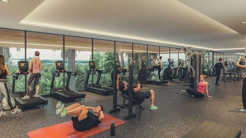 The development features a comprehensive set of amenities. These include a private marina with a boarding dock, a wellness center with a massage area and ice bath, infinity pools overlooking the water, a kids club, family social areas, a state-of-the-art fitness center, a lobby with concierge and valet parking, a car wash service, electric vehicle charging stations, and 24/7 security with advanced access control.
