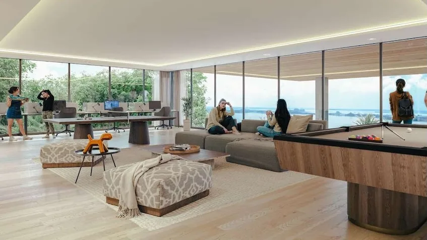 The architecture blends soft geometries and natural textures, creating an atmosphere of serenity. The design features a dual-view location with unique vistas of both the sea and the lagoon, and is focused on privacy and exclusivity for a nautical lifestyle.