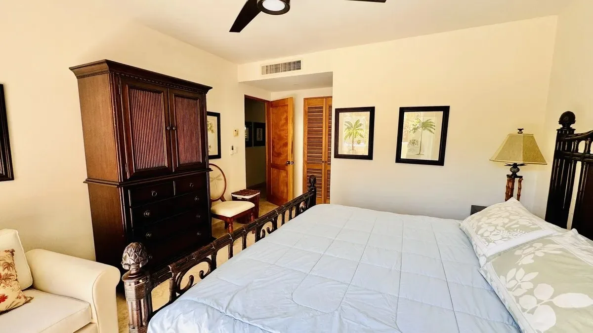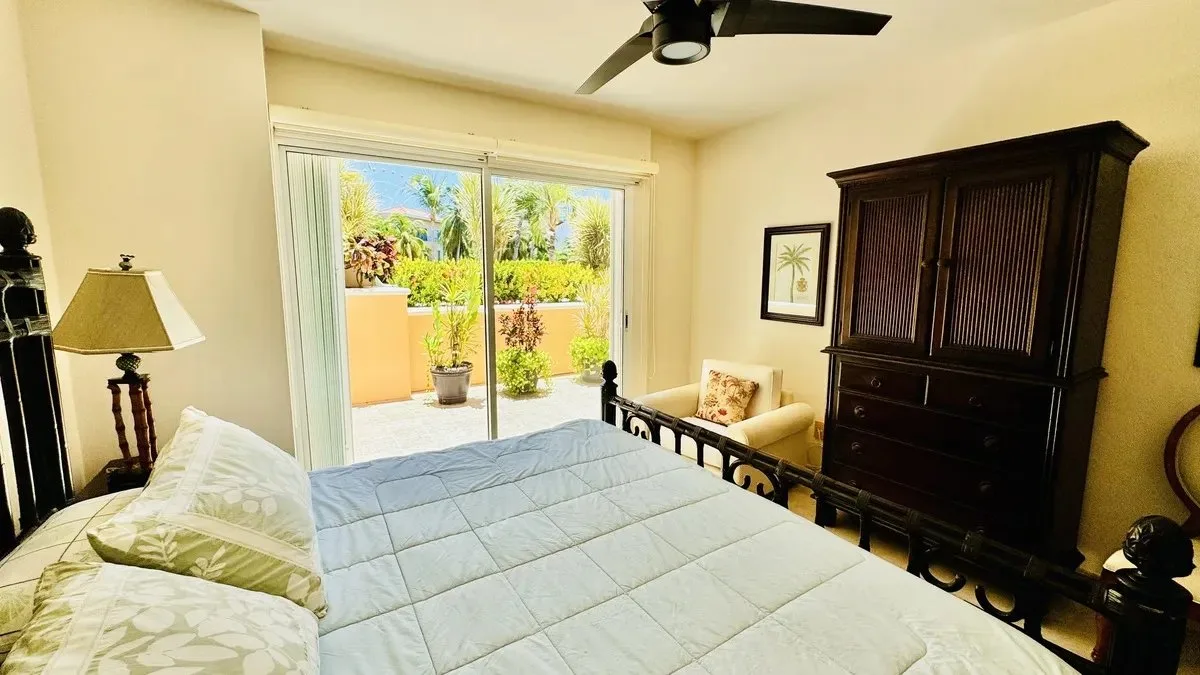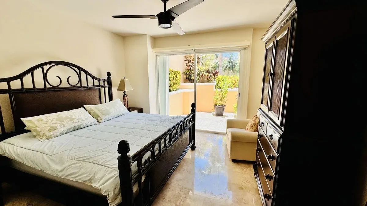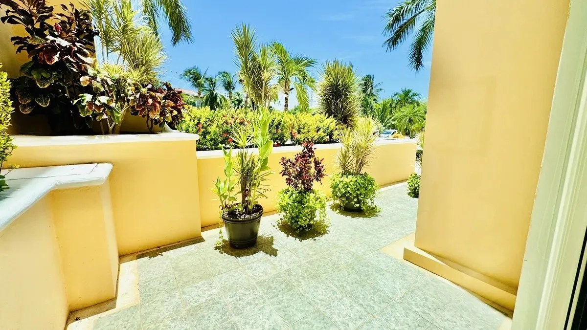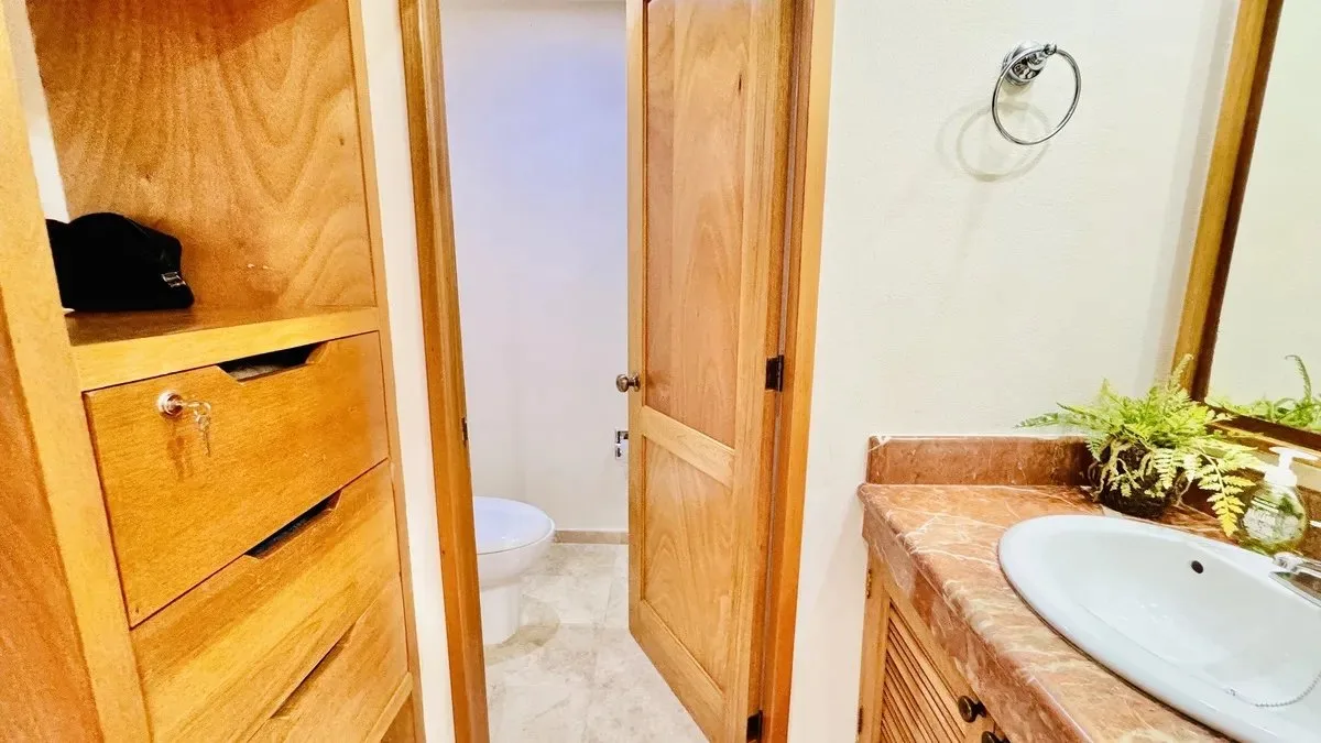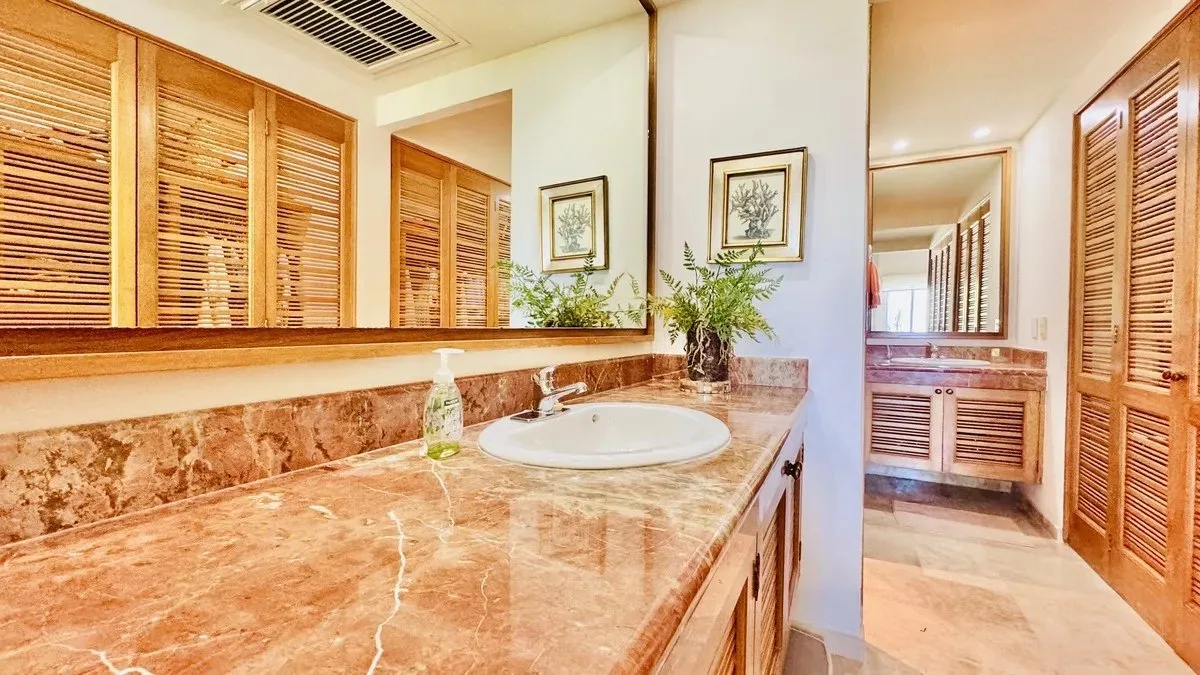 The residence spans 252 square meters of carefully designed space. It features a private boat slip capable of accommodating yachts up to 60 feet in length. The unit includes three spacious bedrooms, each with its own bathroom and ample closet space. The primary bedroom offers views of both the garden and the lagoon.