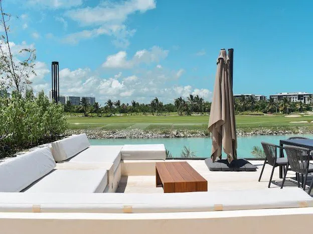The extensive list of shared amenities includes a marina, an adult lounge, a sundeck, a playroom, a yoga room, gardens, a gym, a spa, palapas, a sand volleyball court, a padel court, a restaurant, three swimming pools, a swimming lane, a bar, and a business center.