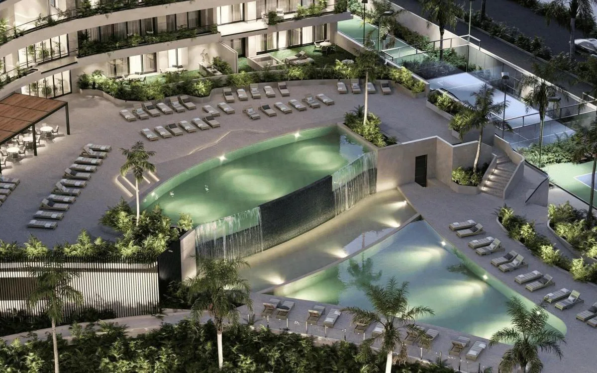 The residential complex provides a comprehensive suite of amenities, including a private marina suitable for boats, sailboats, or wave runners. There is a family swimming pool and an adult swimming pool, both with lounge areas. Recreational facilities include a children's club and play zone, a barbecue area with a fire pit, and a pet park. Additional amenities consist of a lounge bar and pool bar with panoramic views, a spa, a fully-equipped gym, a paddle tennis court, and a jacuzzi. The complex has 24-hour security with controlled access.