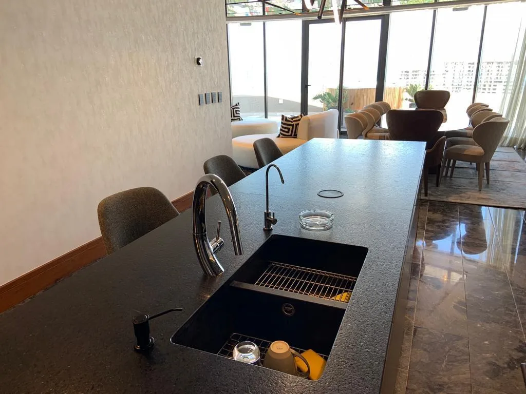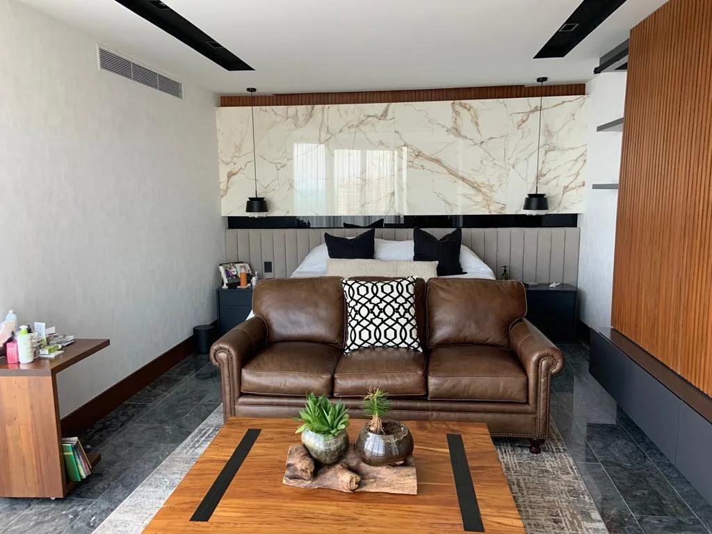 A primary feature is the panoramic terrace spanning 96. 43 square meters, which includes a private jacuzzi and offers privileged views. The unit includes premium fixtures and furnishings such as electric curtains, an integrated interior and exterior audio system, a lighting and air conditioning control system, a refrigerator and wine cooler, a washer and dryer, and a mirror television with a leather frame.