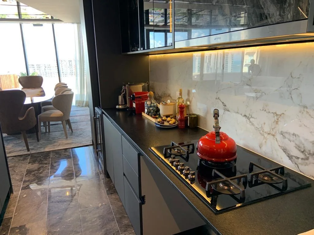 This luxury residential apartment is located on the 17th floor and features a total area of 356 square meters. Constructed in 2022, the property includes three bedrooms, three full bathrooms, one half bathroom, and three parking spaces. The unit is fully furnished, equipped, and decorated.