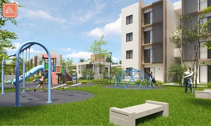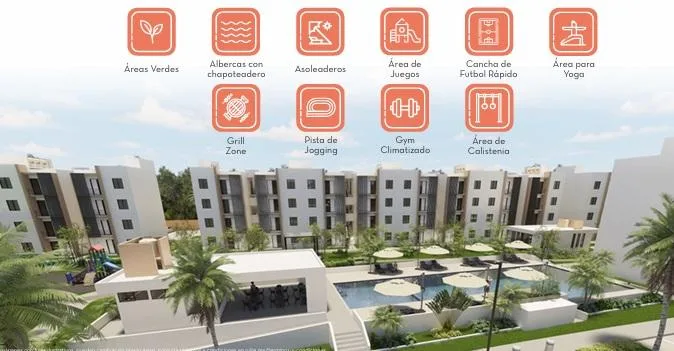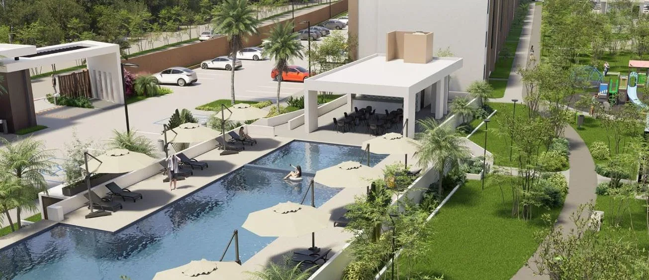 The residential complex offers extensive amenities including pools with a splash pad, sun decks, a fast soccer field, a barbecue area, a jogging track, a calisthenics area, a yoga space, a climate-controlled gym, and a children's play area.