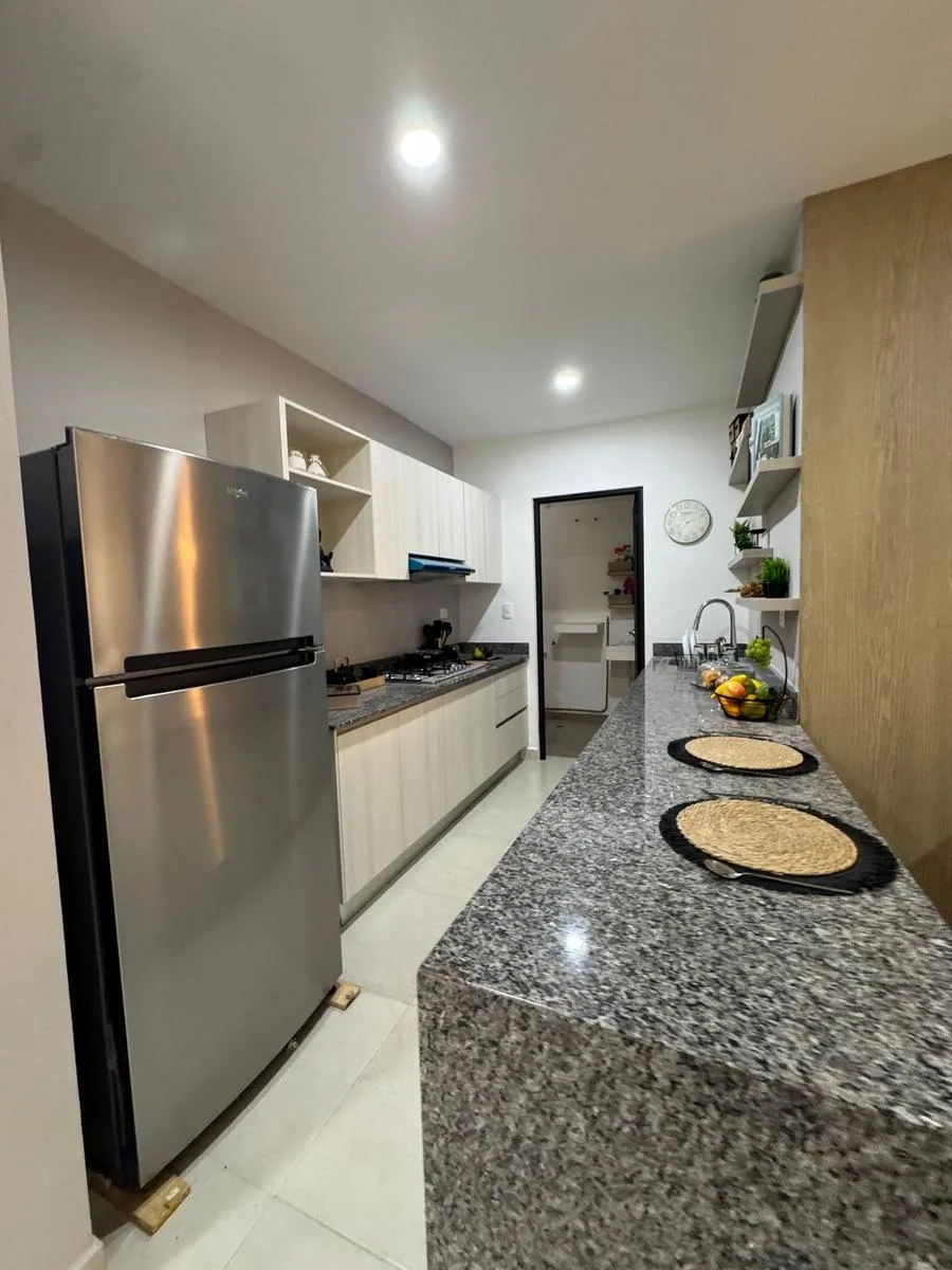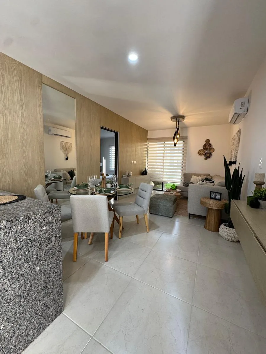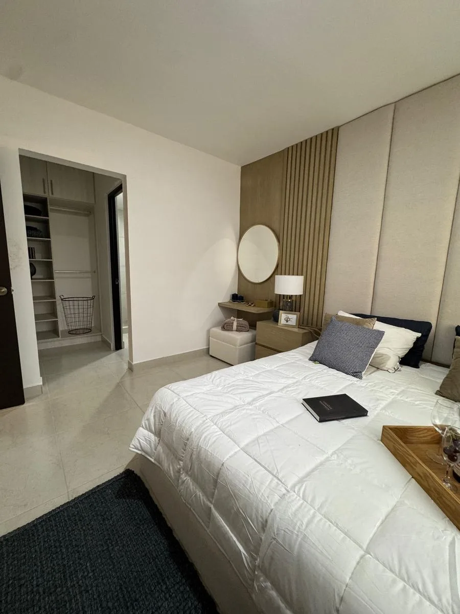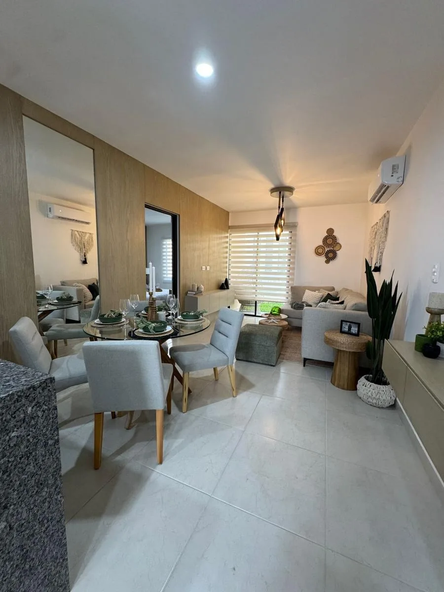 This modern apartment in Cancún features a functional layout with a spacious living-dining room, an equipped kitchen, a service area, two bedrooms, and two full bathrooms. The primary bedroom includes a full bathroom and space for a walk-in closet.