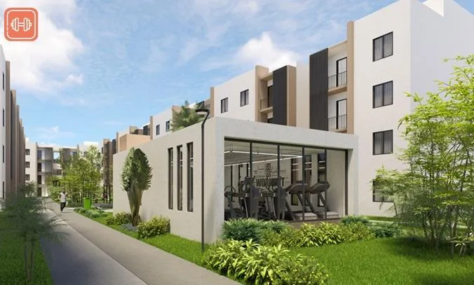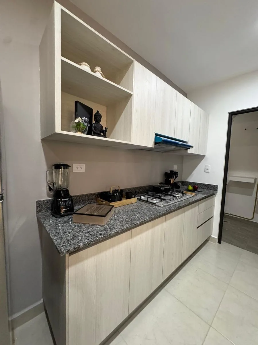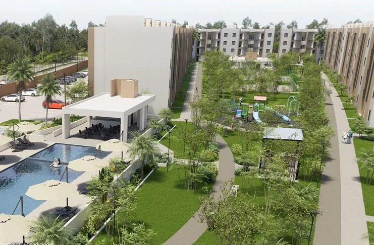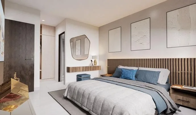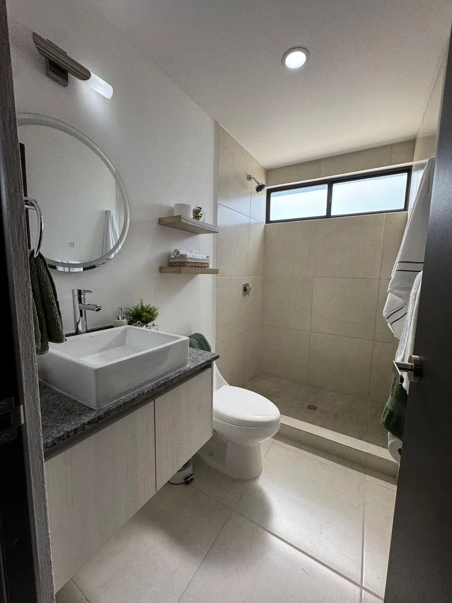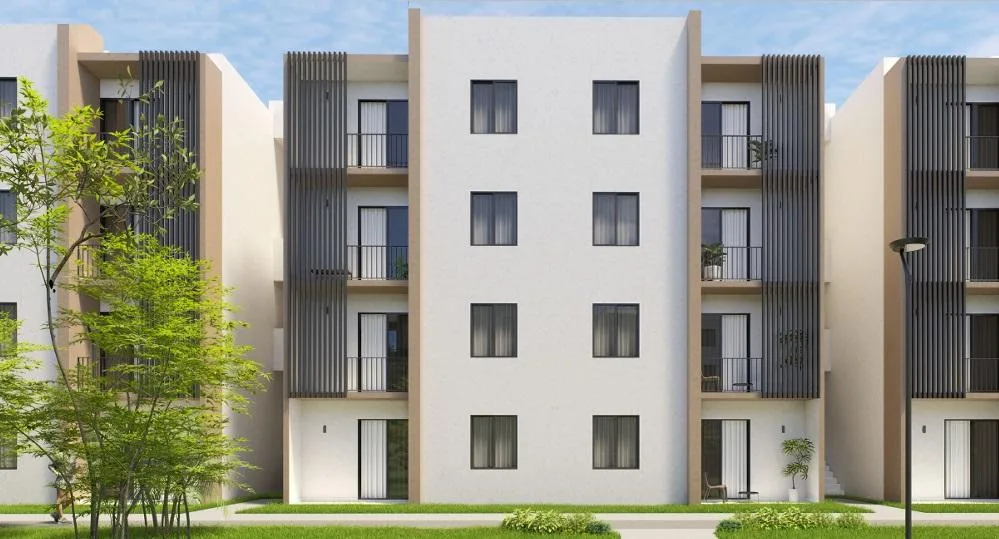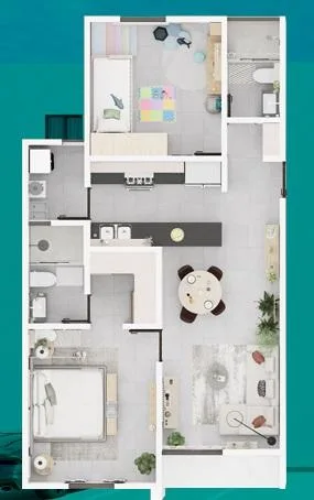 This modern apartment in Cancún features a functional layout with a spacious living-dining room, an equipped kitchen, a service area, two bedrooms, and two full bathrooms. The primary bedroom includes a full bathroom and space for a walk-in closet.