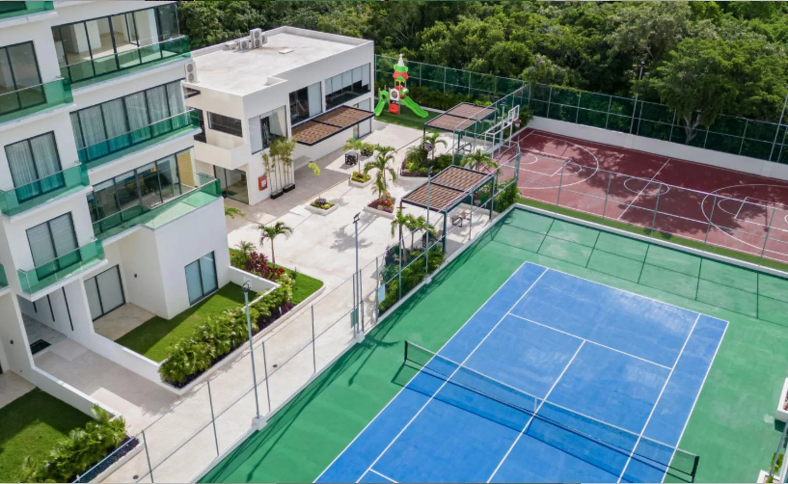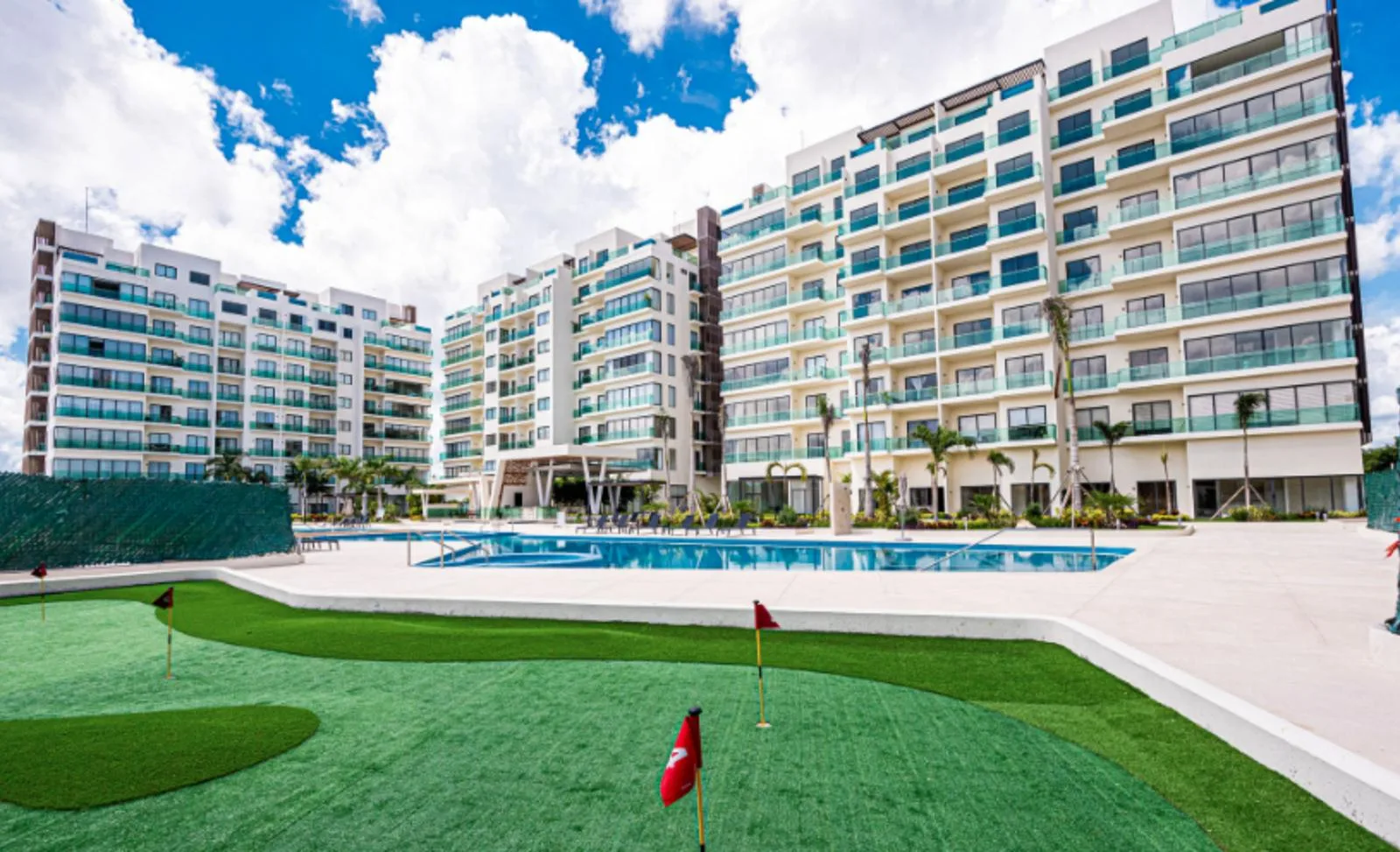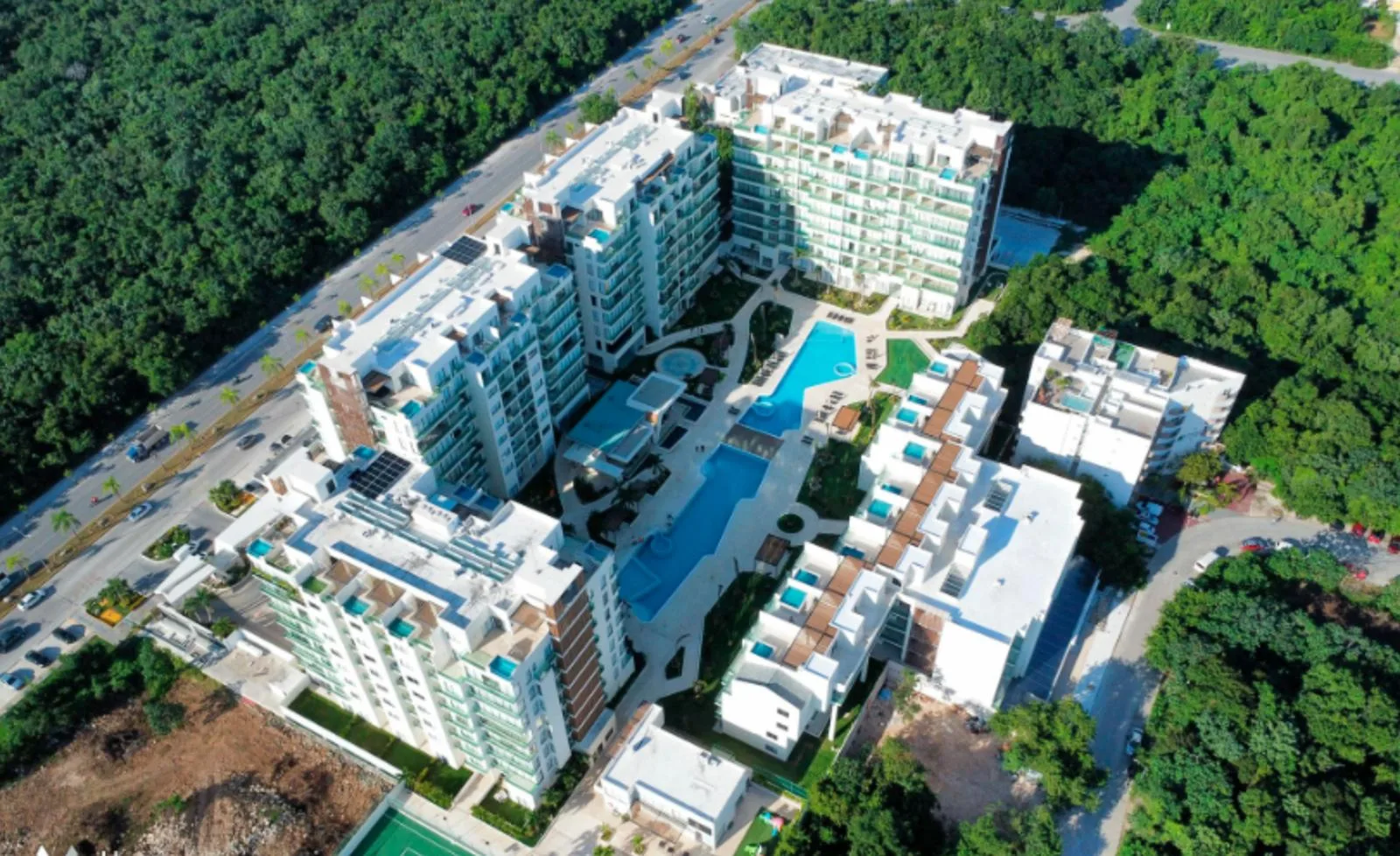 The location offers excellent connectivity. It is approximately five minutes from the Tren Maya station, ten minutes from the Cancún International Airport, and fifteen minutes from the Hotel Zone.